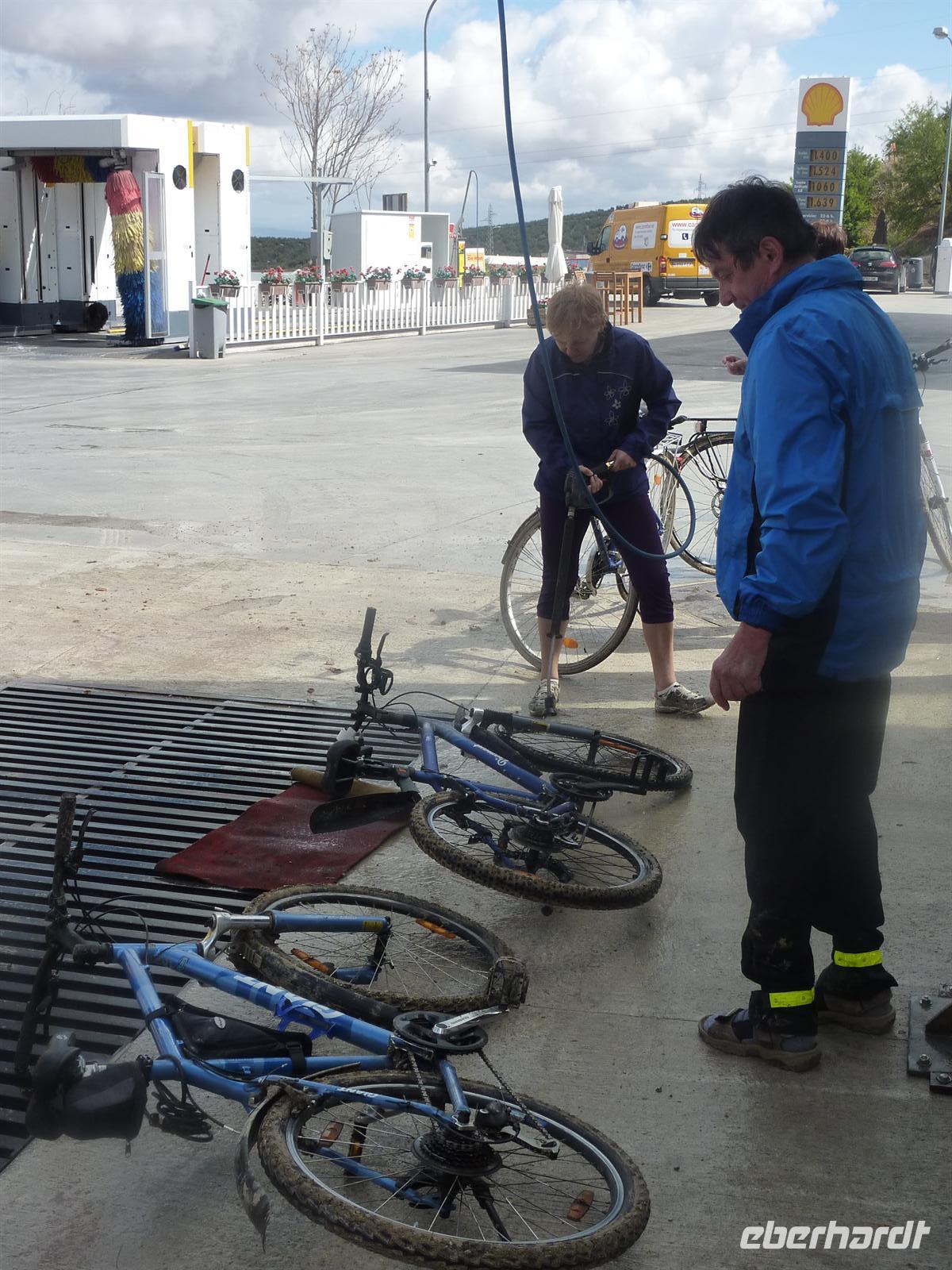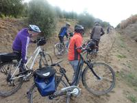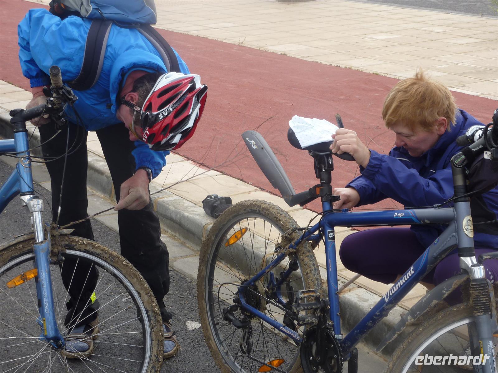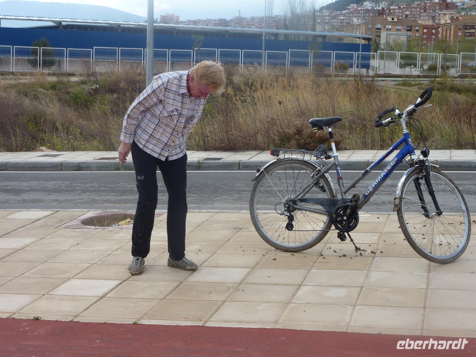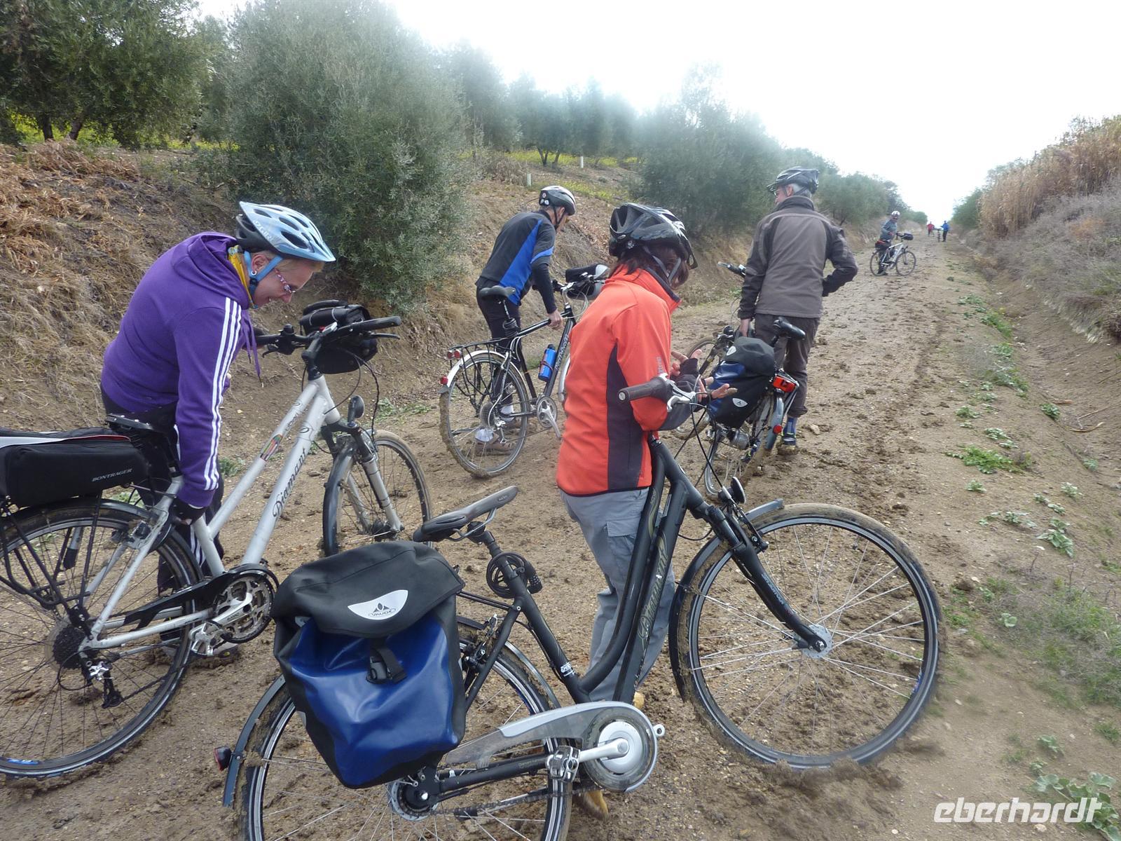 Nach dem Frühstück begaben wir uns mit dem Bus nach Jaén, dem Ausgangspunkt für unsere heutige Radtour. Vorher hatten Nicole und Jens noch den Wind geprüft, um uns ggf. vor einer Gegenwindstrecke zu schützen. Es war nahezu windstill, also beste Voraussetzungen für eine erlebnisreiche Tour. Und das sollte Sie auch werden! Schon ungefähr 7 km nach dem Beginn ereilte uns ein so nicht vorhersehbares Ereignis. Die Trasse auf der wir fuhren, sah nicht anders aus, als auch die vorangegangenen Kilometer. Doch plötzlich verfing sich Schlamm zwischen den Reifen und den Schutzblechen der Fahrräder und nichts ging mehr. Die obere Schicht des Weges war durch den Regen der vergangenen Nächte aufgeweicht. Und dieses Kalk- Lehmgemisch hielt die Räder nun in fester Umklammerung. Der Versuch, die Räder Huckepack über die Problemstelle zu befördern wurde schnell aufgegeben, da ein entgegen kommender Radfahrer die Länge dieser Stelle mit 4km angab. Was nun? So schönes Wetter und nun nicht Rad fahren? Zunächst wurden die Räder erst einmal wieder halbwegs rollfähig gemacht und mit Stöcken und Händen der Schlamm zwischen Schutzblech und Reifen entfernt. So gut es jedenfalls ging. Dann hieß es umkehren und zum Ausgangspunkt zurück fahren. Nicole beorderte den Bus auch wieder nach Jaén. Am Bus angekommen, entfernten wir mit Hilfe von Schraubenziehern den größten Schlamm von Rädern und Schuhen. Dann stiegen