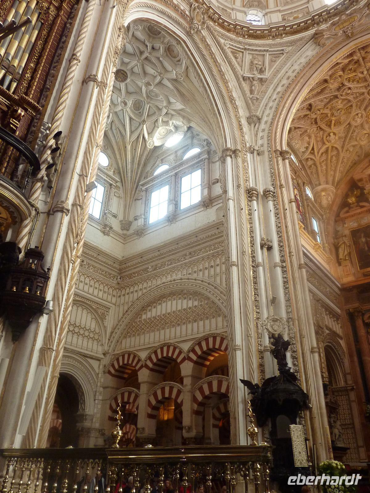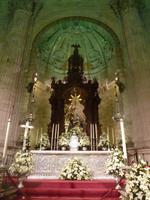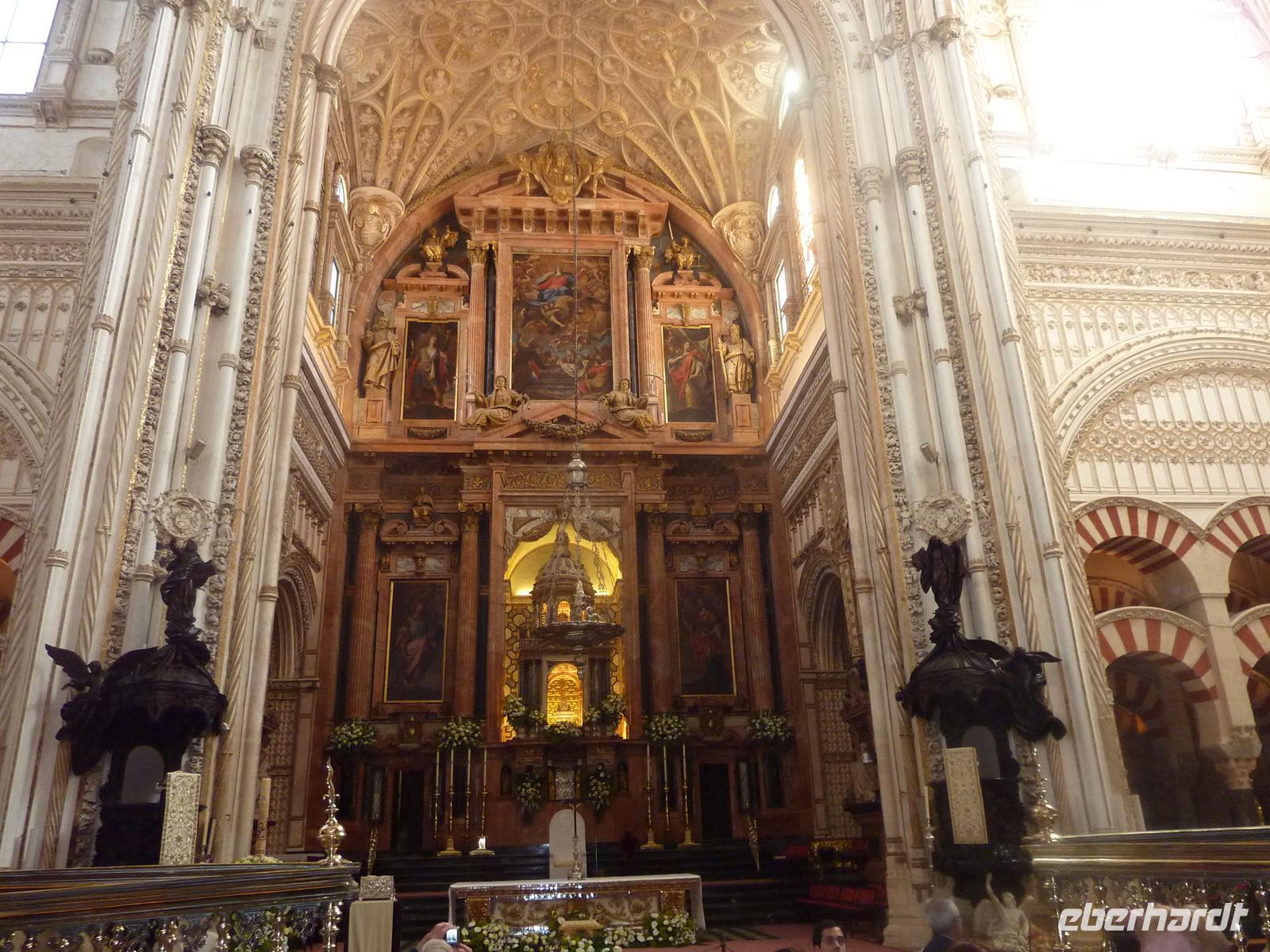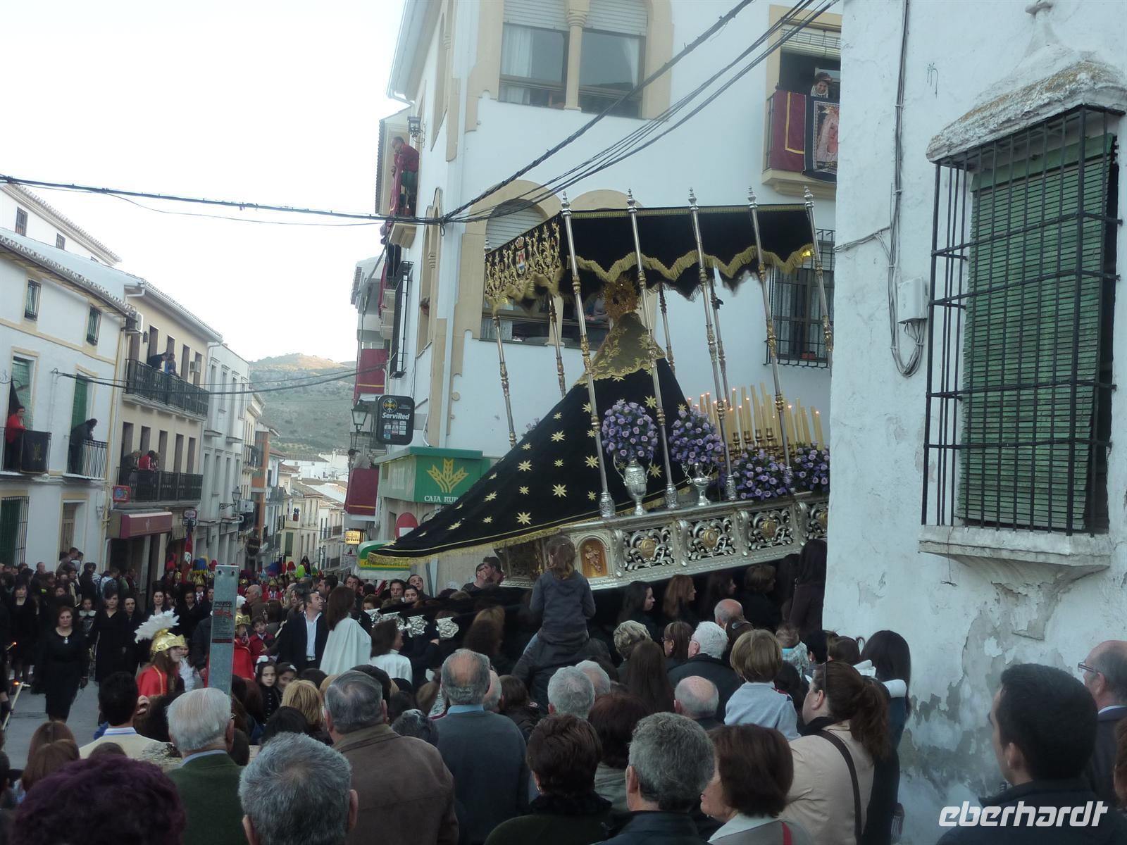 Nach einer reichlichen Stunde Fahrt erreichten wir diese geschichtsträchtige Stadt. Mit unserer netten, örtlichen Gästeführerin genossen wir noch die Stille und Leere der Stadt. Bei Sonnenschein gingen wir über die Puente Romana, welche über den größten Fluss Andalusiens, den Guadalquivir, führt, in die Altstadt hinein. Höhepunkt war der Besuch der Mezquita, eine der größten Moscheen der Welt und heutige Kathedrale. Die Schönheit , die riesigen Ausmaße und die Verbindung der maurischen, schlichten Architektur, mit der prunkvollen erhabenen katholischen Kathedrale erstaunte und beeindruckte uns sehr. Über den Orangengarten verließen wir dann die Mezquita und gingen durch das ehemalige Judenviertel mit der Blumengasse und vielen weiteren kleinen, heute mit unzähligen kleinen Bars und Geschäften besetzen Gassen. Gegen 11.30 Uhr endeten wir unseren geführten Stadtrundgang und genossen den Sonnenschein auf einer Terrasse vor einer Bar. Einige probierten hier die traditionellen Tapas aus. Nach der unfreundlichen Kassierung sind wir zur Prozession auf den Plaza Tendillas gegangen. Dort war die feierliche Prozession, der traditionelle Umzug der Bruderschaften zu Semana Santa bereits im Gange. In erster Reihe konnten wir den Festzug hautnah miterleben. Der Geruch von Weihrauch, die musikalischen Klänge und der über und über mit Gold geschmückte „Paso“ (Tragegestell mit Christusskulpturen) beeindruckte uns sehr.