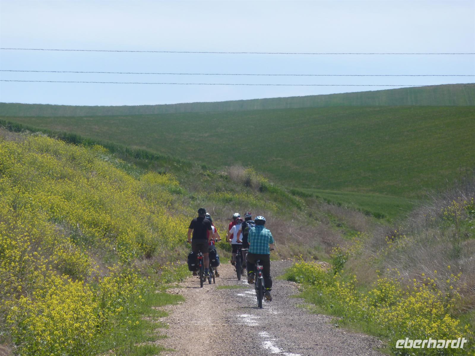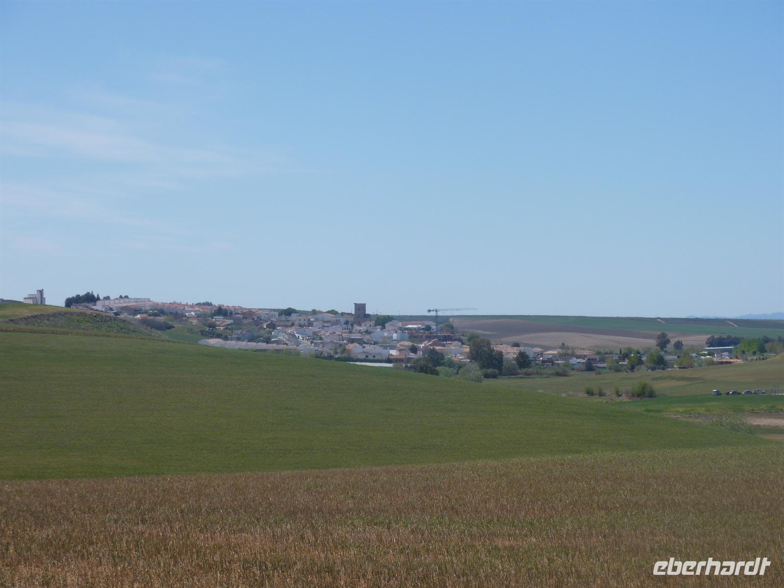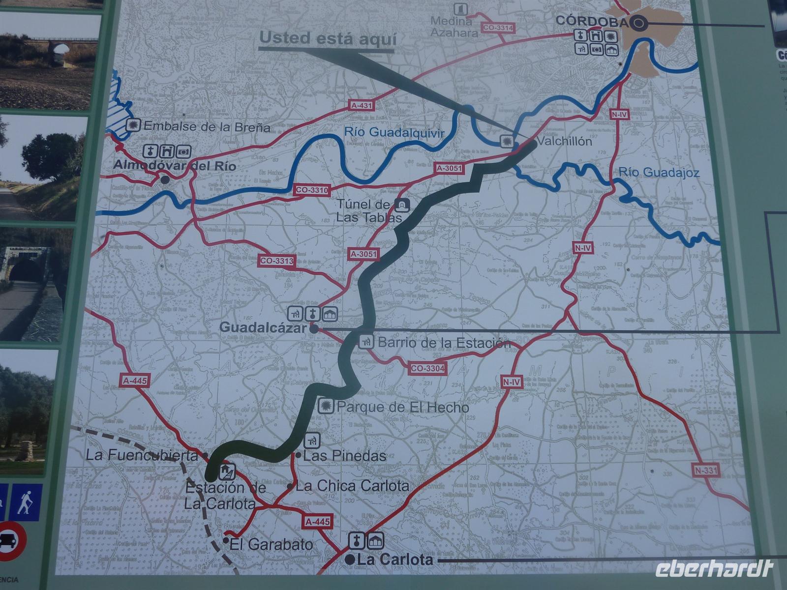 Stadtgrenze von Córdoba, zum Beginn der Via Verde de la Campina. An Feldern und Wiesen entlang, teils über etwas schottrigen Weg, radelten wir 32 Kilometer bei Sonnenschein bis nach La Carlota.