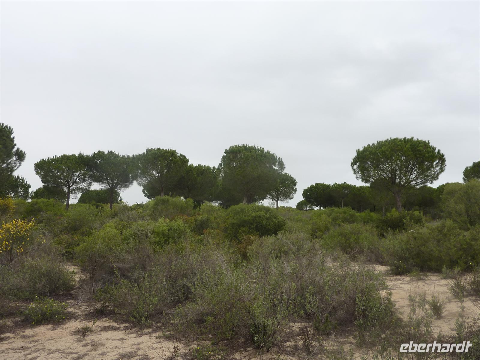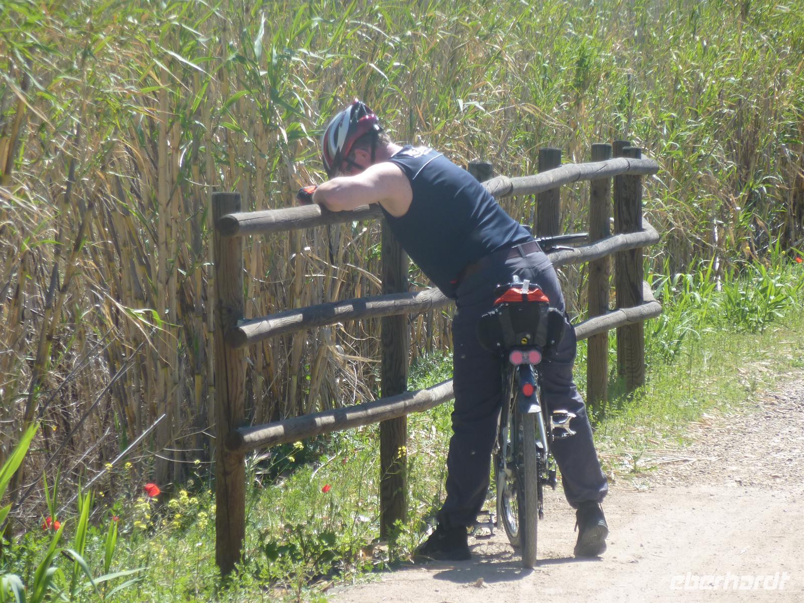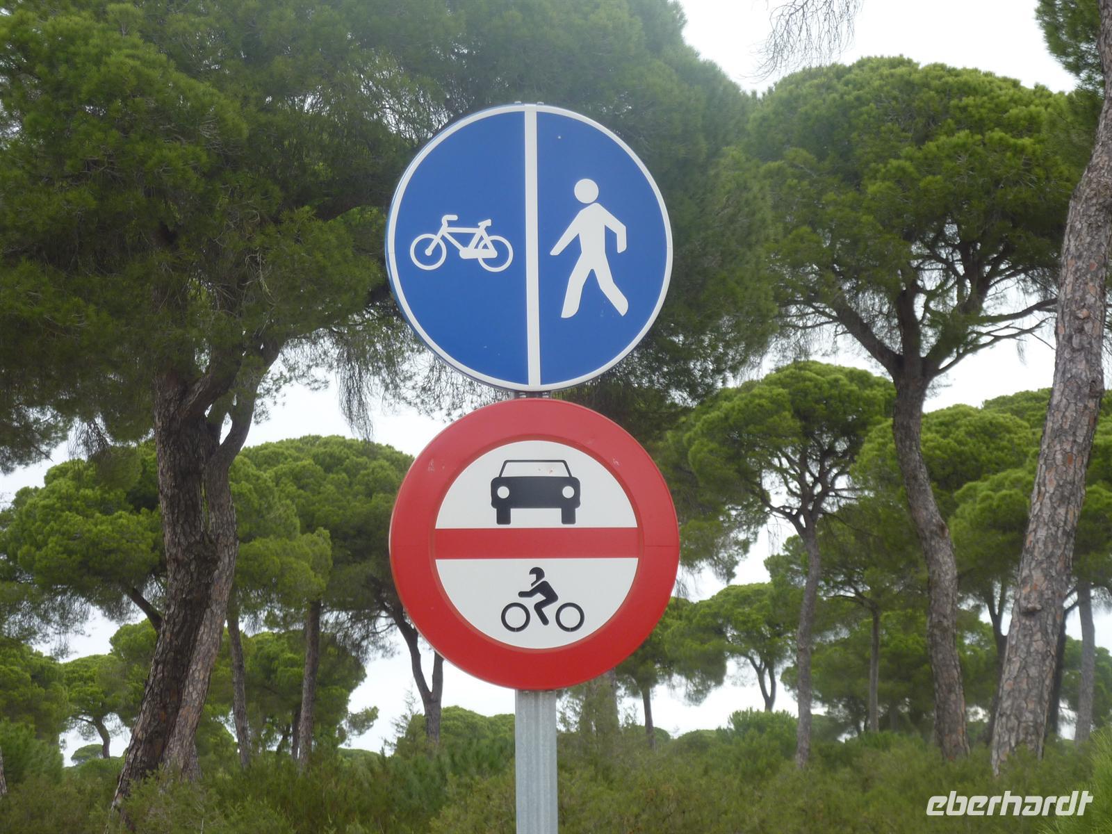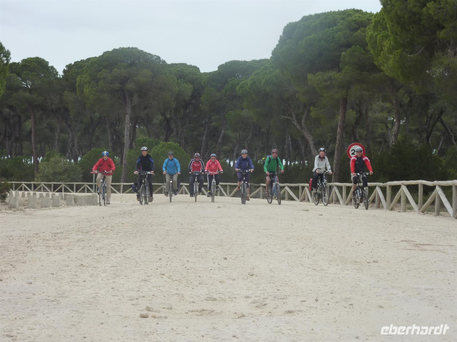 Oje, nach unserem gehaltvollen Frühstück fing es an zu regnen. Und das, wo wir zu unserer letzten Radetappe aufbrechen wollten. Nichtsdestotrotz machten wir uns zunächst mit dem Bus auf den Weg zum Nationalpark Doñana. Tatsächlich traten die Voraussagungen unserer „Pannen-Karin“ ein. Schon beim Entladen sahen wir den Platten an Ihrem Rad. Schnell holte Jens das Ersatzrad aus dem Anhänger und freute sich, dass dieses nun auch seine Verwendung hatte. In den Naturpark Doñana, welcher Lebensraum vor allem vieler Vogelarten ist, nahmen wir einen kleinen Einblick, indem wir eine kleine Runde mit dem Fahrrad (auch mal schiebend) durch die Dünenlandschaft mit den vielen Pinienbäumen drehten. Anschließend machten wir uns trotz weiteren Regens auf den Weg über Sanlucar de Barrameda nach Rota. Jens führte uns bis zum Ausgang nach Sanlucar, wo wir auch wieder eine Via Verde fanden, deren Ende wir auch in Rota schon entdeckt hatten. Leider war diese Via Verde nicht in einem berauschenden Zustand, so