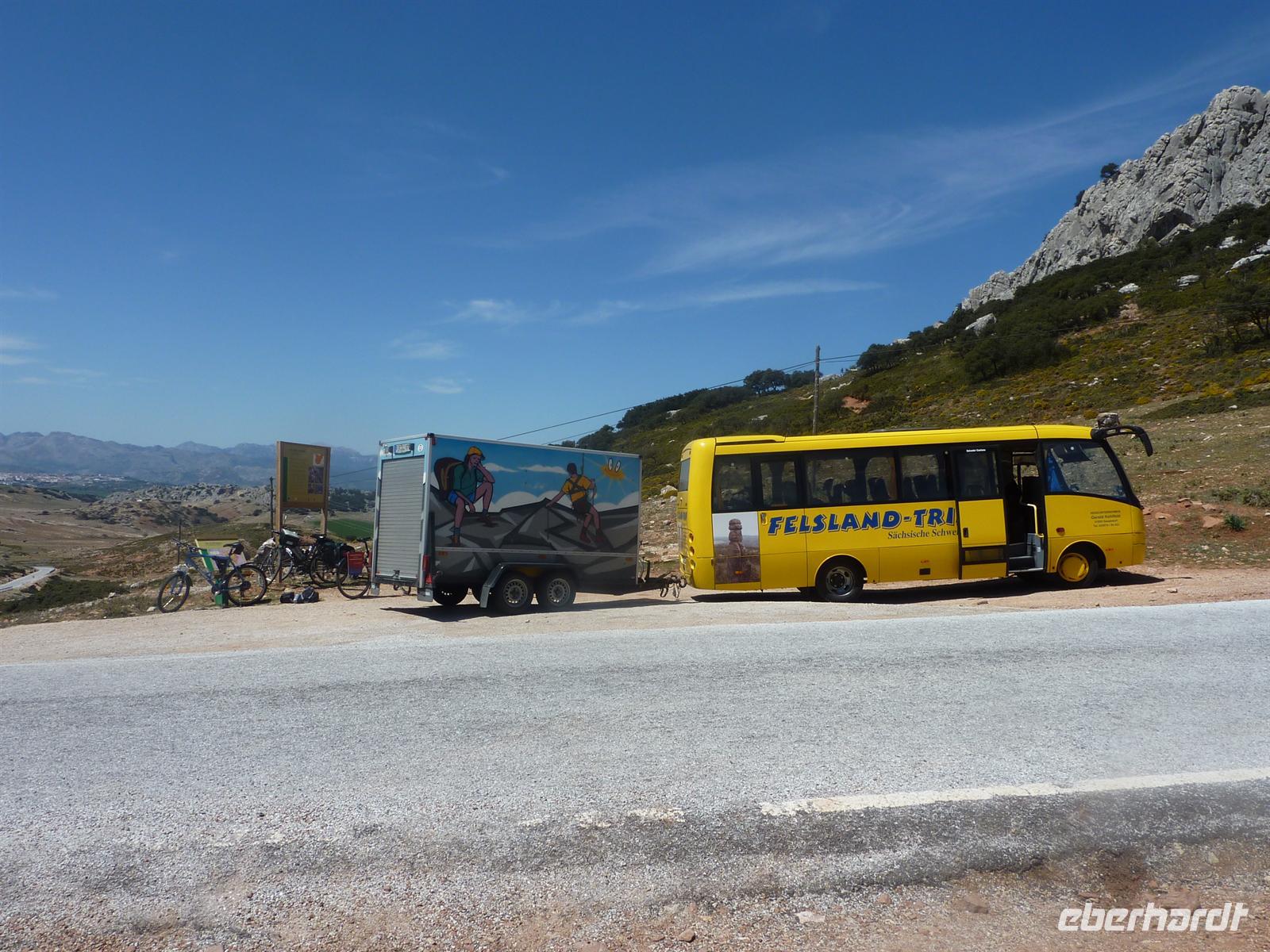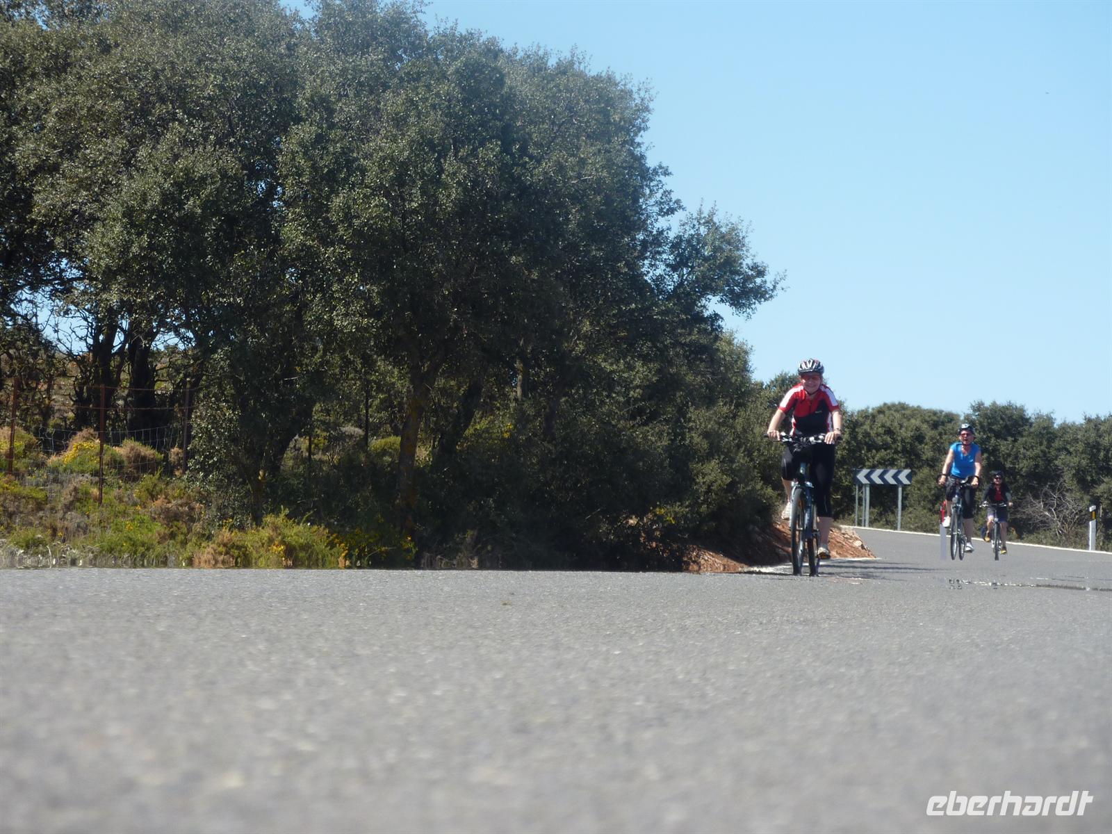 Heute hieß es Sachen einpacken, denn wir machten uns auf den Weg nach Ronda. Nach zweieinhalbstündiger Fahrt erreichten wir den Ausgangspunkt unserer Radtour am Rande der Stadt. Jens stellte uns vor zwei Tourenvarianten. Eine mit Beginn ab Ronda, aber mit ca. 400 Höhenmetern auf den ersten 7 Kilometern. Oder Mitfahrt mit dem Bus zum höchsten Punkt der Strecke, dem Puerto del Viento und dann mehr oder weniger eine recht einfache Abfahrt Richtung El Burgo. So konnte jeder nach seiner Tagesverfassung und vielleicht auch sportlichem Ehrgeiz entscheiden. Eine falsche Entscheidung konnte man auch nicht treffen, denn Jens kam mit dem Bus als „Besenwagen“ langsam hinterher gefahren und konnte so Jeden aufnehmen, dem es doch zu viele Höhenmeter wurden. Aber alle, die sich für die längere Tour entschieden hatten, kämpften sich wacker bis auf