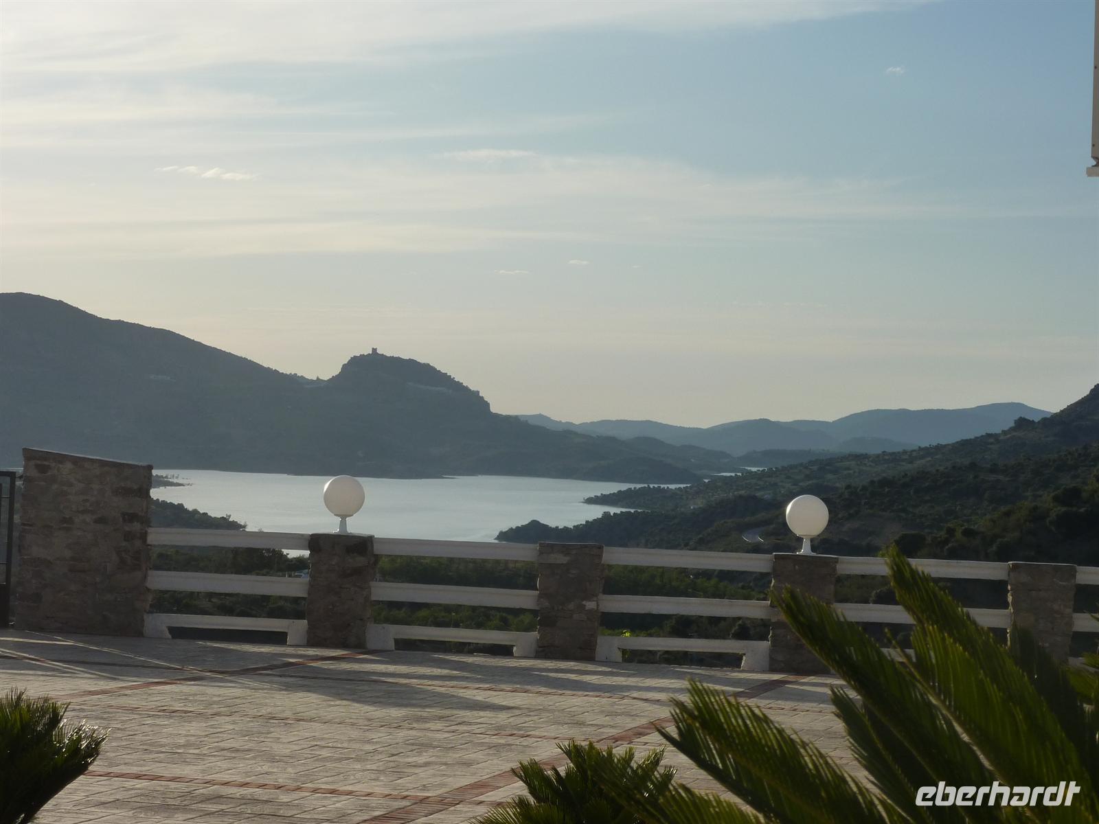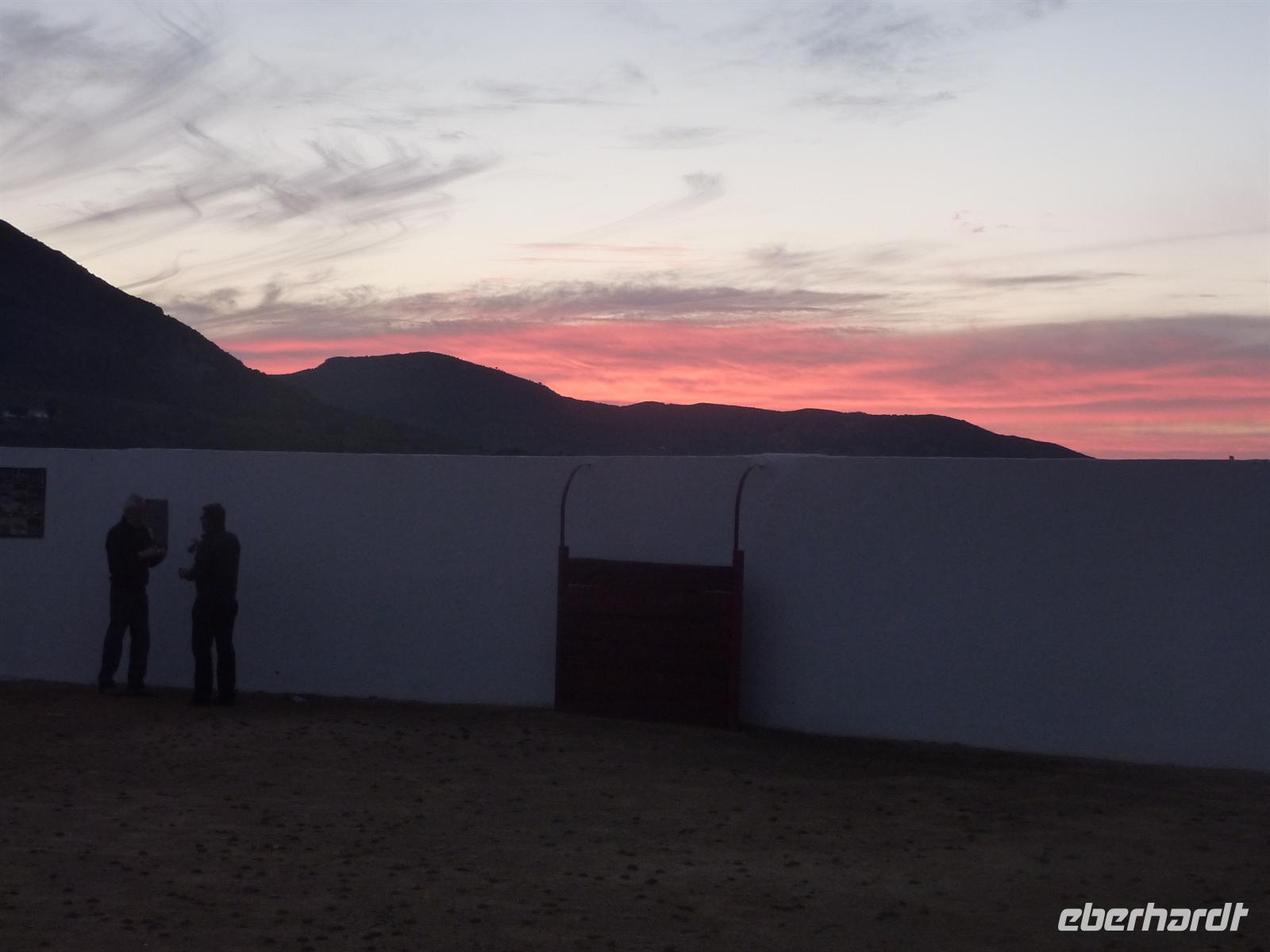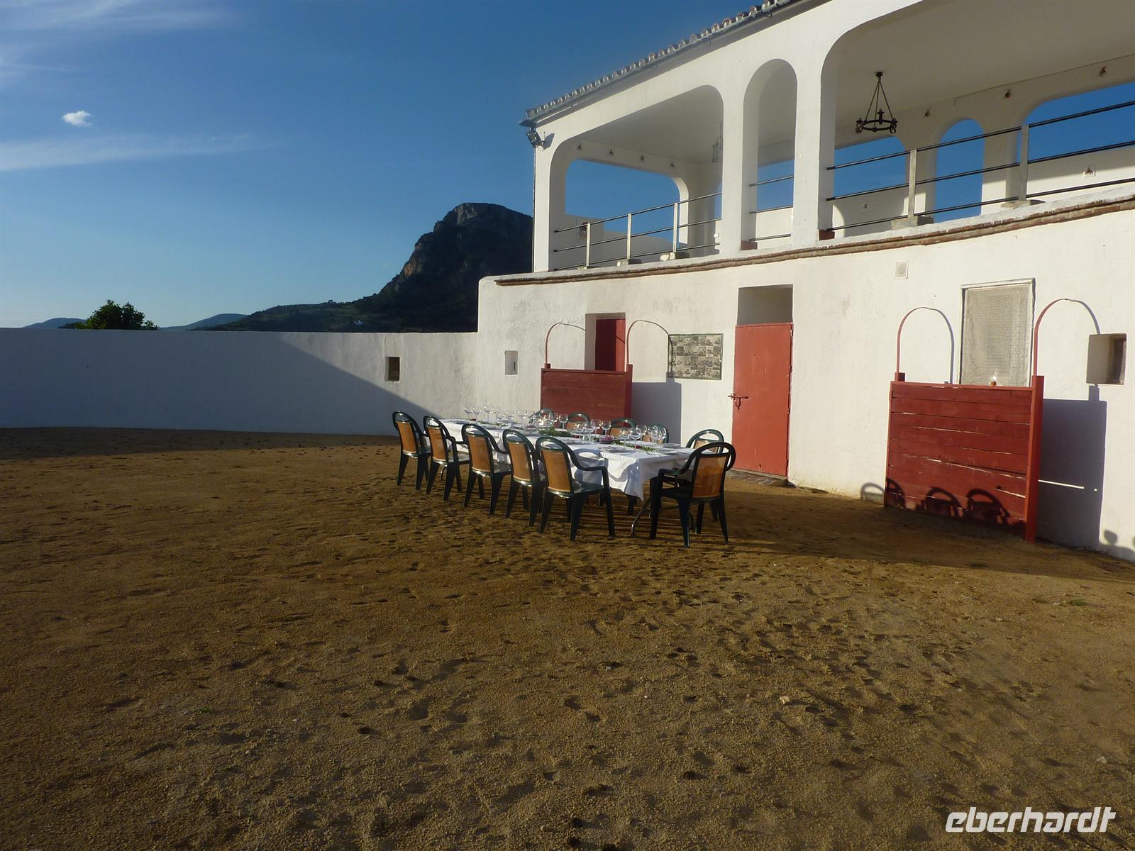 1190 m Höhe. Auf dieser Strecke und der weiteren Fahrt nach El Burgo beeindruckte uns immer wieder die eindrucksvolle Berglandschaft, durch die wir uns auf der sehr gut zu befahrenden Asphaltstrasse schlängelten. Einen schönen Aussichtspunkt nutzten wir noch zu einem Fotostopp und dann ging es das steile Kurvengeschlängel zum Zielort. Kurz aufgehalten wurden wir nur durch einen Reifenschaden bei Karen, den aber die „Reparaturcrew“ schnell beheben konnte. In El Burgo machten wir es uns noch bei verschiedenen Getränken zu bemerkenswert niedrigen Preisen in einer Strassenbar gemütlich, bevor wir dann über Ronda zu unserem neuen Domizil Cortijo Salinas fuhren. Es erwartete uns ein wunderschönes und mit viel eigenem Flair versehenes kleines Landhotel. Wir waren begeistert ob der wieder wunderschönen Aussicht und der mit viel Liebe zum Detail beschaffenen Hotelanlage mit eigener Stierkampfarena. Wir richteten uns schnell ein und fanden uns dann zu einem Aperitif im Hotelhof ein. Karen und Uwe hatten Kostproben Ihres hervorragenden Obstliköres eigener Herstellung mit. Sehr lecker und eine schöne Einstimmung auf das Abendessen. Und das sollte besonders toll werden! Das Hotelpersonal hatte unsere Tafel direkt in der Stierkampfarena aufgebaut. Und so saßen wir in der wohlige Wärme spendenden andalusischen Abendsonne und wurden mit allerlei Köstlichkeiten vom Grill versorgt. Die Stimmung war sehr ausgelassen und steigerte sich noch, als Jens mit einem „Stier“ kämpfen musste. Zu sehr vorgerückter Stunde begaben wir uns dann zur Ruhe in unsere wunderschönen Zimmer.