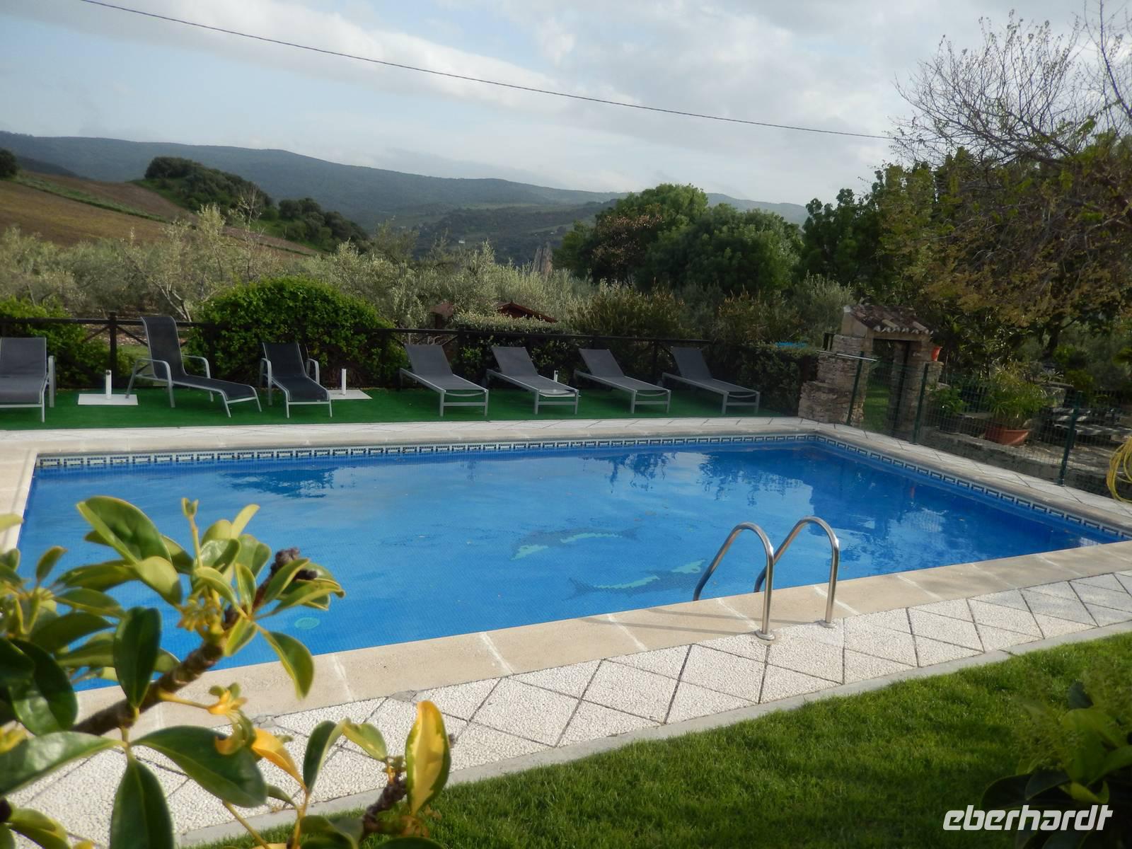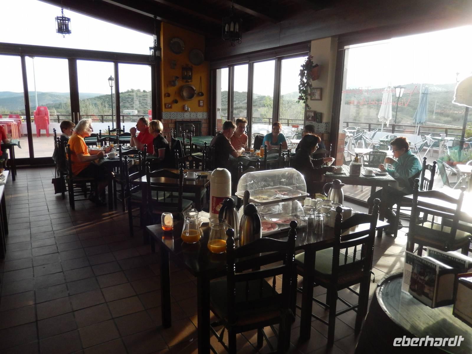 Heute gab es zum Frühstück „Pantumaca": Brot, geriebene Tomaten, Knoblauch und Olivenöl - typisch Andalusien. Am späten Vormittag fuhren wir mit dem Bus und den verladenen Rädern in die typisch andalusische Kleinstadt Ronda. Ronda gilt als Wiege des Stierkampfes und ist vor allem durch die fantastische Lage ein absolutes Muss einer Andalusienreise. Am Stadtrand von Ronda begann unsere heutige Radtour, welche uns erst bergauf, dann aber absteigend durch spektakuläre Landschaften mit atemberaubenden Ausblicken führt. Wer nicht bergauf radeln mochte, konnte mit dem Bus bis zum höchsten Punkt fahren und danach von dort aus bergab radeln. Aber wir waren alle fit genug um die Tour von Beginn an durchzuziehen. Herrlich. Nach circa 27 Radkilometern erreichten wir das weiße Dorf El Burgo und beendeten mit einem Kaffee oder Cappuchino unsere Radtour. Auf der Rückfahrt zum Hotel machten wir oben auf dem Berg einen Stopp zum Picknick. Im Hotel hatten wir Zeit um uns auszuruhen und eine Siesta (spanische Nickerchen) einzulegen, oder eine Erfrischung im Pool zu wagen.