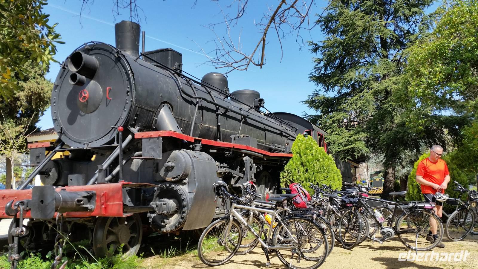 Links auf Ihrem Weg sahen wir die zahlreichen Olivenhaine. Und rechts betrachteten wir die wechselnde Landschaft des Naturgebietes der Sierra de la Subbetica mit ihren schroffen Berglandschaften. Nach den ersten 10 Kilometern bergauf erreichten wir den damalige Bahnhof von Cabra. Bei einer kleinen Pause könnten wir die hier ausgestellte alte Lok und die Wagons besichtigen sowie einen leckeren zweiten Kaffee am Morgen genießen. Weiter radelten wir durch den Naturpark de la Subbetica mit immer faszinierenden Ausblicken. Ab und zu musste man anhalten um die schöne Landschaft zu fotografieren. Wir fuhren sogar durch einen Tunnel und über schöne kleine Brücken und Aquädukten. Nach ca. 25 km unterhalb von Zuheros hatten wir „endlich" unser Mittagsrast. Zu Mittag stärketen wir uns beim Picknick im Grünen und genaßen einfach die Stille und Ruhe der wunderschönen Natur. Was für eine Ruhe! Jens und Benjamin überraschten die Gäste mit allerlei möglichen spanischen Köstlichkeiten als Tapas: Chorizo, Salchichon, Lomo, Käse, Boquerones, Tomaten mit Thunfisch, Baguette-Brötchen, Oliven und alles sowieso immer mit Olivenöl und Jamon Serrano Schinken. Man konnte nur Lecker sagen. Nach dem alle vom Wein getrunken hatten, erzählte der eine oder andere einige Witze und um keine Siesta zu machen, mussten wir weiter. Dach davor gab es noch Pestinos als Nachtisch (spanisch Spezialität, die man nur zu Ostern bekommt). Nach insgesamt 50 Radkilometern beendeten wir die heutige erste Radtour direkt am Hotel in Alcaudete. Viele von uns gingen direkt in den Pool um sich abzukühlen. Das heutige Abendessen nahmen wir im Restaurant im Hotel ein aber erst um 20.30 Uhr da wir uns langsam an die spanischen Uhrzeiten gewonnen müssen. Immerhin ist es bis 21 Uhr immer noch hell.