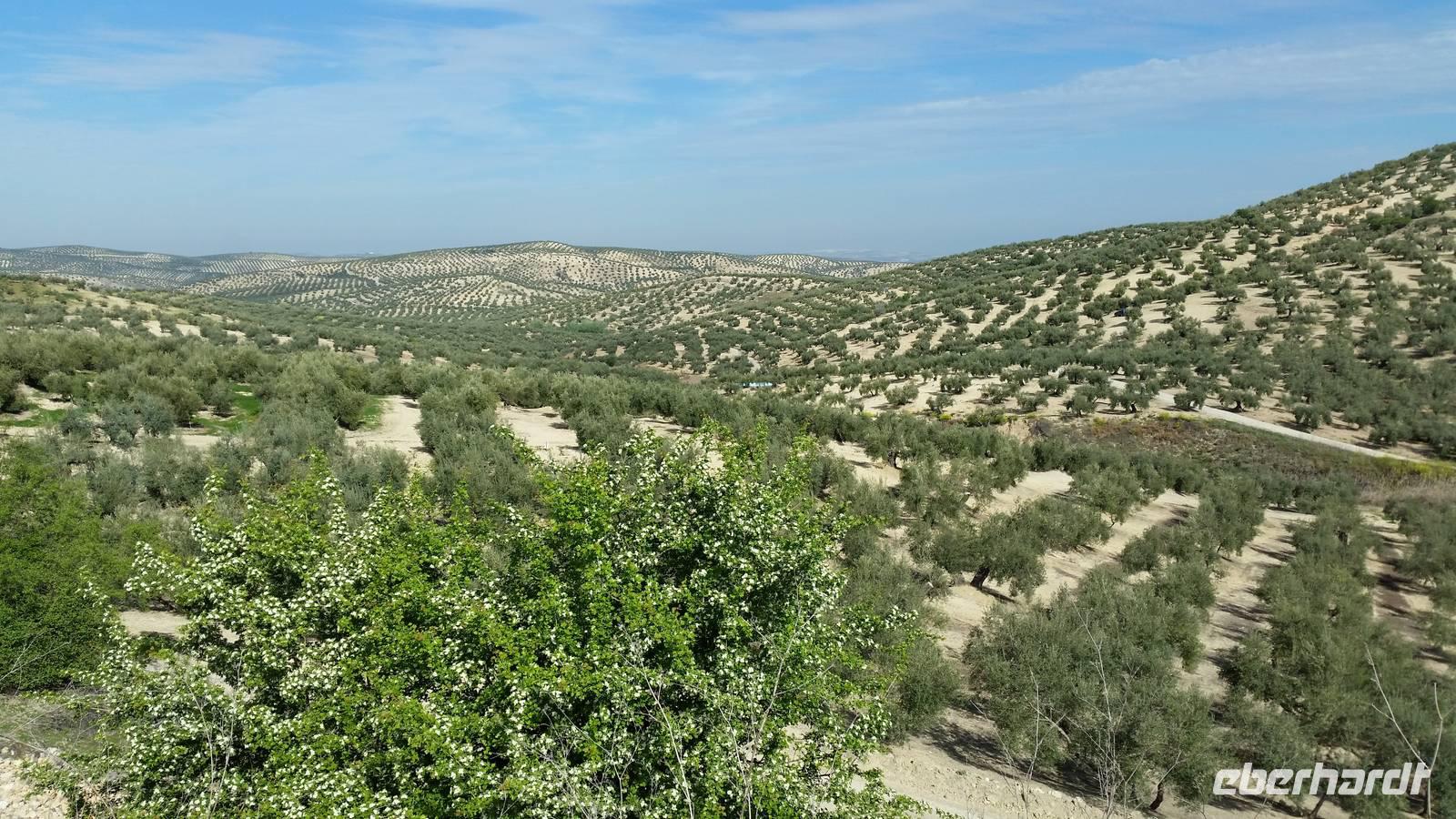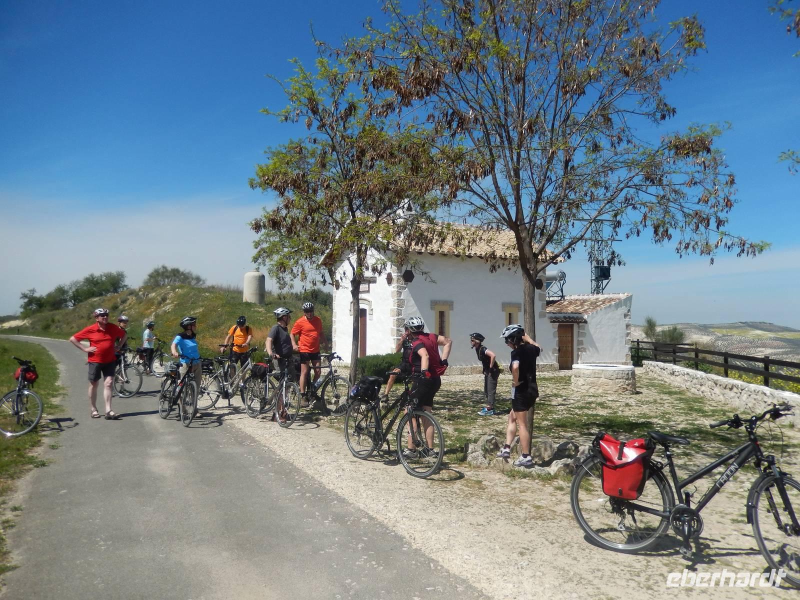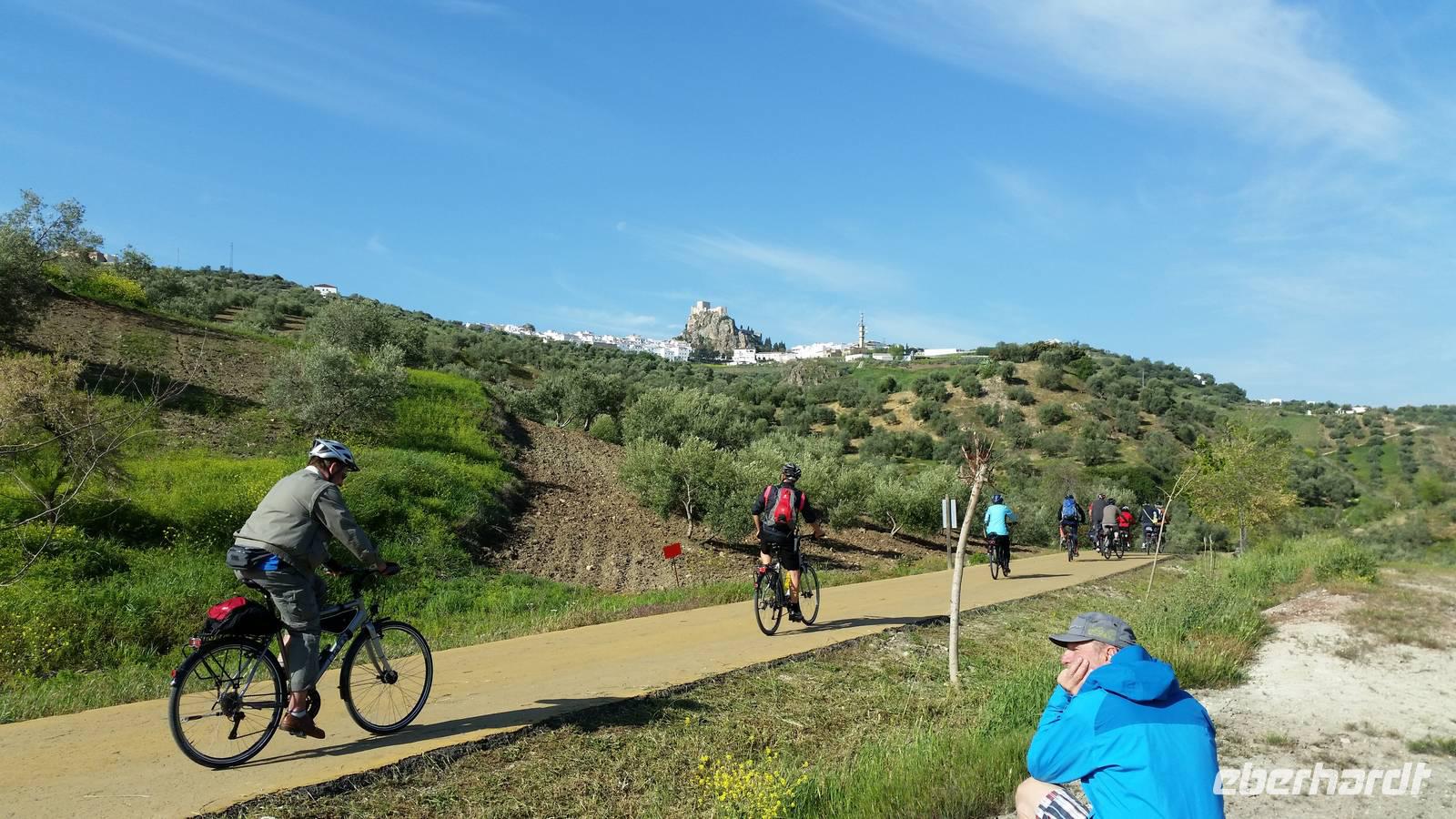 In Lucena, in der Kleinstadt am Ortsausgang beginnt die erste Radstrecke, die Via Verde de la Subbetica. Hier wurden die neu gekauften Räder ausgeladen. Alle Räder waren schon nach Körpergrößen richtig eingestellt und langsam konnte es los gehen. Jens erzählte uns, was genau die grünen Wege damals waren: es war ein altes Gütersystem von Bahnstrecken, die vor allem Öl, das grüne Gold von damals, transportierten. Heutzutage wurden all diese Zugstrecke für Fahrrädern und Tourismus freigegeben damit auch die Maschinen mit 2 Rädern diese schönen Strecken fahren können. So wie wir heute. Wir genießen richtig die abwechslungsreichen Landschaftsblicke auf dem gut ausgebauten, festen „Via Verde oder dem Grünen Weg". Gestern hat es in Dresden sogar geschneit beim Abflug und heute haben wir nicht nur Frühling, sondern fast Sommergefühle. Wir sind alle begeistert. So eine Reise ist nicht nur Urlaub für den Körper, für ein aktives gesundes sportliches Leben sondern auch für die innere Seele. Herrlich so eine Landschaft.
