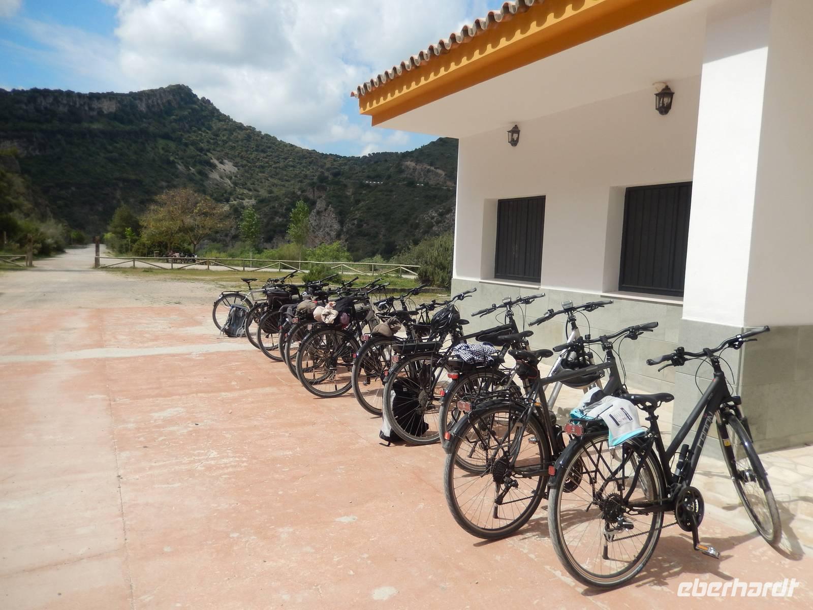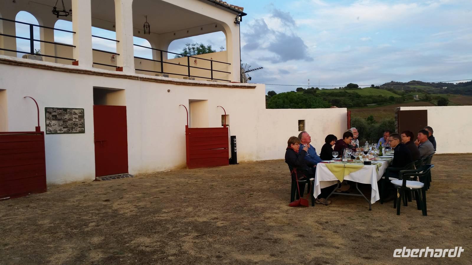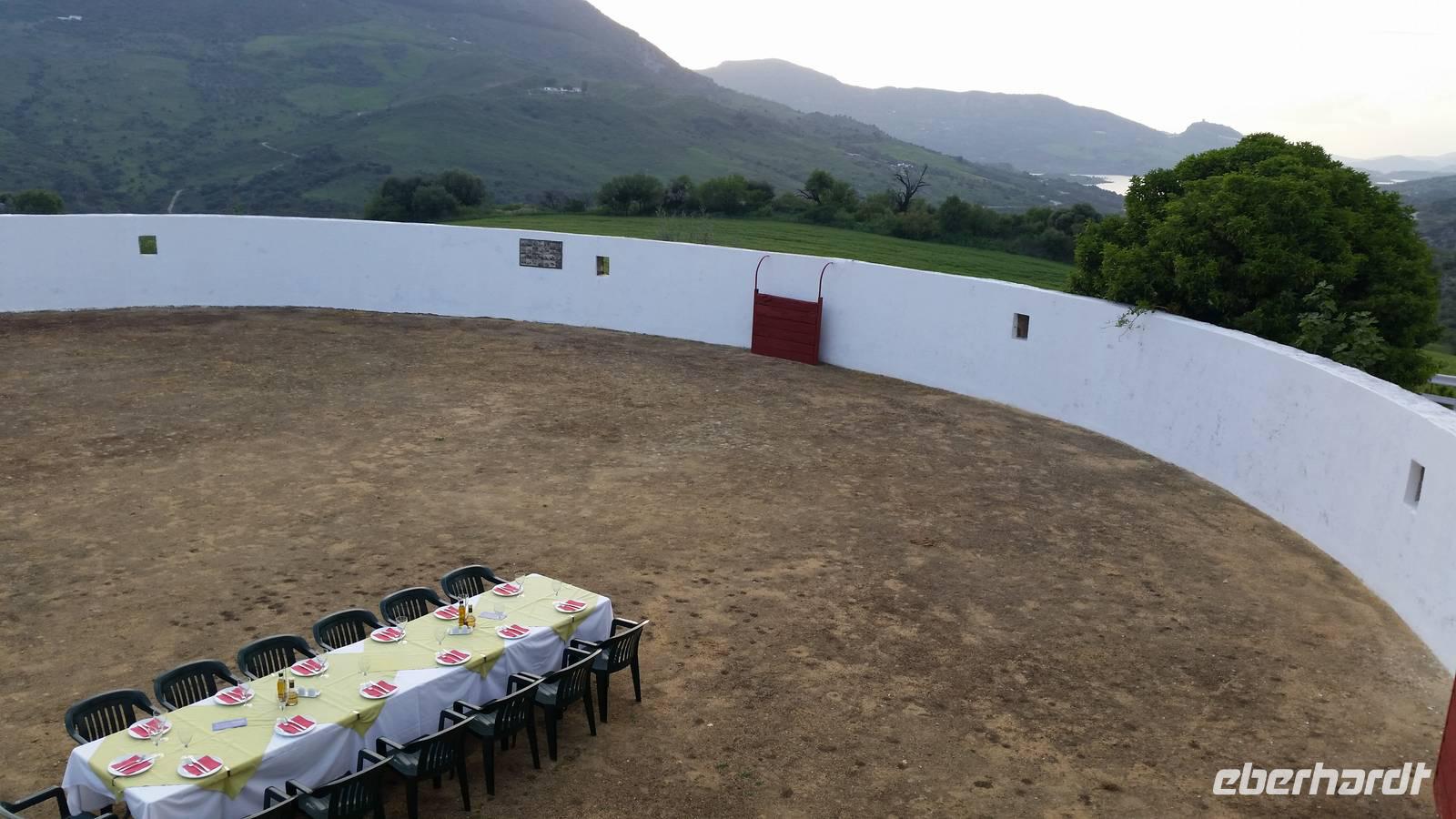 Was für eine Ruhe hier. Man kann so gut schlafen mitten in der Natur. Das heutige Frühstück fand wieder auf der überdachten Terrasse mit grandiosem Ausblick auf den nahe gelegenen See und die Berge statt. Der Bus brachte uns am Morgen in die historische Altstadt von Olvera. Schon von Weitem sahen wir die erhabene Burg und die weißen Häuser, welche imposant am Berg gelegen sind. Wir fuhren zum umgebauten Bahnhof von Olvera. Hier startet die Via Verde de la Sierra mit einem ebenso gut ausgebauten Radweg. Mitten durch die hohen Berglandschaften radeln wir genussvoll auf der ehemaligen Bahntrasse und passieren dabei 30 Tunnel und mehrere Viadukte. Herrlich. Einige Tunnel waren richtig lang, fast 1 Kilometer aber immer sehr gut beleuchtet. Ein einmaliges Raderlebnis! Dazwischen machten wir eine Cappuccino Pause in El Coripe. Nach 36 leichten Radkilometern erreichten wir den „Bahnhof" in Puerto de la Serrano. Wir wollten von den Räddern nicht mehr absteigen, die uns die letzen Tage so gut geführt haben. Der Bus chauffierte uns zurück zum Hotel, wo wir die Ruhe des Hotels nutzten. Heute an unserem „letzten Abendmahl" verwöhnte uns das Hotel mit einem unvergesslichen, sehr schmackhaften BBQ-Essen, in mitten einer Stierkampfarena direkt an unserem Hotel. Erstmal bereiteten Jens und Benjamin einen Sektempfang vor, um auf die vergangenen Tage anzustoßen und uns vom Herzen zu bedanken. Für alle war es eine Überraschung, zum ersten Mal im Leben, in mitten einer ehemaligen Stierkampfarena ein typisch andalusisches Grill-Abendessen zu erleben. Anschließend gab es noch eine Überraschung: eine falsche Stierpuppe fordert uns „Toreros" heraus. Berühmte spanische Volksmusik wurde gespielt, wir alle tanzten und hatten eine unvergessliche Nacht.