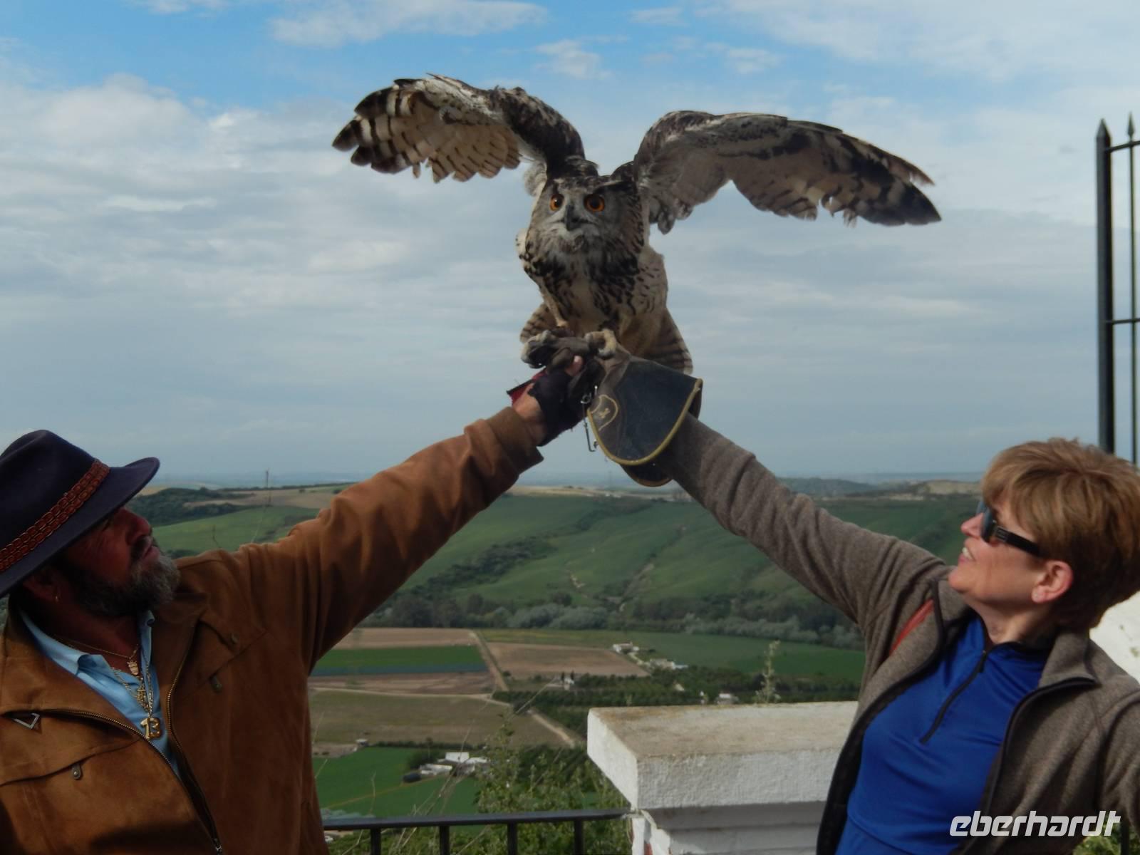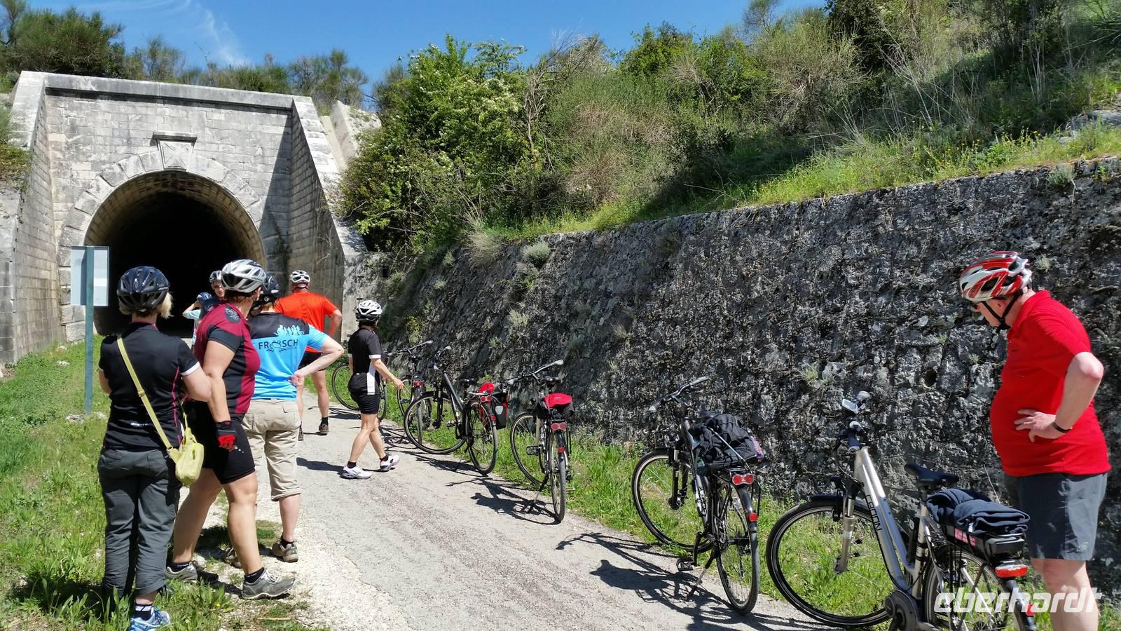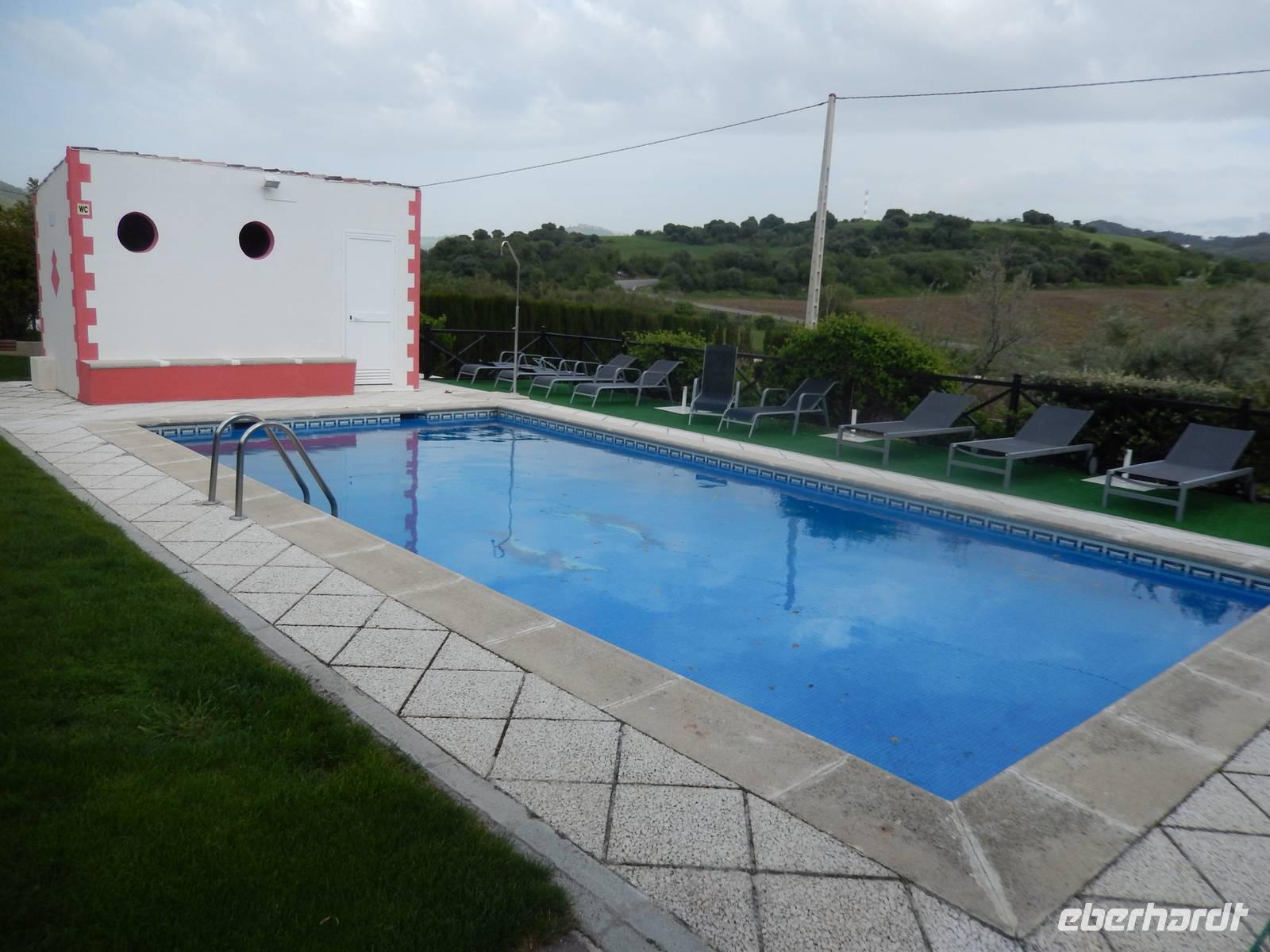 Was für eine Ruhe hier. Man kann so gut schlafen mitten in der Natur. Das heutige Frühstück fand wieder auf der überdachten Terrasse mit grandiosem Ausblick auf den nahe gelegenen See und die Berge statt. Der Bus brachte uns am Morgen in die historische Altstadt von Olvera. Schon von Weitem sahen wir die erhabene Burg und die weißen Häuser, welche imposant am Berg gelegen sind. Wir fuhren zum umgebauten Bahnhof von Olvera. Hier startet die Via Verde de la Sierra mit einem ebenso gut ausgebauten Radweg. Mitten durch die hohen Berglandschaften radeln wir genussvoll auf der ehemaligen Bahntrasse und passieren dabei 30 Tunnel und mehrere Viadukte. Herrlich. Einige Tunnel waren richtig lang, fast 1 Kilometer aber immer sehr gut beleuchtet. Ein einmaliges Raderlebnis! Dazwischen machten wir eine Cappuccino Pause in El Coripe. Nach 36 leichten Radkilometern erreichten wir den „Bahnhof" in Puerto de la Serrano. Wir wollten von den Räddern nicht mehr absteigen, die uns die letzen Tage so gut geführt haben. Der Bus chauffierte uns zurück zum Hotel, wo wir die Ruhe des Hotels nutzten. Heute an unserem „letzten Abendmahl" verwöhnte uns das Hotel mit einem unvergesslichen, sehr schmackhaften BBQ-Essen, in mitten einer Stierkampfarena direkt an unserem Hotel. Erstmal bereiteten Jens und Benjamin einen Sektempfang vor, um auf die vergangenen Tage anzustoßen und uns vom Herzen zu bedanken. Für alle war es eine Überraschung, zum ersten Mal im Leben, in mitten einer ehemaligen Stierkampfarena ein typisch andalusisches Grill-Abendessen zu erleben. Anschließend gab es noch eine Überraschung: eine falsche Stierpuppe fordert uns „Toreros" heraus. Berühmte spanische Volksmusik wurde gespielt, wir alle tanzten und hatten eine unvergessliche Nacht.