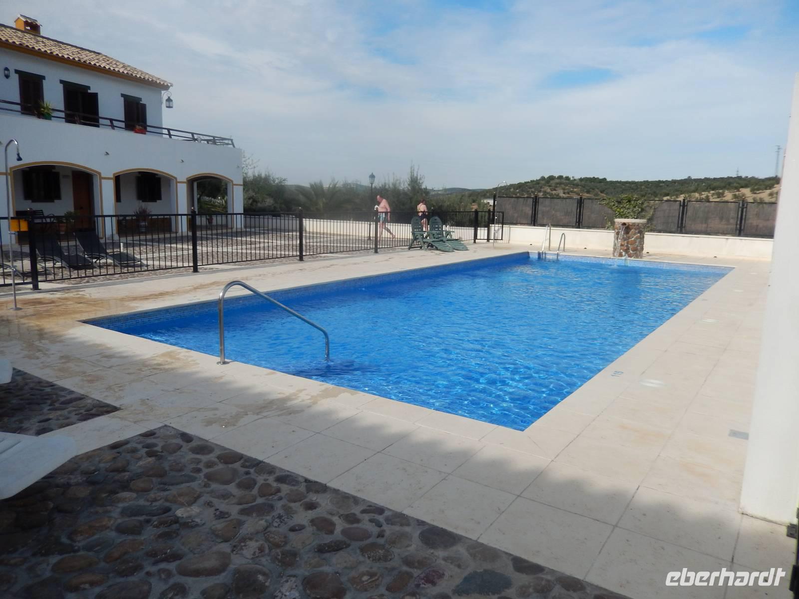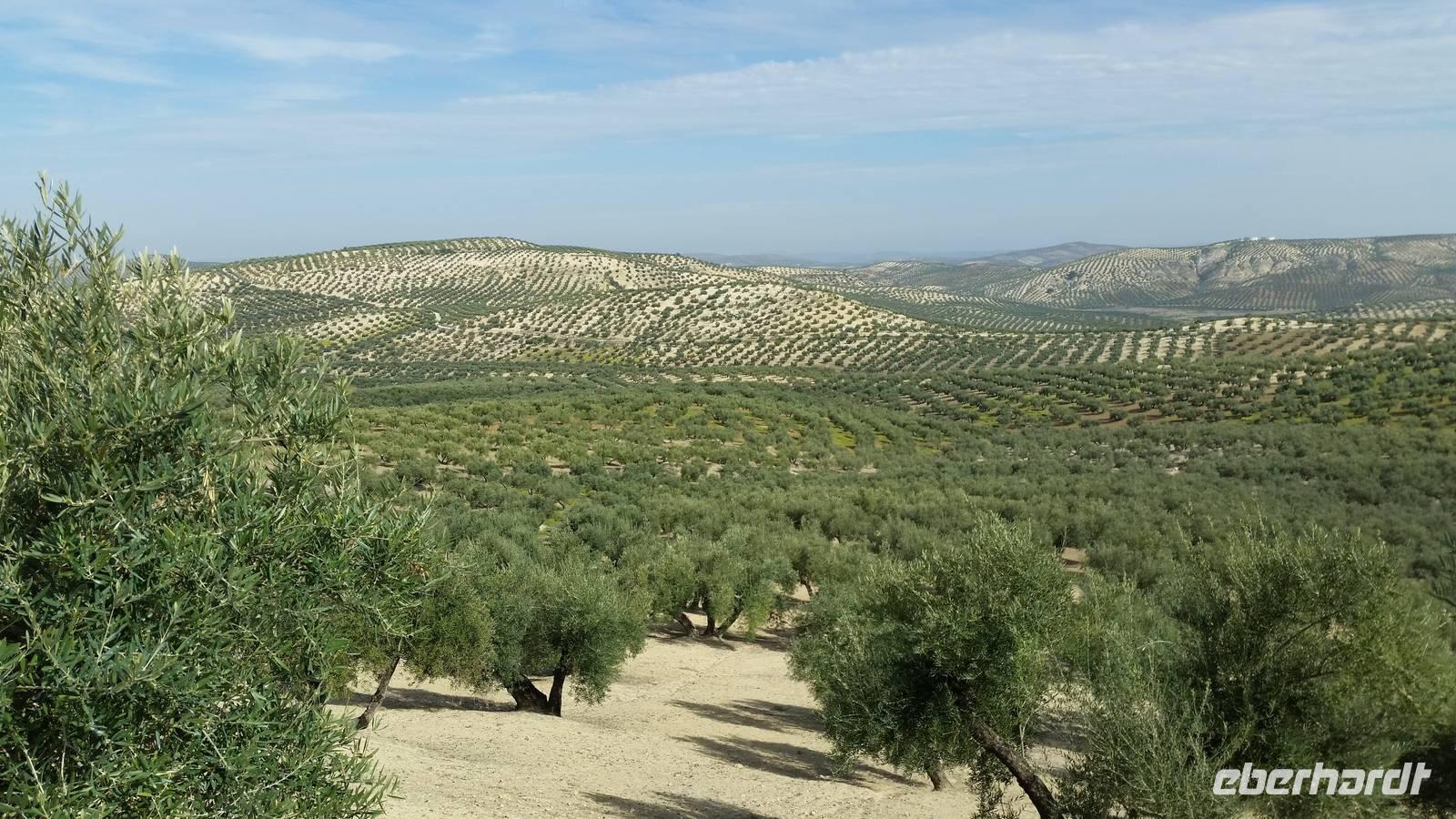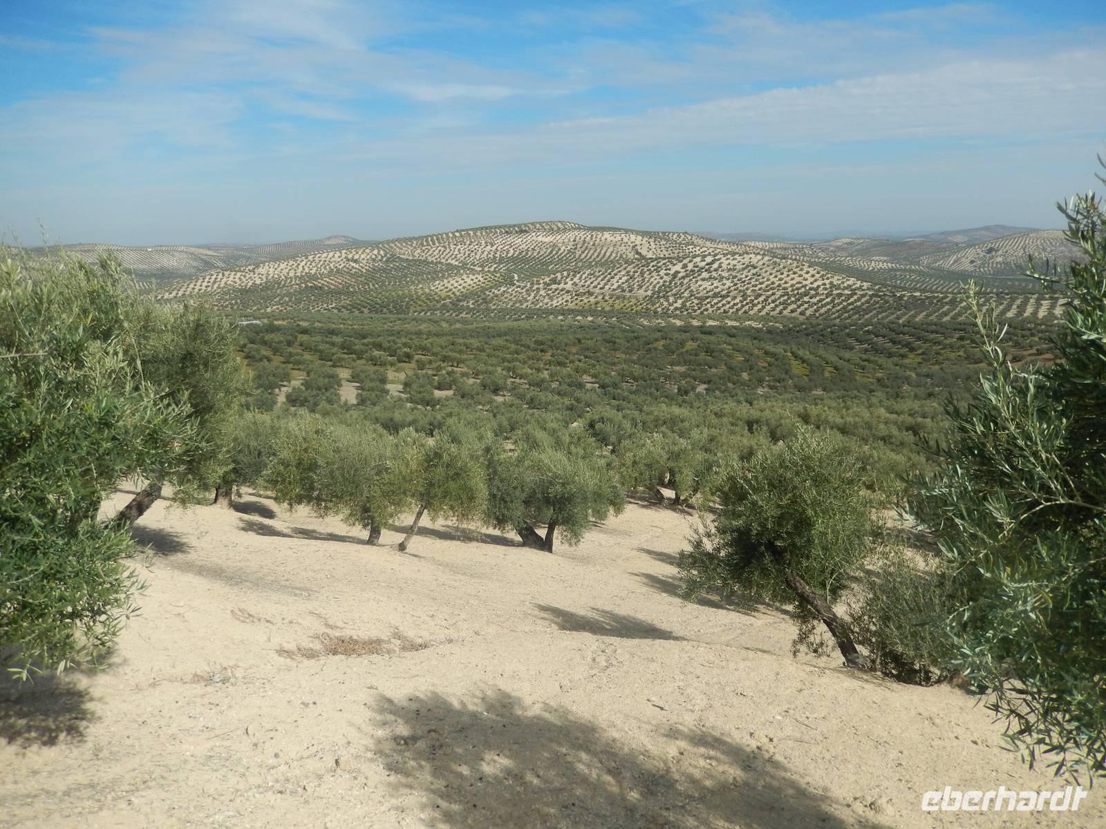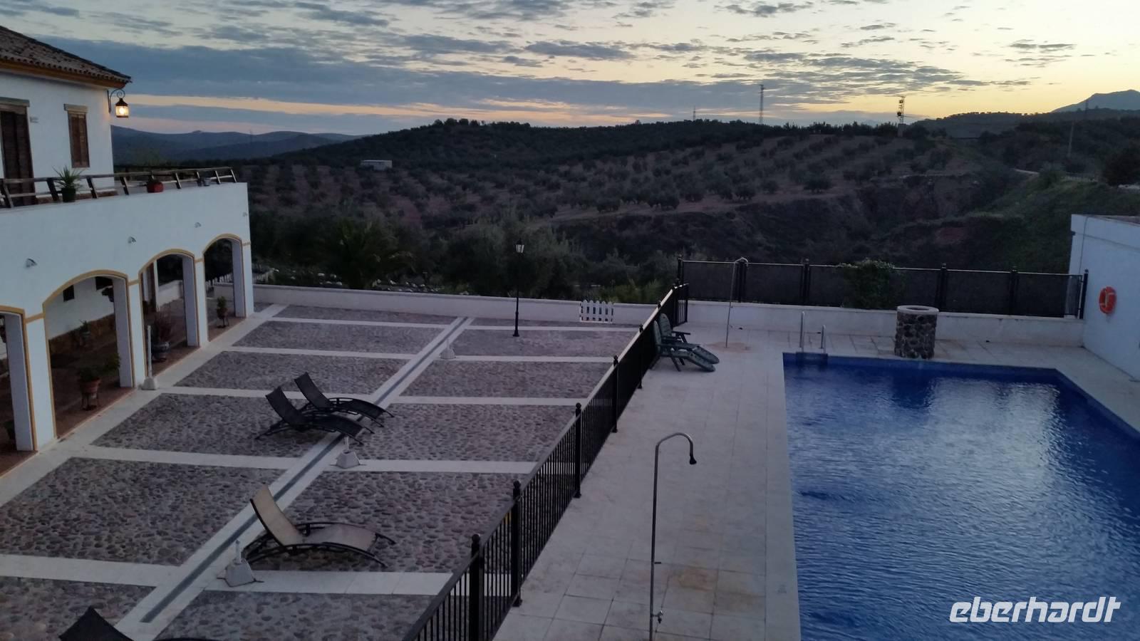 Heute fuhren wir vom Jaen, dem Land der Olivenbäume bis zum Hotel. Auch auf dieser Via Verde radelten wir ohne große Anstrengungen auf befestigtem Untergrund mit leichtem Gefälle. Die Via Verde del Alceite - der ehemalige Olivenölzug - führt am Rande von drei kleineren Städten hindurch, entlang einer grünen Landschaft mit tausenden Olivenbäumen. Merkmal dieses Radweges ist eine alte Kulturlandschaft mit grandiosen Metallviadukten die über schroffen Flusstälern führt. Auf der Strecke hatten wir zahlreiche Pausenplätze zum Verweilen und Genießen. An einem der zahlreichen Rastplätze nicht weit von Martos und mit Blick auf die unendlich scheinenden Olivenhaine hatten wir das heutige Picknick. Wieder lecker: Boquerones, Chorizo, Jamon Serrano Iberico, Oliven, Thunfisch mit frischen Tomaten und... Rotwein dazu. Ende der Radtour ist heute wieder das Hotel, direkt an der Radstrecke gelegen. Einige von uns gingen direkt in den Pool um sich zu erfrischen. Die Sonne schien und es war einfach herrlich. Man könnte am Pool ein Buch lesen und sich in die Natur ausruhen. Chic angezogen machten wir einen kleinen Spaziergang um die Burg von Alcauedete auf dem Hügel, von wo man die ganze Landschaft und damals die Feinde sehen konnte, um sich zu verteidigen. Nachdem wir heute entlang des ehemaligen Weges des Olivenölzuges geradelt sind, erfuhren wir bei einer Besichtigung eines kleinen Familieunternehmes alles über die Olivenölherstellung mit anschließender Verkostung. Wir hatten verschiede Ölqualitäten und mussten unterscheiden, welche Merkmale wir beim Verkosten im Mund erkennen können. Wir hatten das Glück auch heute hier in Luque noch einen Umzug tagsüber sehen zu können und schon hungrig fuhren wir zum „Los Balanchares" Restaurant, wo einige von uns Orangen mit Thunfisch und Olivenöl und Eier kosteten... Es war wie vom Himmel gemacht. Lecker.