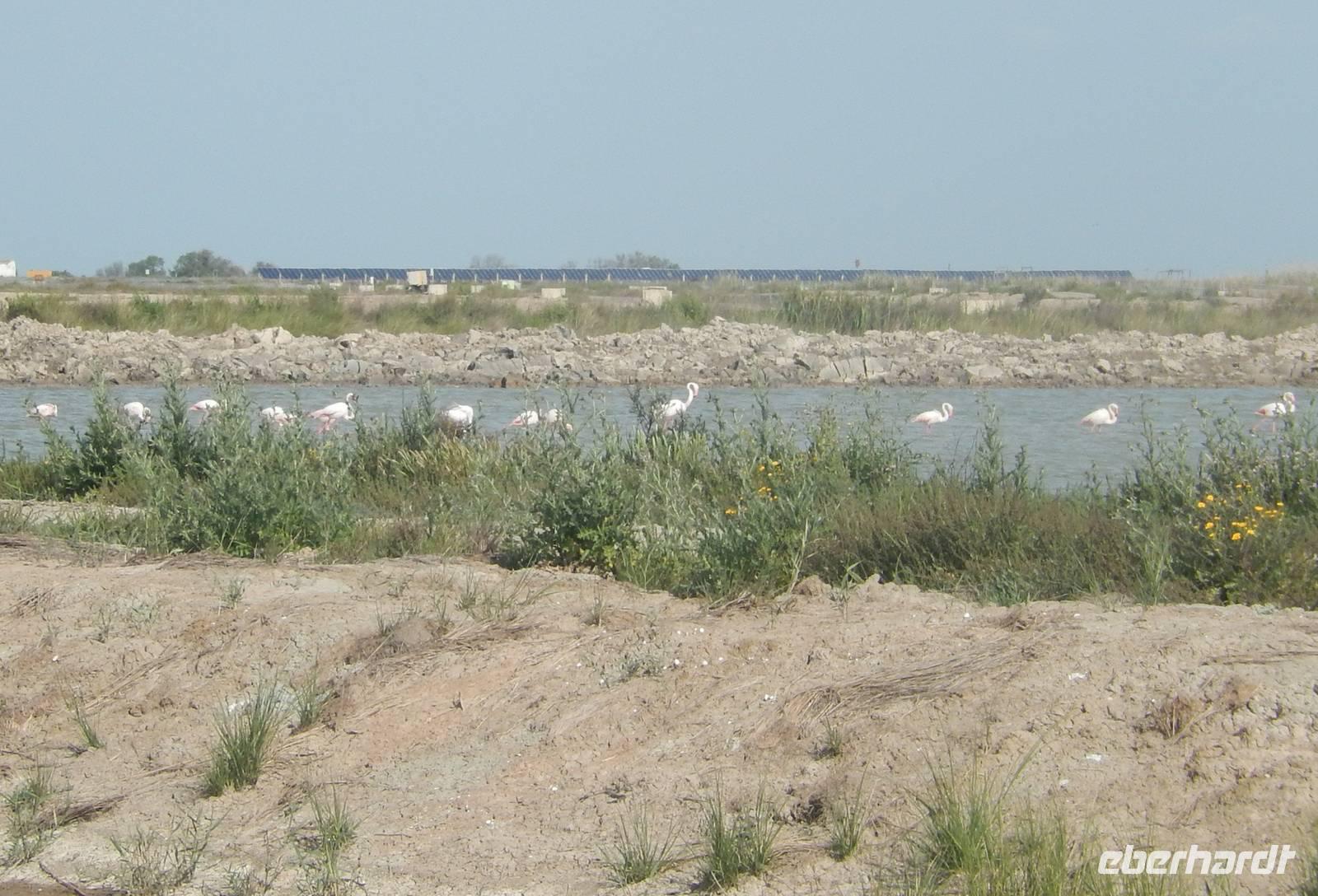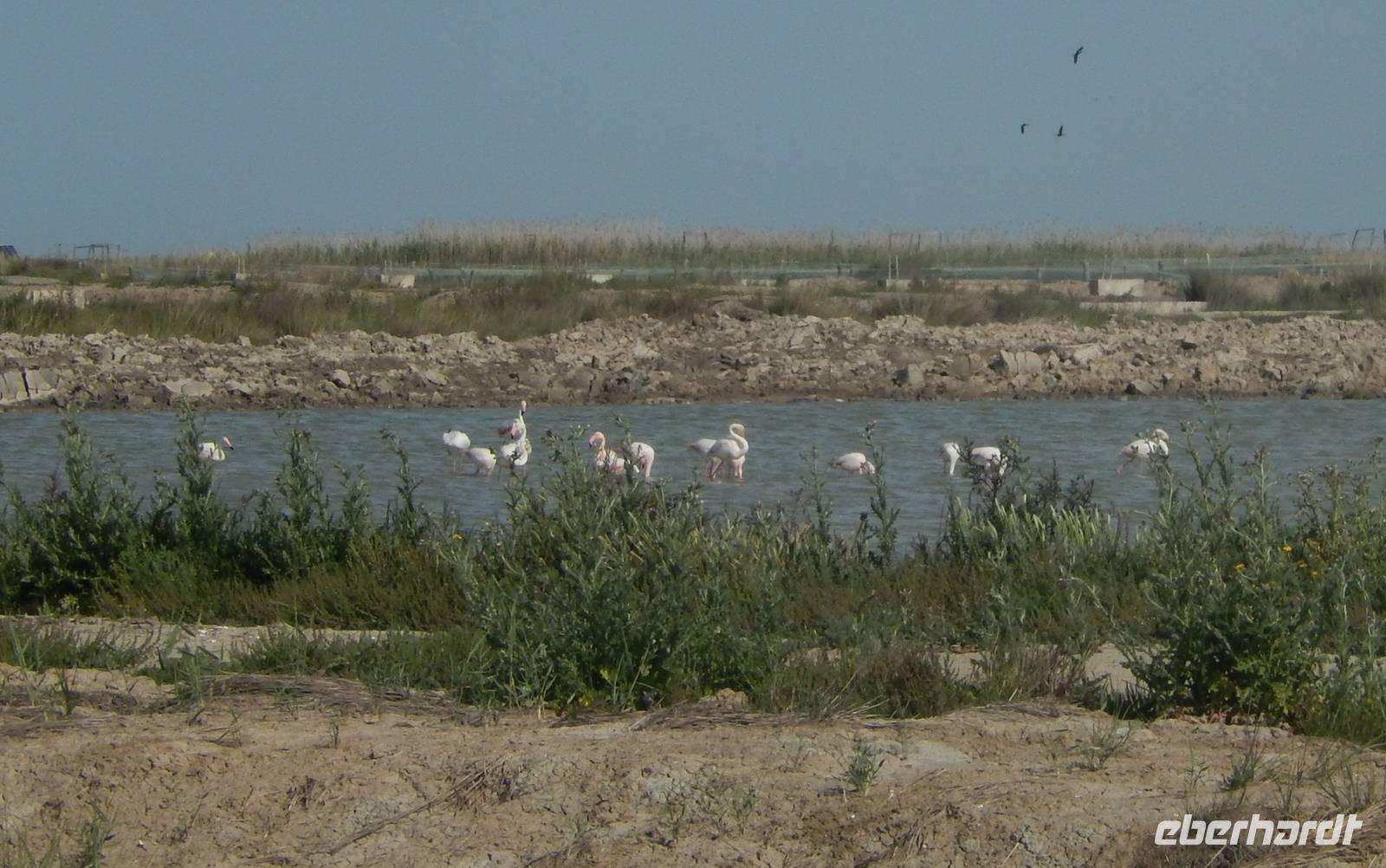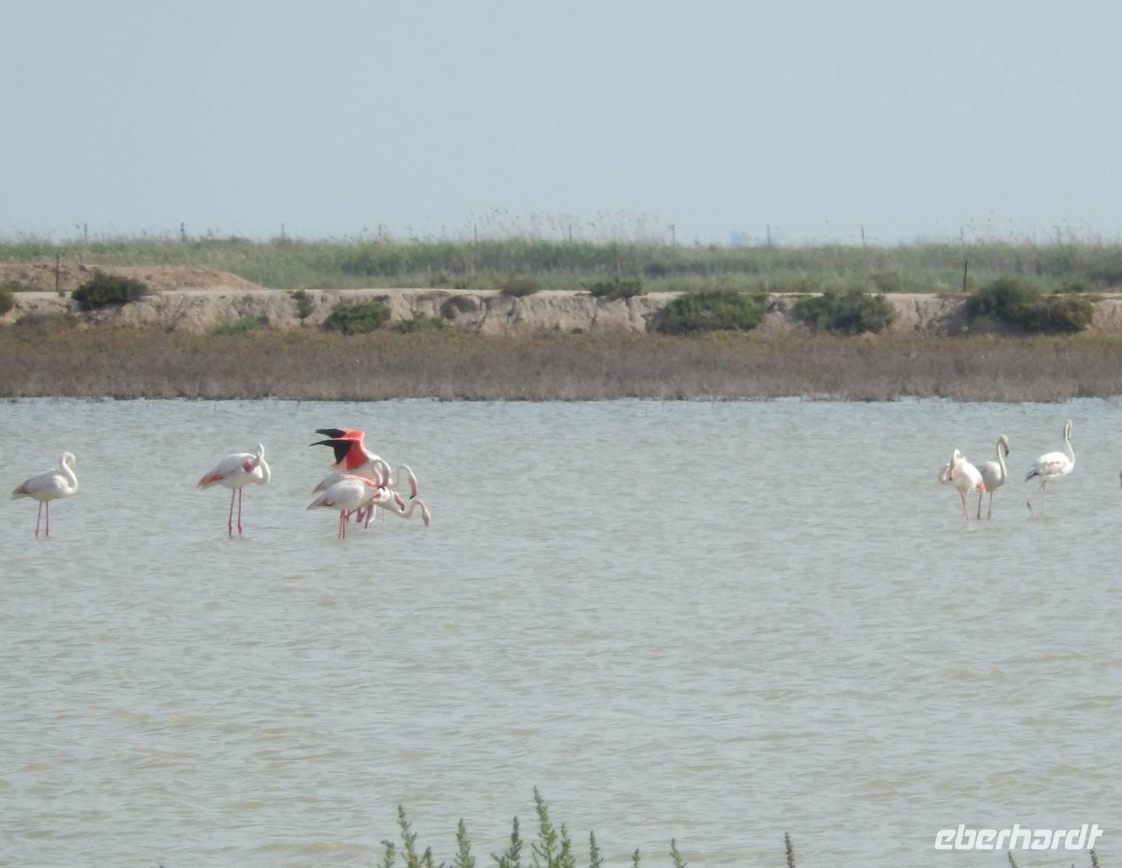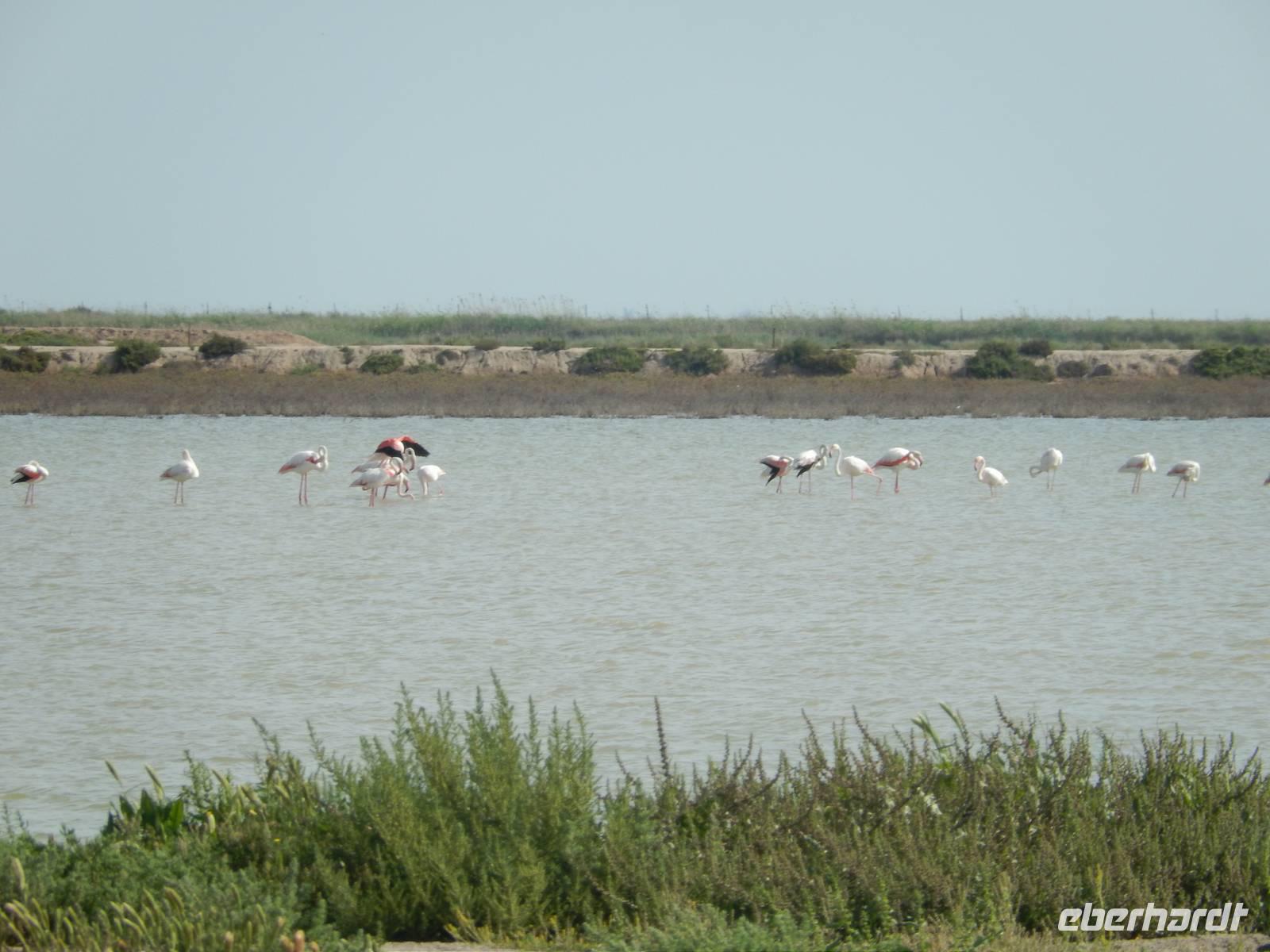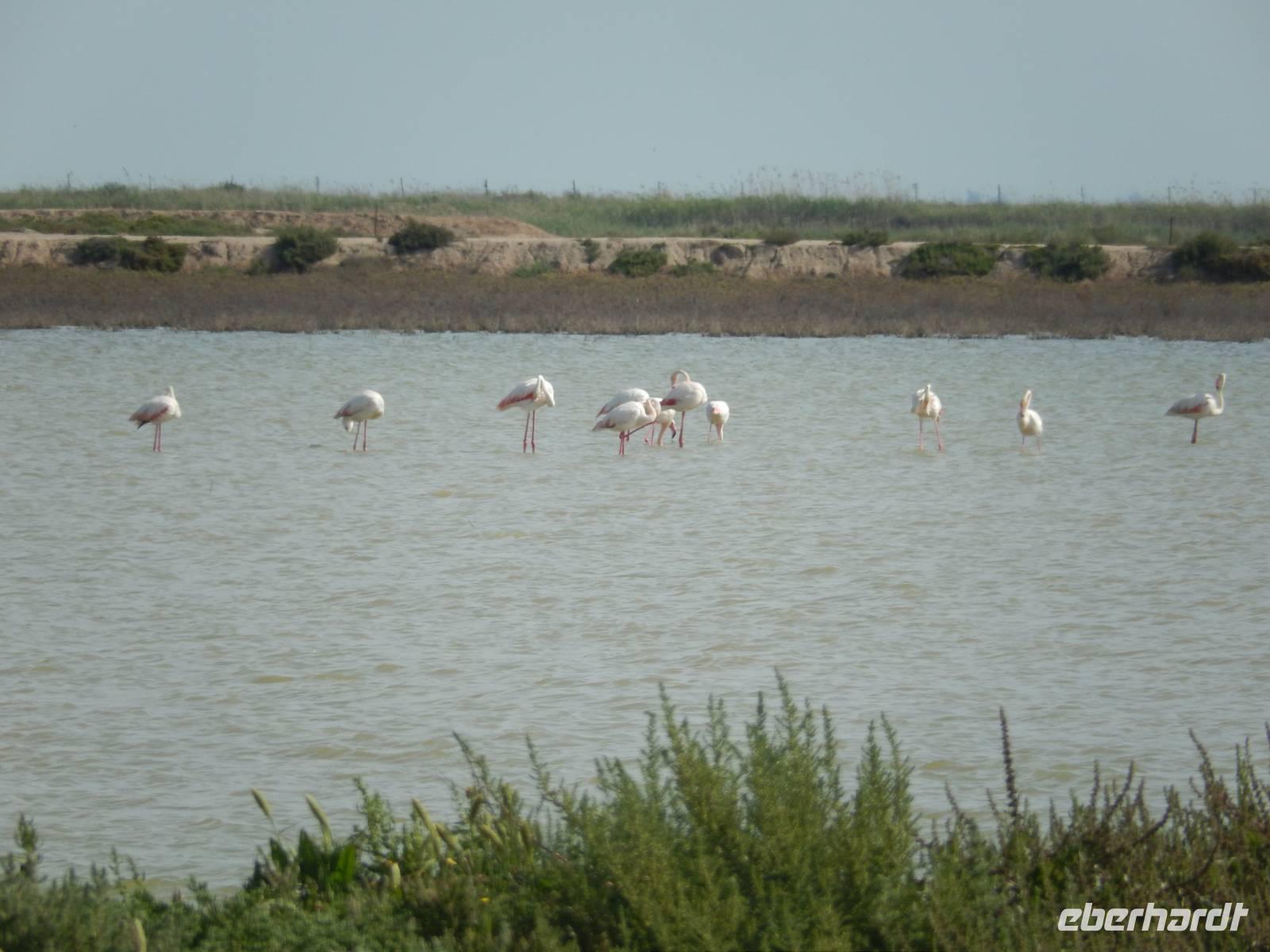 Auch für Benjamin als Spanier wird es hoch interessant, da er noch nie hier war. Der Nationalpark Donana besitzt eine vielfältige Fauna und ist Lebensraum vieler seltener Vogel- und Säugetierarten. Mit etwas Glück könnten wir hier überwinternde Zugvögel und andere Tiere beobachten. Und wir hatten Glück: es gab einige Familien von rosa Flamigos, die ganz ruhig auf dem Wasser waren. Als ein Hubschrauber über uns war, flogen auf einmal die Flamingos los, ein Anblick wie aus dem Bilderbuch. Dieses Bild werden wir wohl so schnell nicht wieder vergessen...