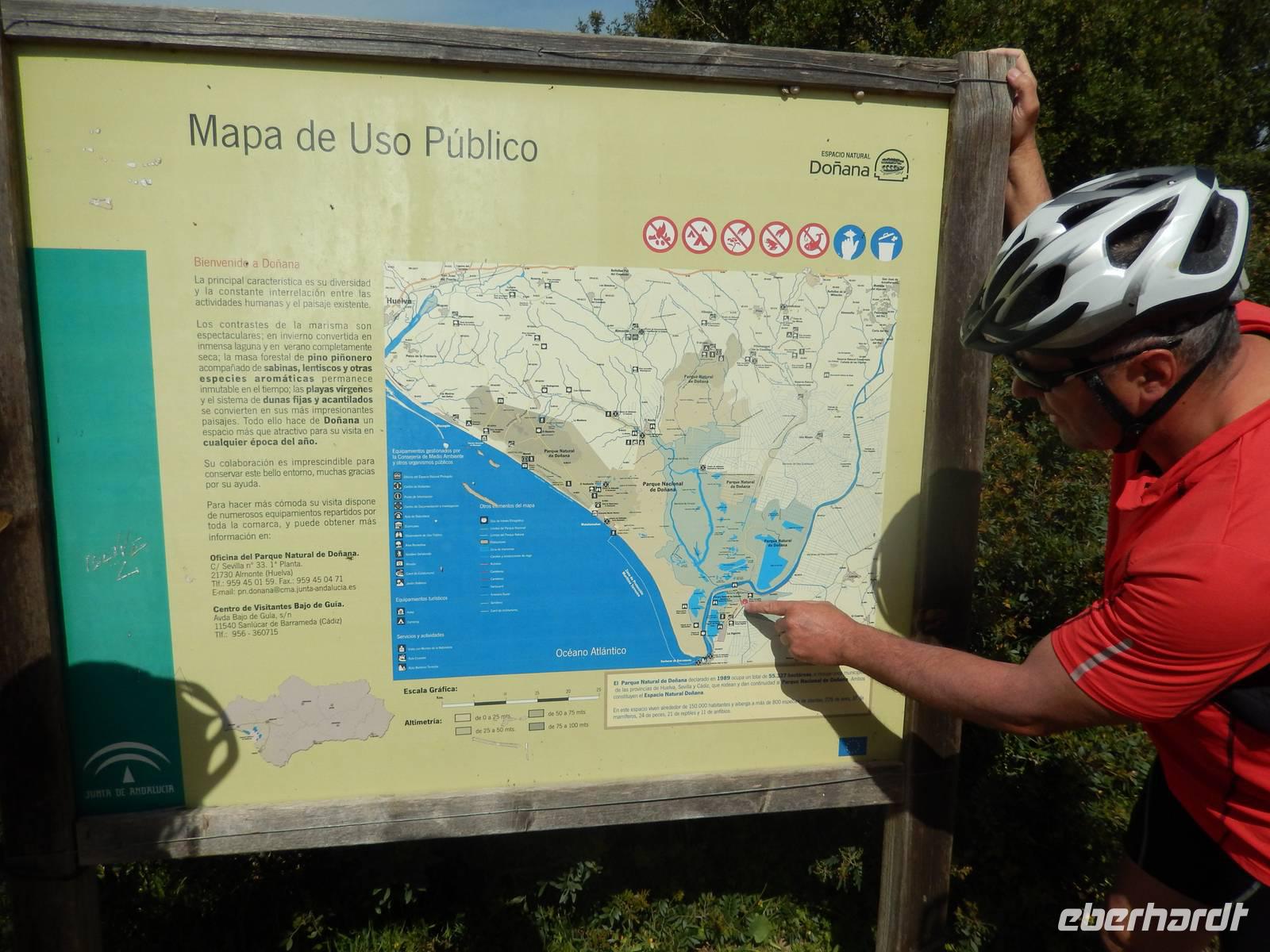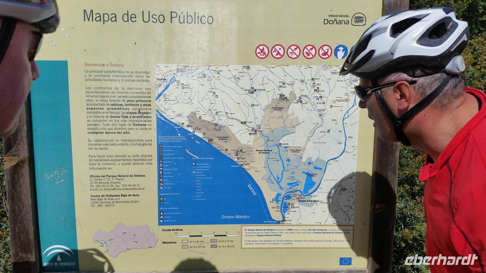Nach dem Frühstück fuhren wir mit dem Bus bis Trebujena, wo unsere heutige Radtour beginnt. Auf dem Weg hörten wir spanische Musik wie z.B. Rocio Jurado, die aus Chipiona stammt. Heute steht uns ein herrlicher Radweg bevor. Auf kleinen, wenig befahrenen Nebenstraßen radeln wir erst einmal circa 20 Kilometer im Donana Nationalpark. Gemeinsam mit Jens lernen wir den Nationalpark Donana, Spaniens wichtigstes Feuchtgebiet kennen.