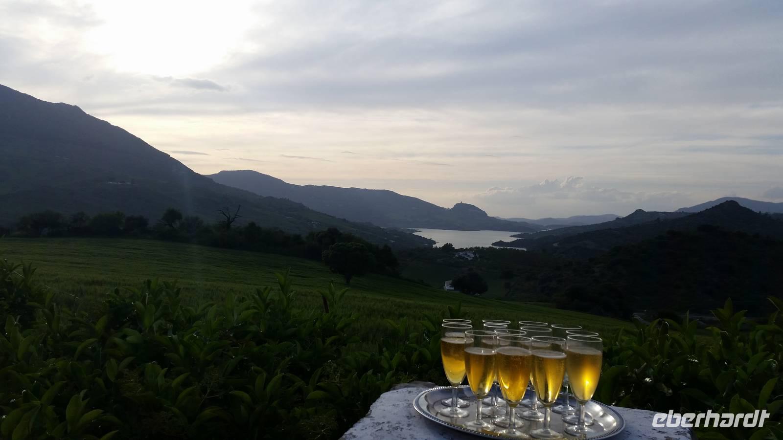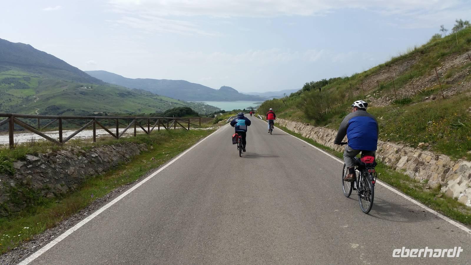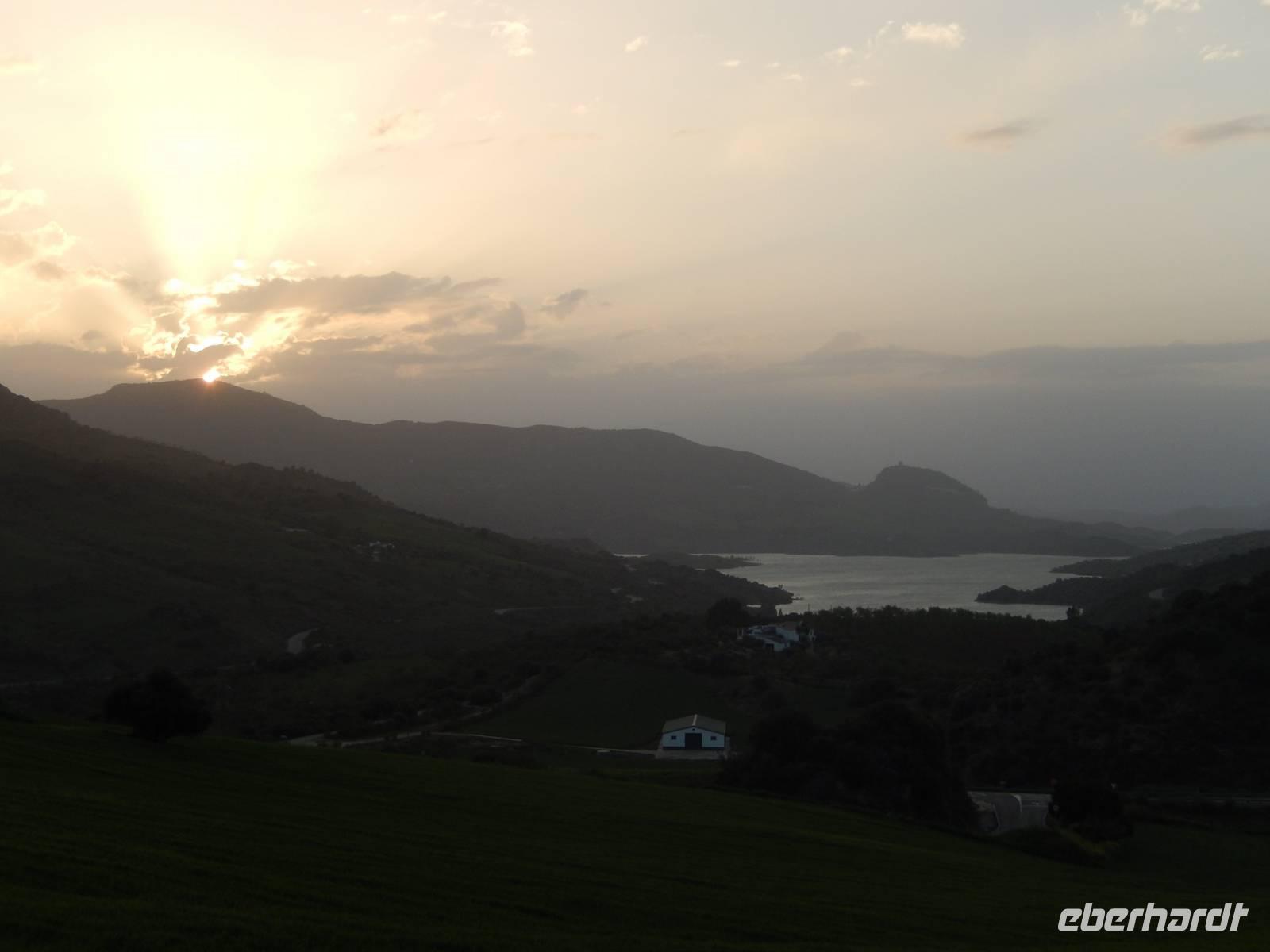Wir halten in Arcos de la Frontera wo wir mit Jens und Benjamin gemeinsam einen Spaziergang mit Kaffepause auf einer Terrasse machen. Weiter mit dem Bus geht es bis zum Bergdorf Benaocaz, wo wir die Räder ausladen und unsere heutige Radtour beginnen. Wir hatten bis hier her Glück mit dem Wetter, außer dem Wind heute ab und zu, der uns bergauf begleitete. Ca. 35 Kilometer müssen heute bewältigt werden. Durch grüne Täler umgeben von der romantischen Berglandschaft radeln wir durch den bekannten Kork- und Steineichenwald und genießen die vielfältige Flora und Fauna der Gegend. Dort irgendwo mitten in diesen Wäldern bereiten Jens und Benjamin ein herrliches Picknick, ohne Regen und mit gutem Wein vor. Als Nachtisch gab es heute wieder die leckeren mit Zucker gebackenen „Pestiños", die uns allen so gut schmeckten. Mit ausreichend Zeit und den Bus im Hintergrund radelten wir bergauf und bergab, bevor wir dann mit dem Rad zum Hotel einfach hinab rollen konnten. Mit einem See im Hintergrund und dem Sonnenuntergang vor uns hatten wir erst einmal ausreichend Zeit für etwas Ruhe.