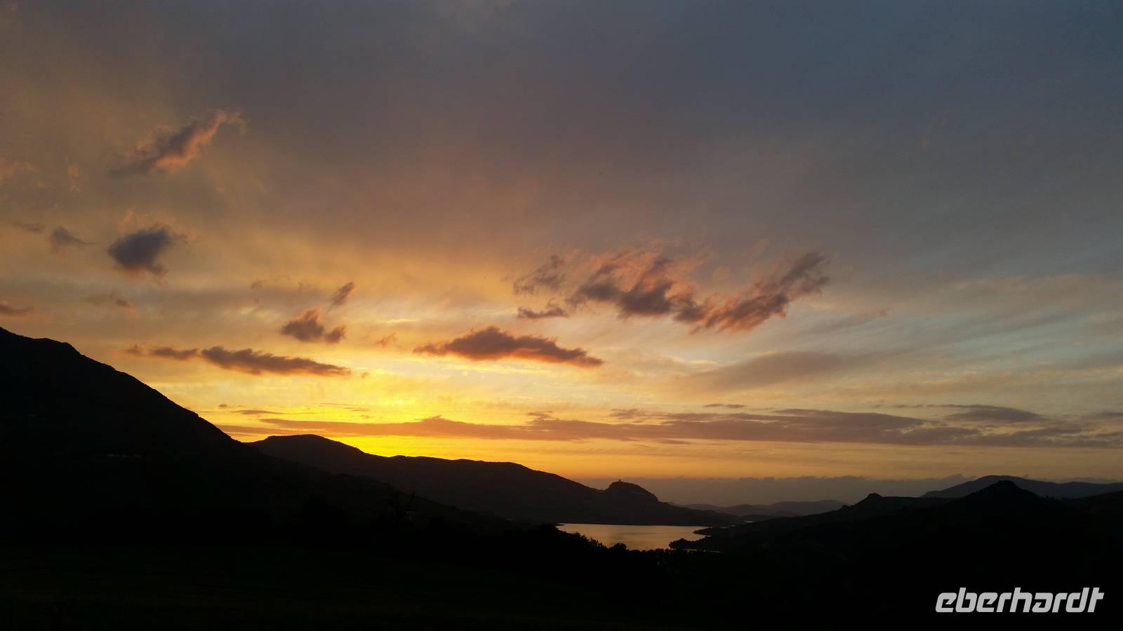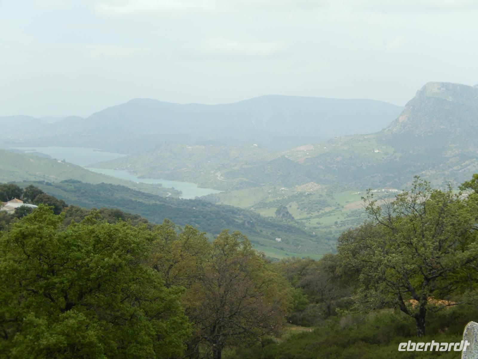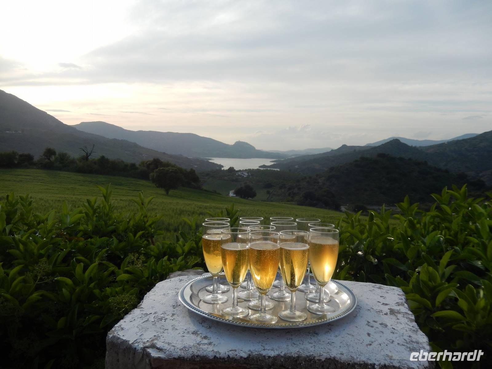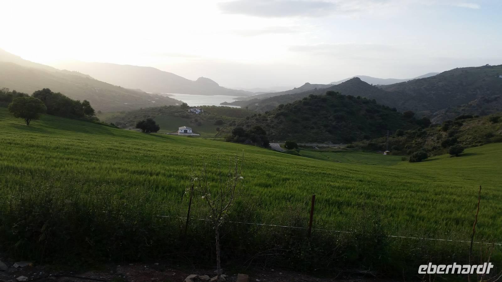 Wir halten in Arcos de la Frontera wo wir mit Jens und Benjamin gemeinsam einen Spaziergang mit Kaffepause auf einer Terrasse machen. Weiter mit dem Bus geht es bis zum Bergdorf Benaocaz, wo wir die Räder ausladen und unsere heutige Radtour beginnen. Wir hatten bis hier her Glück mit dem Wetter, außer dem Wind heute ab und zu, der uns bergauf begleitete. Ca. 35 Kilometer müssen heute bewältigt werden. Durch grüne Täler umgeben von der romantischen Berglandschaft radeln wir durch den bekannten Kork- und Steineichenwald und genießen die vielfältige Flora und Fauna der Gegend. Dort irgendwo mitten in diesen Wäldern bereiten Jens und Benjamin ein herrliches Picknick, ohne Regen und mit gutem Wein vor. Als Nachtisch gab es heute wieder die leckeren mit Zucker gebackenen „Pestiños", die uns allen so gut schmeckten. Mit ausreichend Zeit und den Bus im Hintergrund radelten wir bergauf und bergab, bevor wir dann mit dem Rad zum Hotel einfach hinab rollen konnten. Mit einem See im Hintergrund und dem Sonnenuntergang vor uns hatten wir erst einmal ausreichend Zeit für etwas Ruhe.