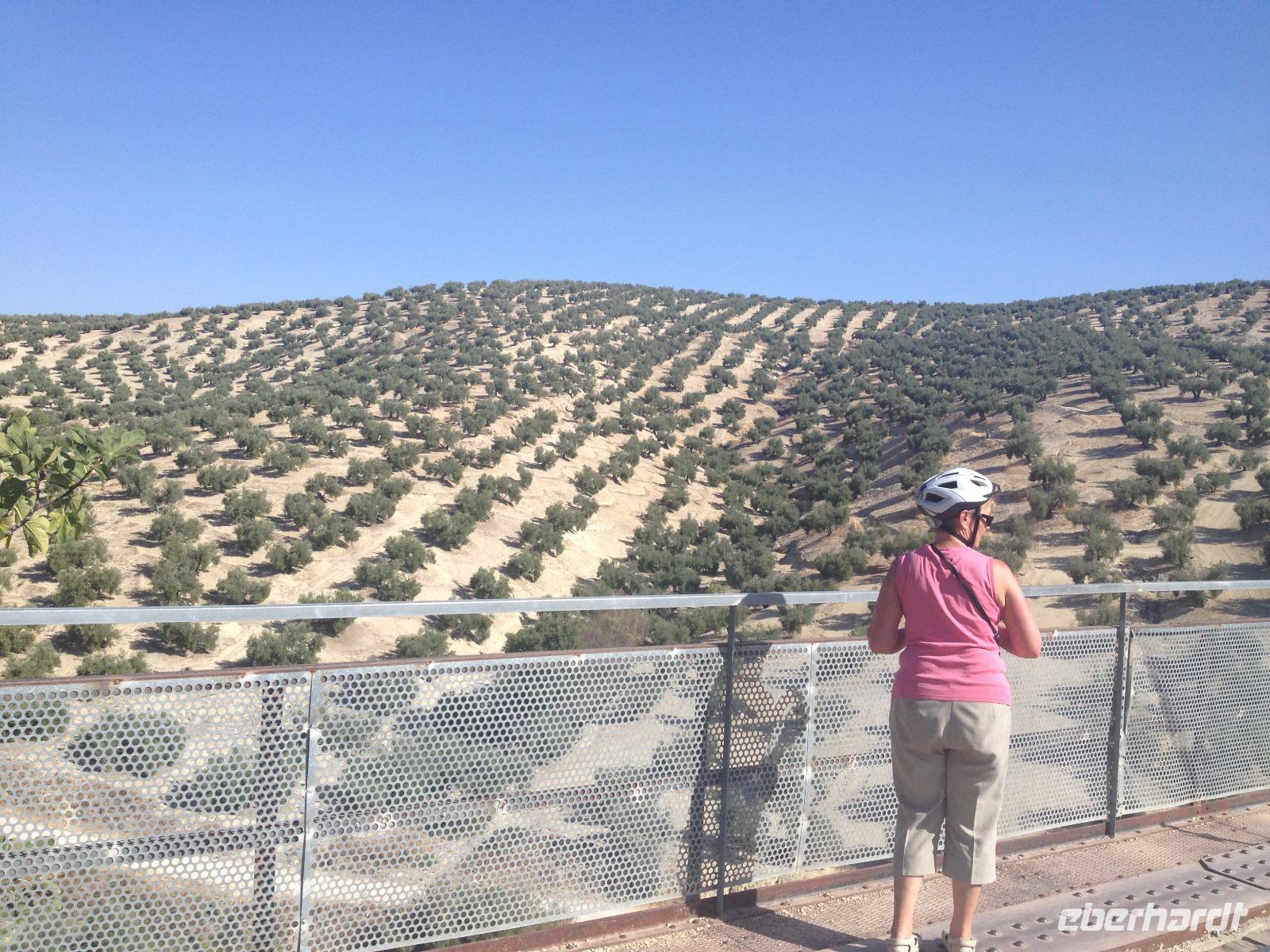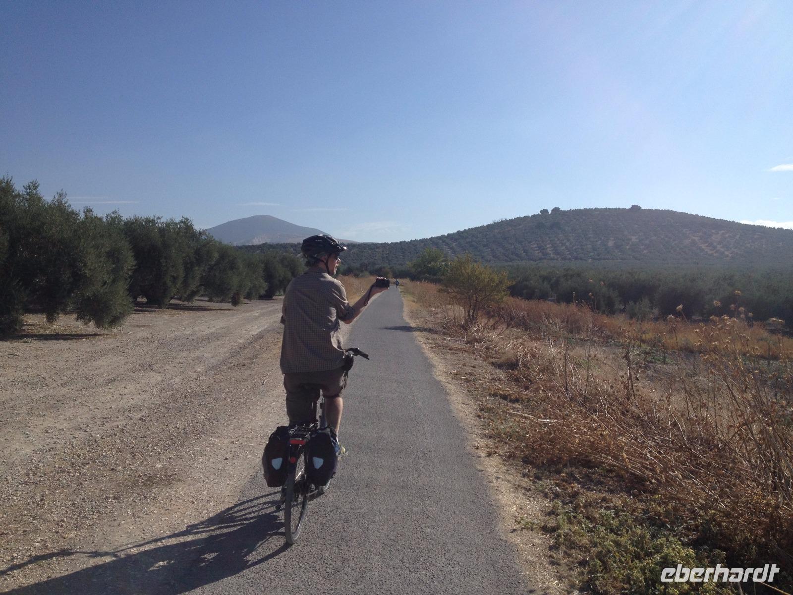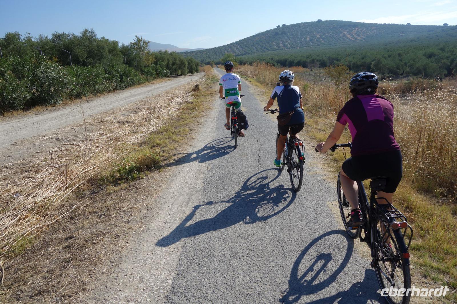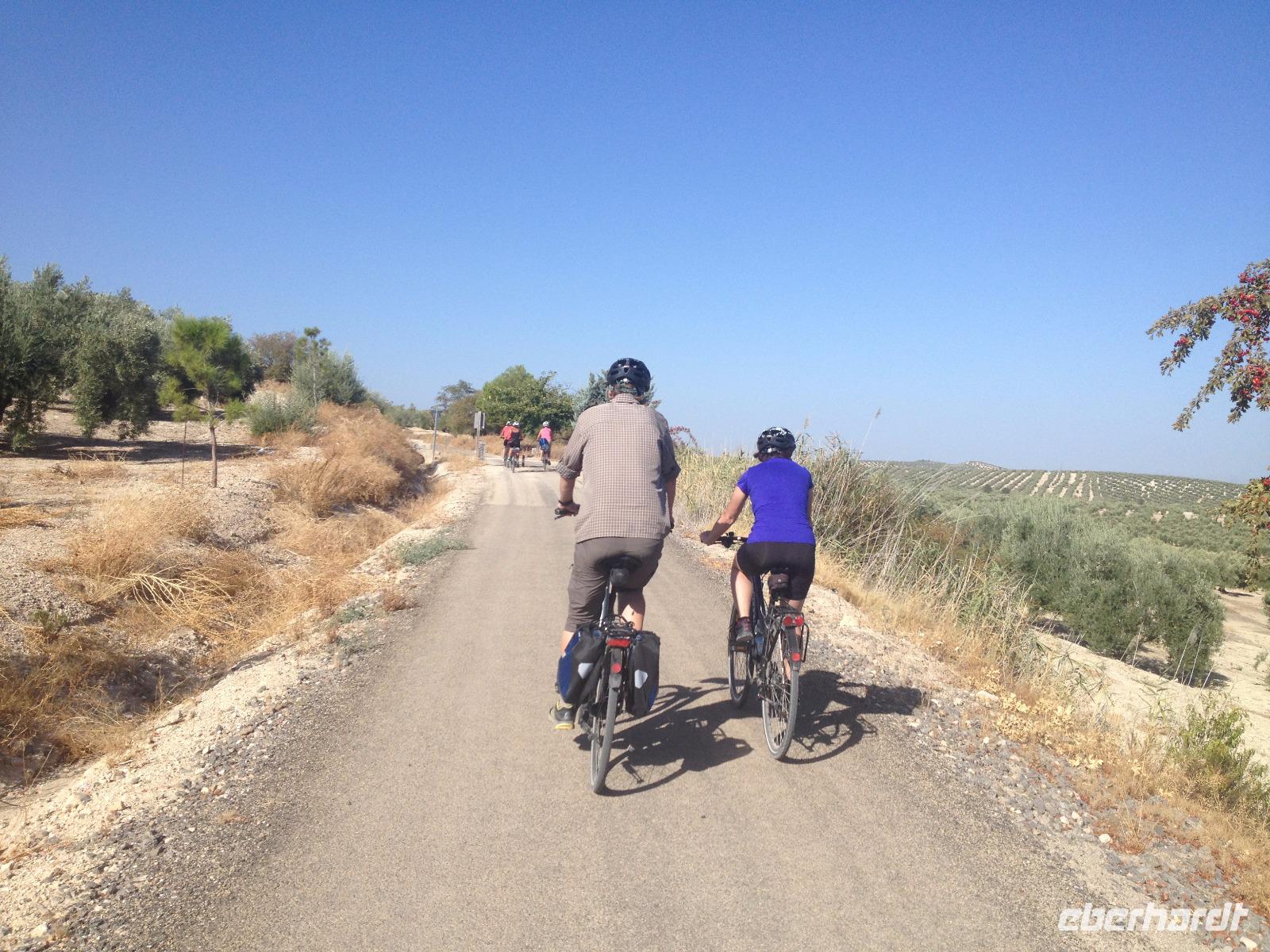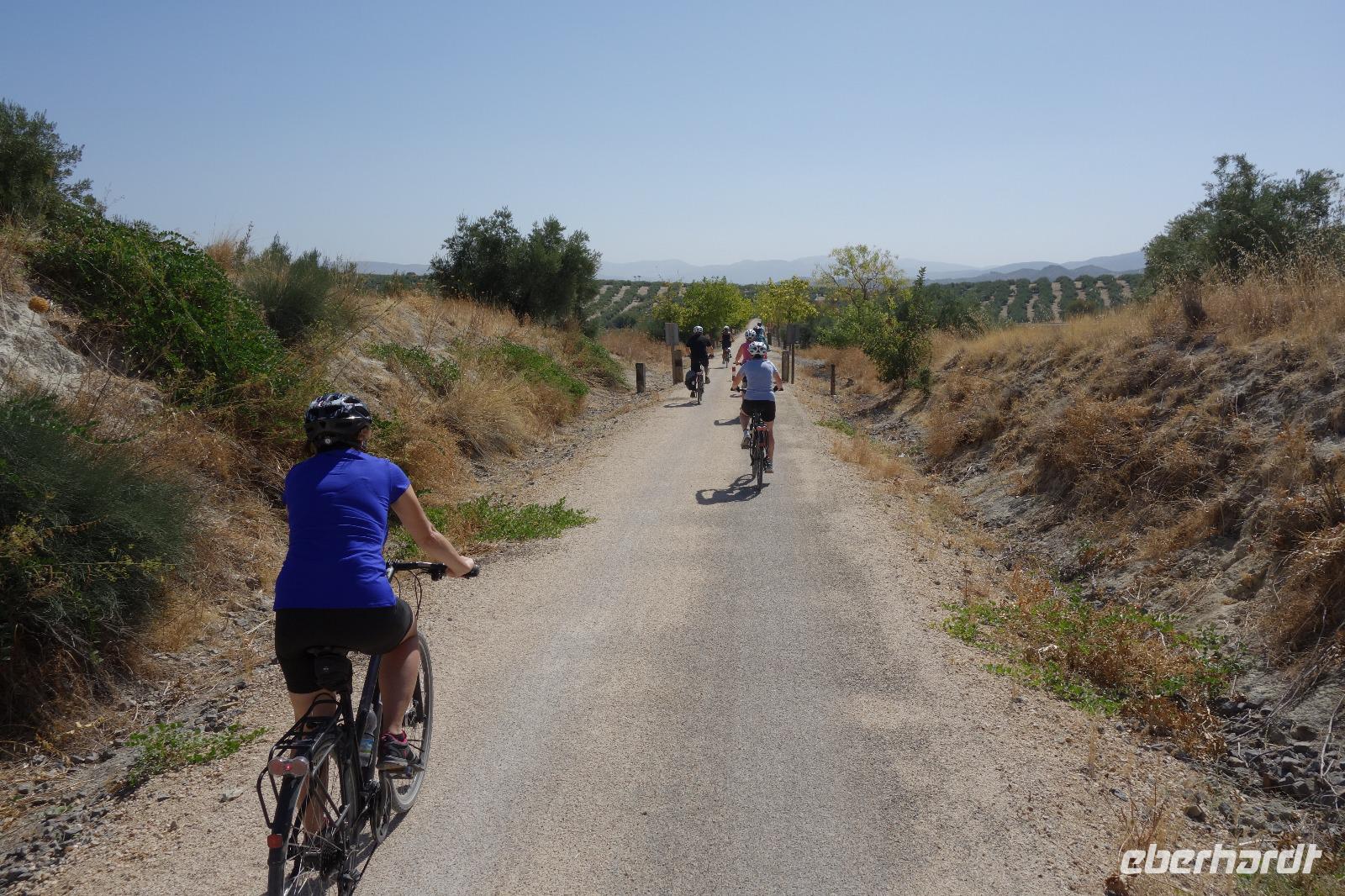Das Thema des Tages waren Oliven und Olivenöl. Wir fuhren nach Jaén, wo wir unsere Fahrräder ausluden. Dieses Mal führte unser Weg über den Vía Verde del Aceite. Dort fährt man über die großen Olivenbaumplantagen.