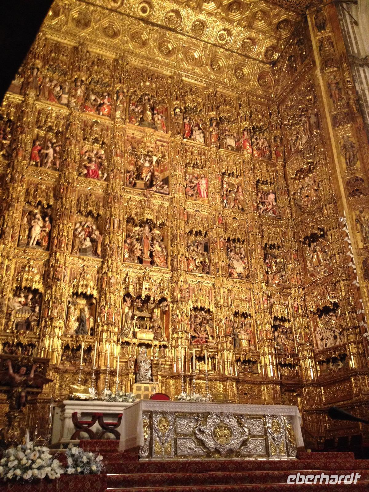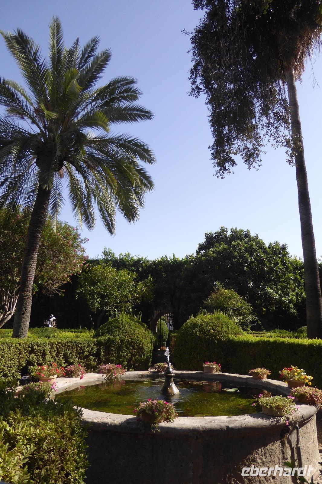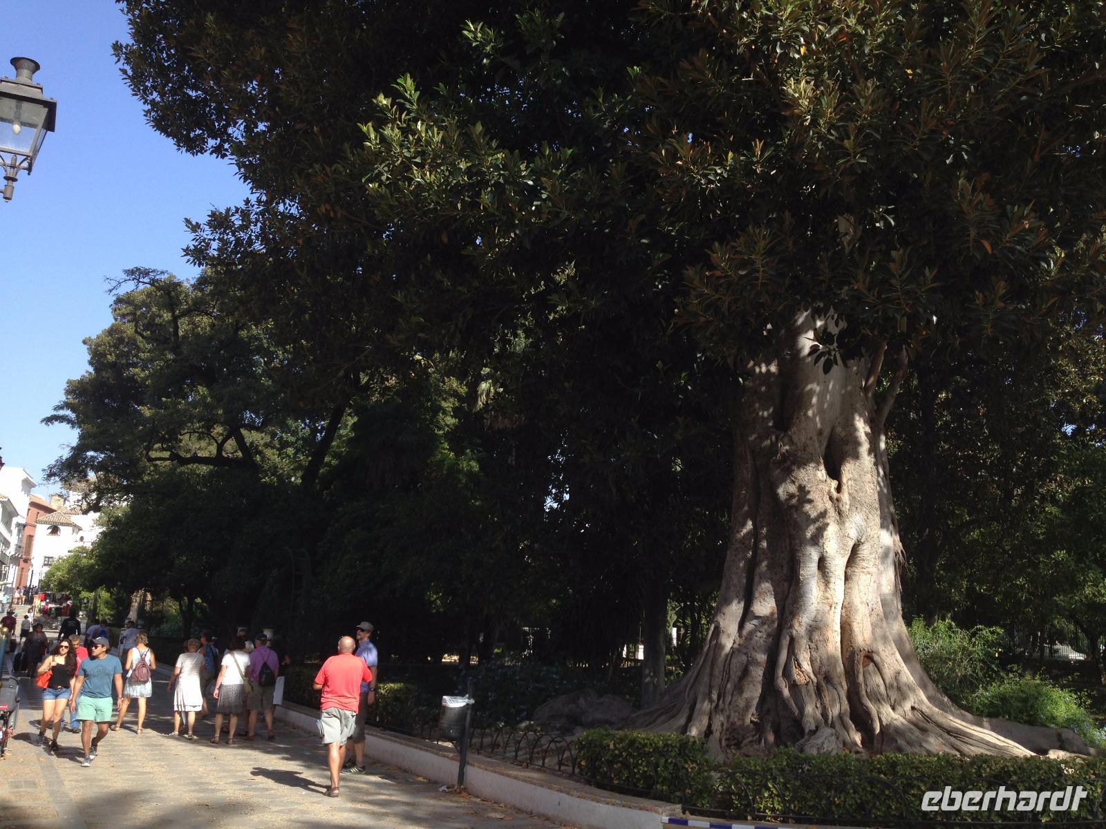 Zu Beginn stiegen wir bei dem Gebäude der iberoamerikanischen Ausstellung von 1929 aus: die Plaza de España. Die verschiedenen Türen repräsentieren die vier Königreiche und die anderen Provinzen Spaniens. Dann besuchten wir mit unserer örtlichen Reiseleiterin Diana die Jardines de Murillo, des bekannten gotischen Malers Sevillas. Dort habe ich einen Freund aus meinem Dorf getroffen und später in der Kathedrale auch eine Kollegin aus meiner Studienzeit in Málaga. Dies waren zwei tolle Überraschungen, die mich sehr gefreut haben und wie sagt man: die Leute aus Mijas (Málaga) sind auf der Welt, um eine Lächeln zu schenken.