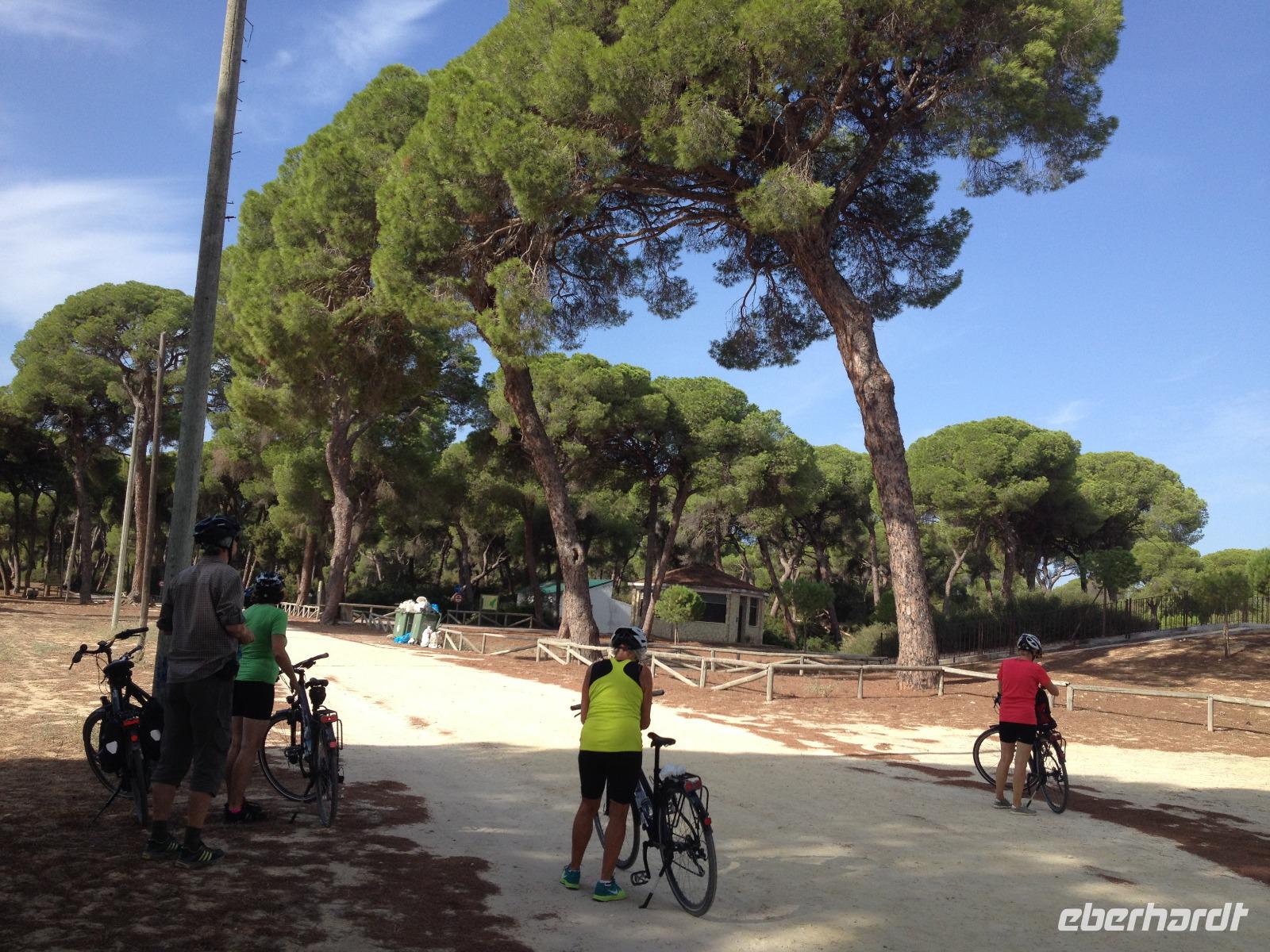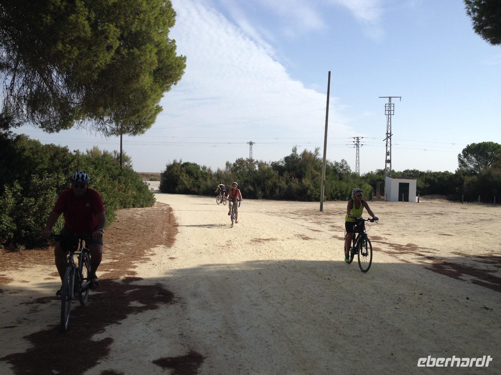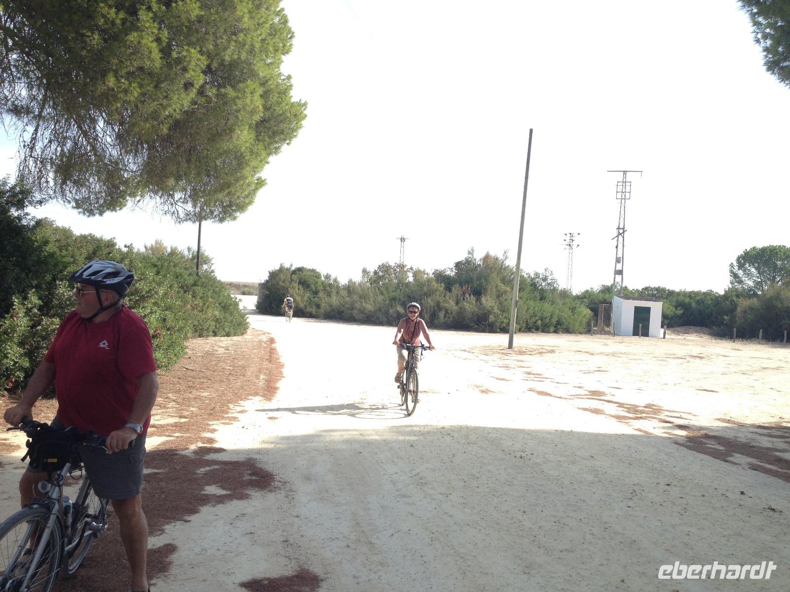 Aufgestanden mit der Brise des Atlantiks, ging es nach einem guten Frühstück los nach Trebujena. Dort begann unsere Radtour durch das Weingut bis zu den Sümpfen von Doñana. Hier machten wir einen Halt neben dem Bootssteg. Von da an fuhren wir an den verschiedenen Kanälen entlang und sahen sogar Flamingos, sowie andere Vogelarten.