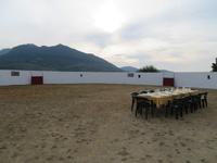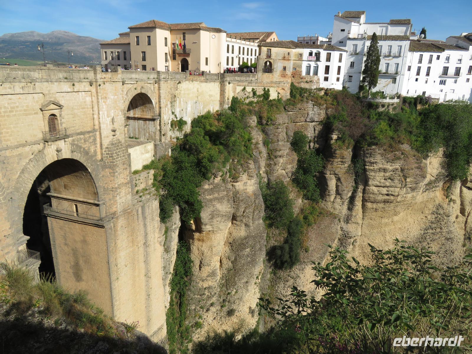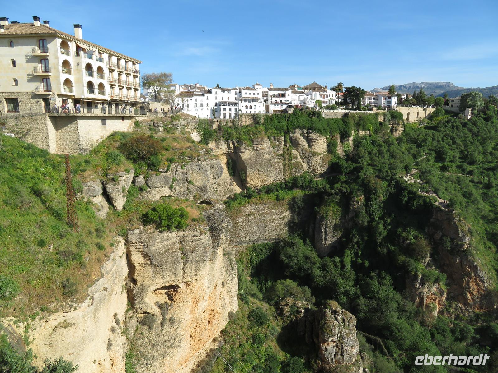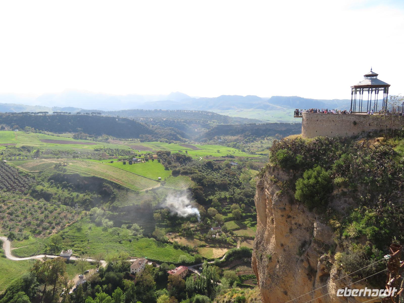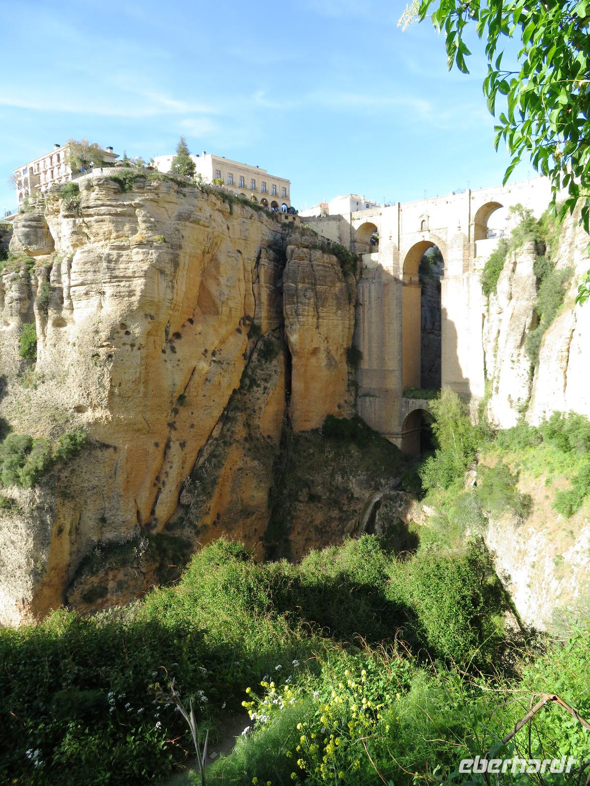 Hier bekommen wir von Juan den ersten Vino Blanco gereicht und nehmen die Taschen mit den Leckereien fürs Picknick entgegen. Wenig später werden die Köstlichkeiten an einem schattigen Plätzchen ausgebreitet und das Picknick beginnt. Wir sind nicht die Einzigen an diesem schönen Plätzchen, auch die einheimische Bevölkerung nutzt die Oase. Nachdem wir uns gestärkt haben, geht es auf und ab und über viele Serpentinen Richtung Hotel. Anschließend nutzen mutige die Freizeit für einen Sprung in den Pool, ehe es mit dem Bus Richtung Ronda geht. Hier empfängt uns Daniel, unser örtlicher Guide. Er bringt uns die Stadt Ronda näher und erklärt uns viel über den Stierkampf, der in dieser Region einen besonderen Status hat. Auch können wir einen atemberaubenden Blick auf die Brücke mit der hiesigen Stadt erhaschen. Im Anschluss speisen wir, wie es in Spanien typisch ist, auf der Straße und lassen uns die Tapas und den dazugehörigen Wein schmecken.