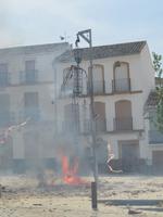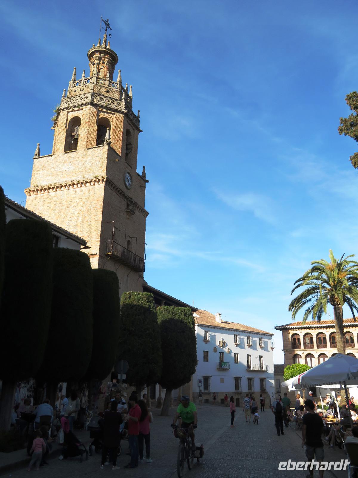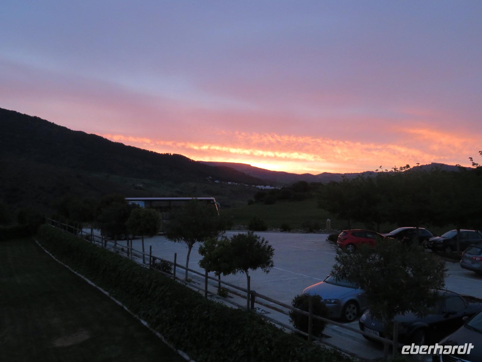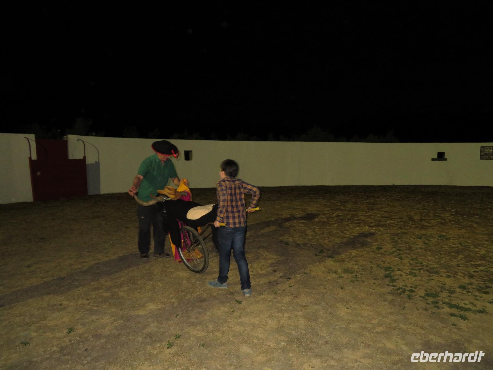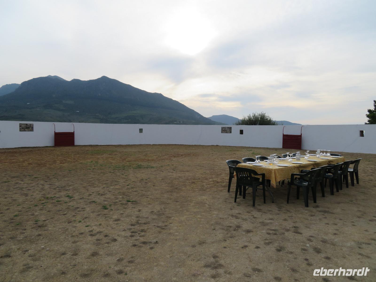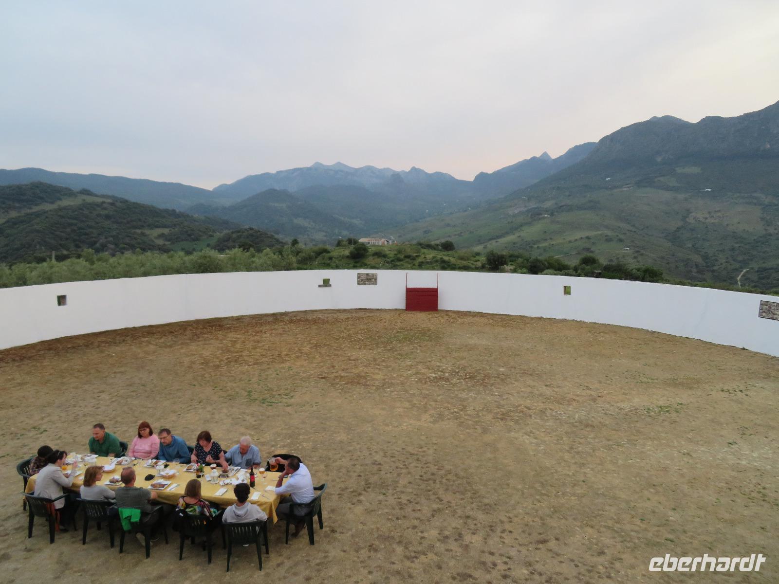 Nach dem Frühstück ging es erneut in Richtung Ronda. Hier sattelten wir die „Pferde" und es ging zunächst erst einmal nach oben. Es musste auch nach oben gehen, denn wir wollten zum „Puerto del Viento", welcher auf einer Höhe von 1190 Meter liegt. Nachdem wir den Punkt erreicht hatten, ging es größtenteils nur noch bergab zum weißen Dorf El Burgo. Hier empfing uns bereits Juan und meinte, wenn wir uns beeilen würden, könnten wir eventuell noch eine Zeremonie zum Osterfest sehen. Was allerdings bei dieser Zeremonie passierte, war uns allen nicht ganz klar und im Nachhinein betrachtet, war es immer noch verrückt, was dort veranstaltet wurde: In der Mitte war eine etwa vier Meter große Figur aufgebaut (Judas), die Donald Trump stark ähnelte. Ob dies gewollt war, bleibt an dieser Stelle unbeantwortet. Nachdem die Verantwortlichen leichte Knallkörper und Raketen zündeten, versuchte uns die Polizei von der Absperrung weg zu schicken. Hätte man alle Signale richtig gedeutet, wäre man auch weg gegangen. Denn die Fenster um die Puppe waren mit Holz vernagelt und die einheimische Bevölkerung stand weit weg von der Puppe und somit auch von der Absperrung. Nur eine kleine Gruppe deutscher Radtouristen und die Polizei befanden sich zu diesem Zeitpunkt in der ersten Reihe. Nachdem die erste Zündung nicht funktioniert hatte, zündeten die Verantwortlichen die Ladung erneut und nun erkannte man, was sie eigentlich vor hatten. Die vier Meter große Puppe war voll mir Raketen und Böllern. Nüchtern betrachtet sprengten sie ihren Dorfplatz. Ein ungeheuerlicher Lärm war zu vernehmen und wir nahmen unsere Beine in die Hand um uns von der Absperrung in Sicherheit zu bringen. Nach dem Ereignis war zum Glück das Picknick schon vorbereitet und wir konnten die neue skurrile Erfahrung mit einem Wein begießen. Dann ging es zurück zum Bus, welcher uns zurück in unser Hotel brachte. Am Abend wurde dann das Geheimnis gelüftet. Denn wir nahmen unser Abendbrot in einer Stierkampfarena ein. Das war schon ein tolles Ambiente in einer solchen Arena zu sitzen und der passen Sonnenuntergang gesellte sich auch noch dazu. Nach dem Nachtisch klopfte etwas an der Tür und es klang, als würde auch irgendwas schnaufen. Plötzlich, wie aus dem Nichts, tauchte ein „Stier" auf. Doch der Stier hatte die Rechnung ohne unseren kleinen Torero gemacht und so hatten wir ihn schnell gebannt und brachten ihn anschließend zurück in sein Gehege.