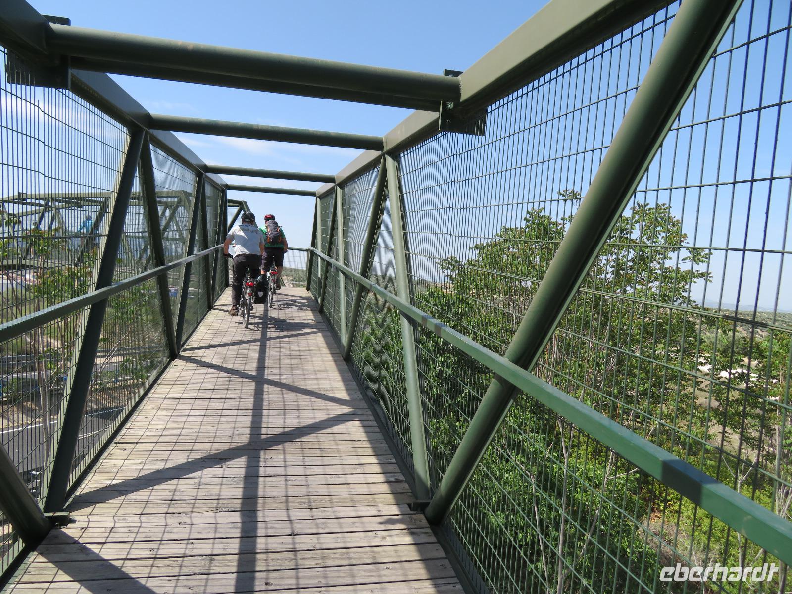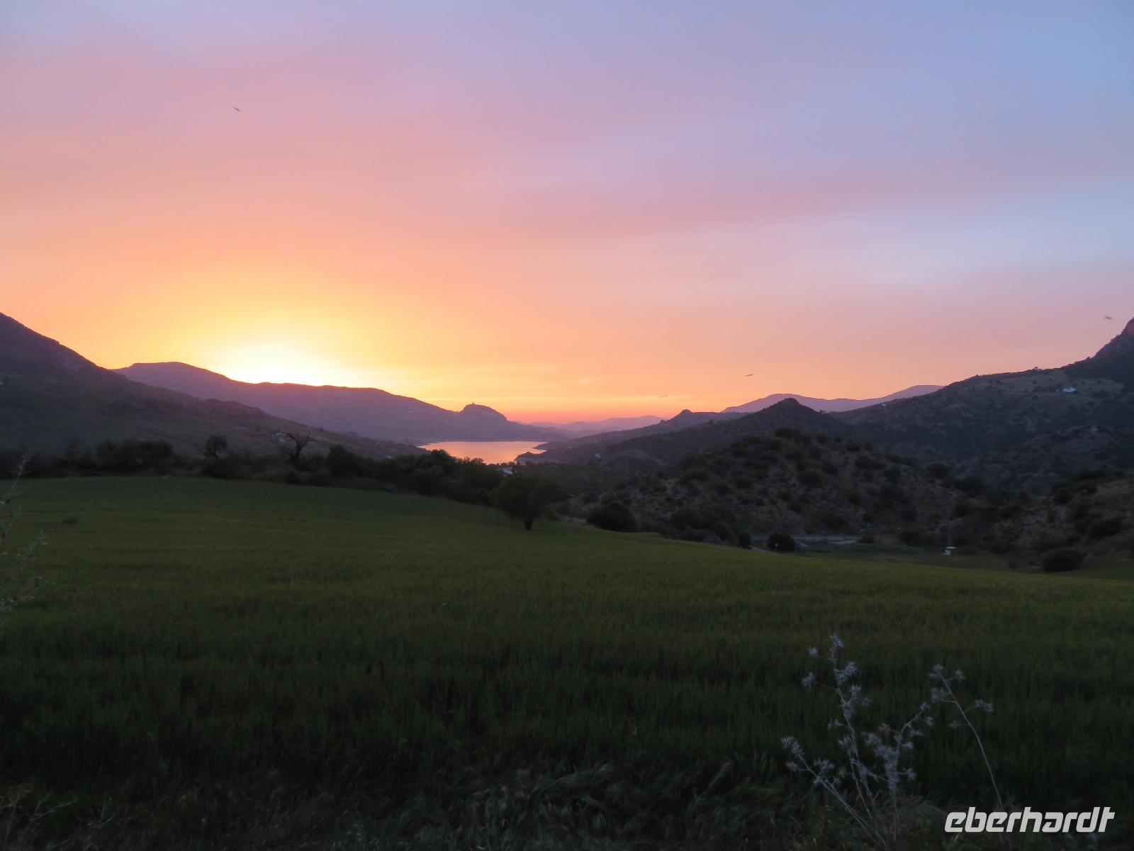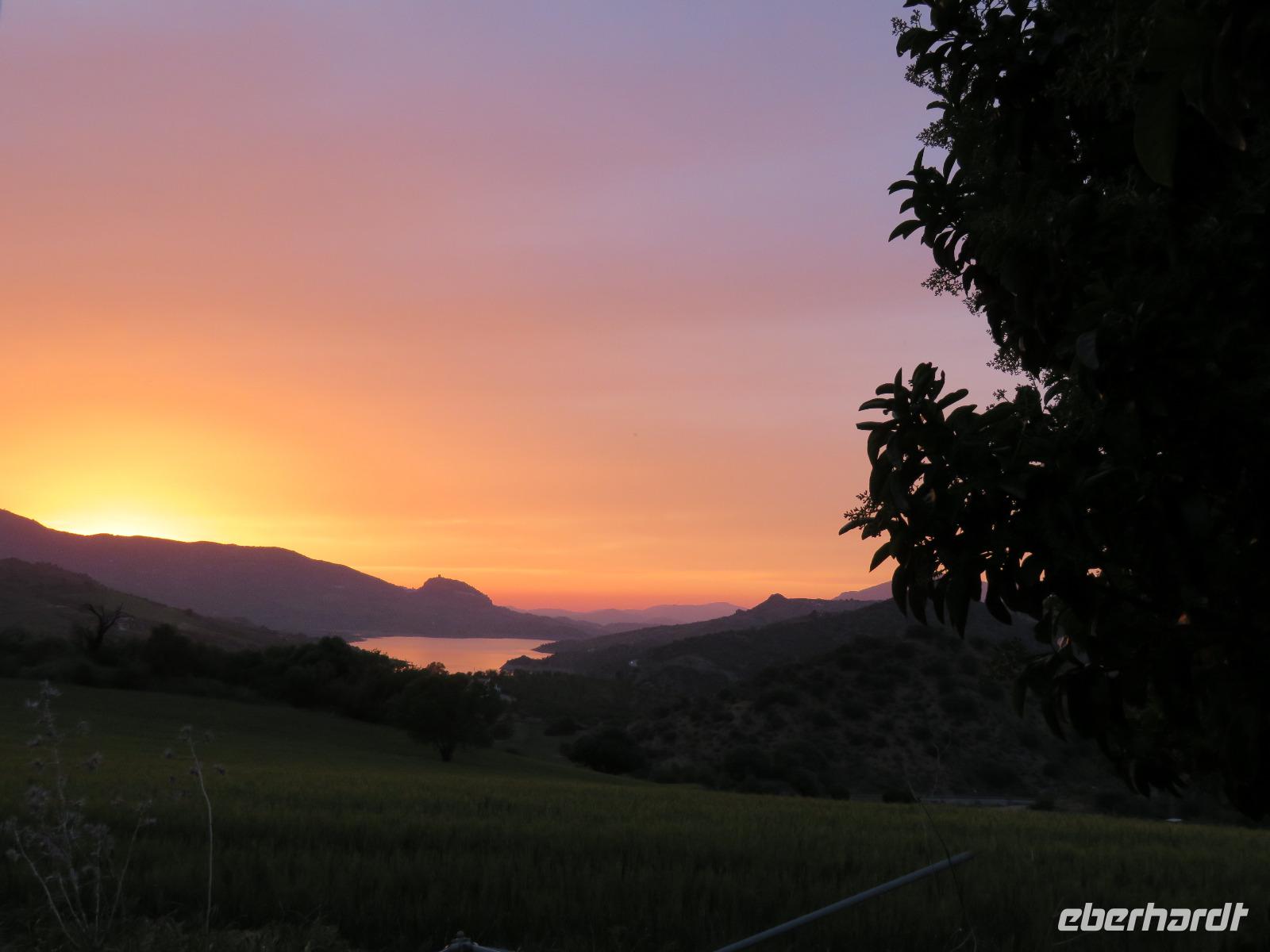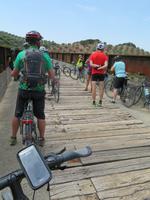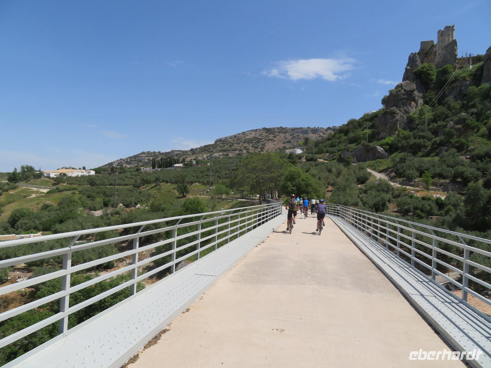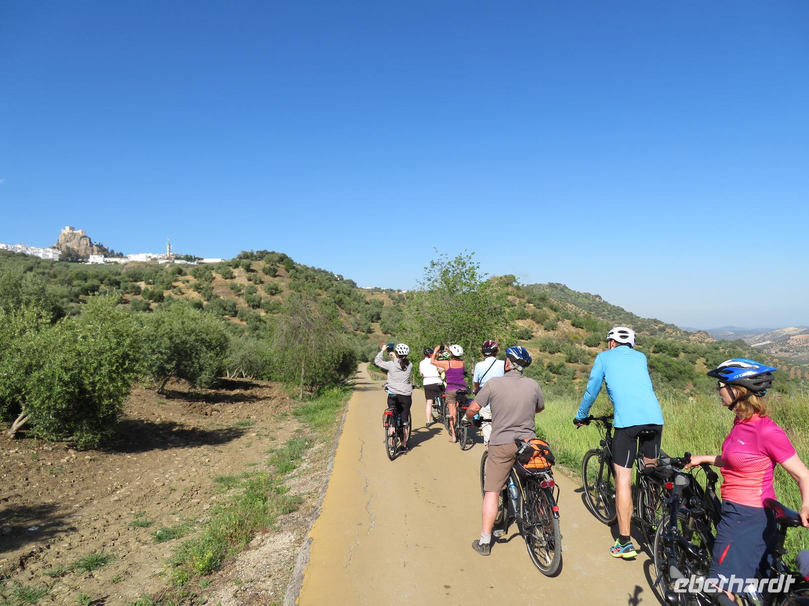 Die heutige Fahrradstrecke zählt zu den Höhepunkten der Via Verde. Start ist in Olvera und man sieht schon von weitem die erhabene Burg. Der Radweg ist heute bestens ausgebaut und es geht auf ehemaligen Bahntrassen gefühlt die ganze Zeit leicht nach unten. Insgesamt durchfahren wir mindestens 27 Tunnel und überqueren mehrere Viadukte. Die Radtour ist traumhaft, da es wie schon vorher beschrieben, eigentlich immer leicht nach unten geht und die Bahntrasse nur für Radfahrern und Fußgänger frei gegeben ist. Nach ungefähr 36 km kommen wir am Bahnhof Puerto de la Serrano an. Hier wartet bereits Juan mit dem Picknick auf uns. Da das Wetter, wie auch die letzten Tage, hervorragend ist, entscheiden wir uns direkt ins Hotel zu fahren. Dieses liegt direkt am Strand und lädt daher zum Baden im Meer förmlich ein.
