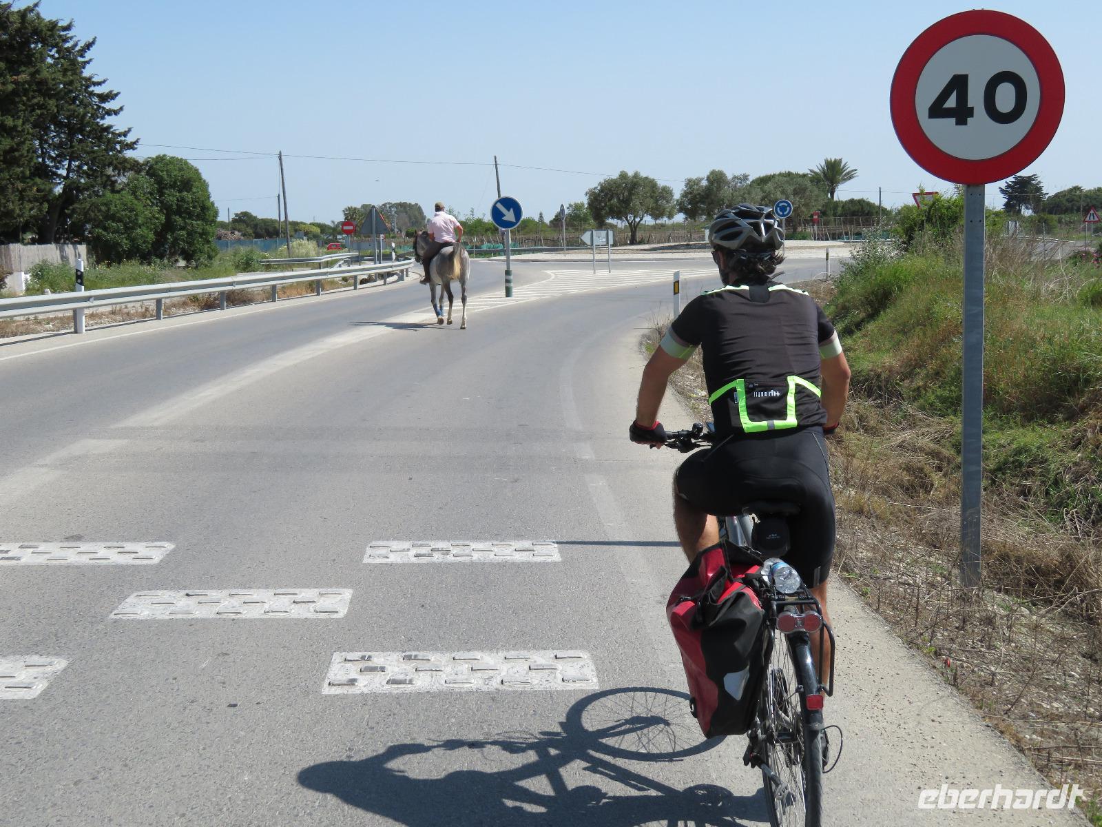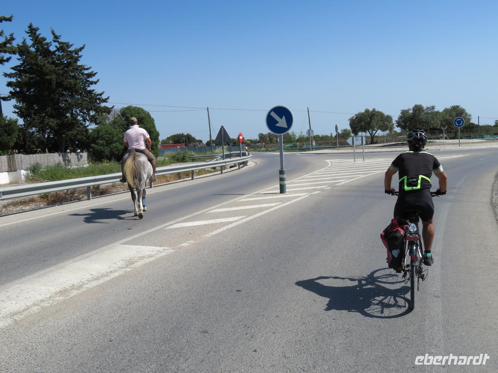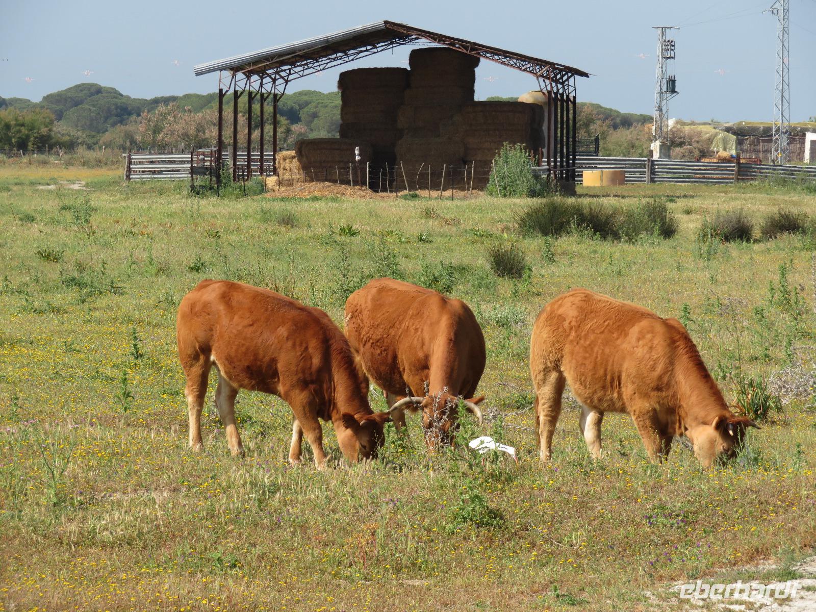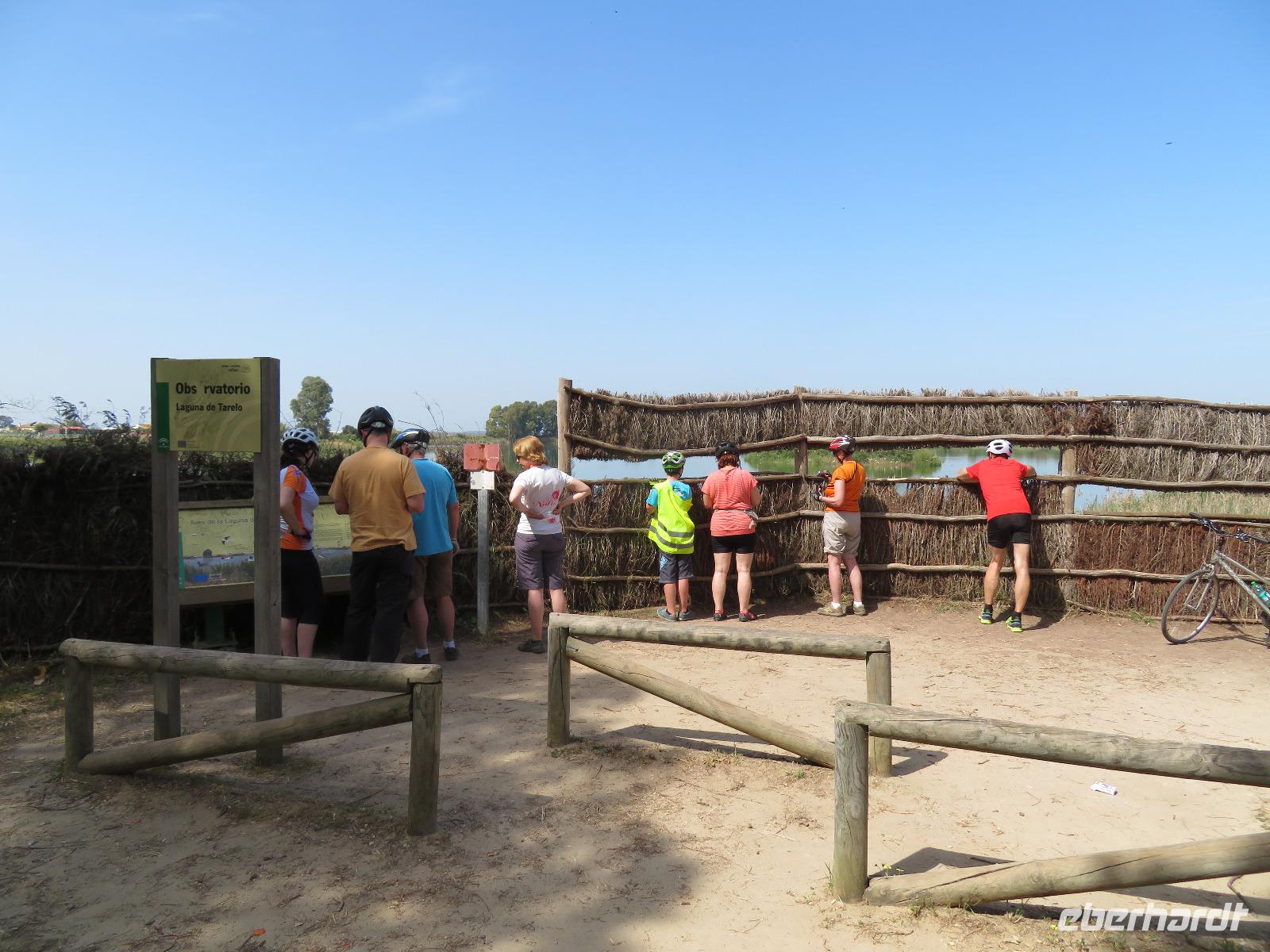 Nach dem Frühstück starten wir gegen 9:30 Uhr nach Trebujena. Hier laden wir die Fahrräder aus und kommunizieren mit dem Pfau. Nachdem dieser uns eine gute Fahrt gewünscht hat, geht es los Richtung Nationalpark Donana. Man wundert sich, wie in dieser offensichtlichen Trockenheit der Wein so gut aussehen kann. Vladimir erklärt uns, dass es an dem kalkhaltigen Boden liegt, welcher die Feuchtigkeit sehr gut speichern kann. Nachdem wir den Nationalpark durchquert haben, geht es über eine Straße quer durch Gemüsefelder zur Bodega Yuste. Hier lernen wir, zunächst nur mit den Ohren, etwas über den hiesigen Weinanbau. Nach der Theorie folgt glücklicherweise auch die Praxis und die Nase und der Mund vervollständigen das Wissen über die drei unterschiedlichen Tropfen. Nach der Verkostung spaltet sich die Truppe und der eine Teil fährt mit dem Bus zurück und der andere Teil fährt mit dem Fahrrad die 17 km zurück zum Hotel. Damit haben wir die längste Radstrecke der Tour gemeistert und konnten beim Buffet eine extra Runde ohne schlechtes Gewissen drehen.