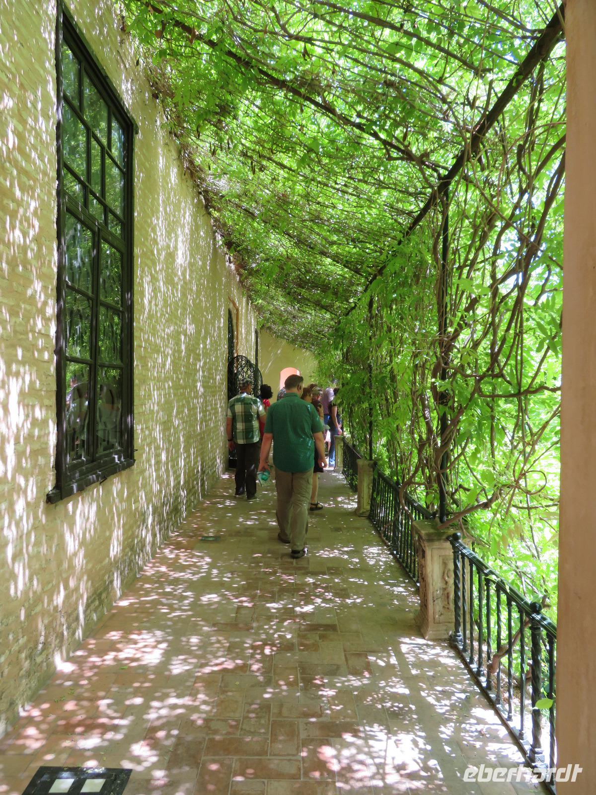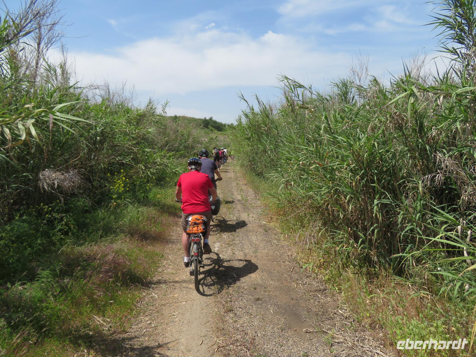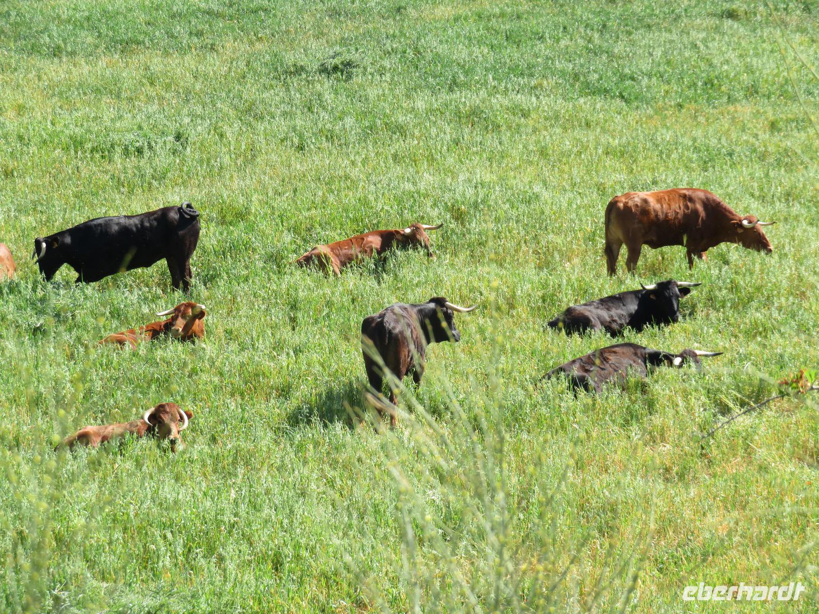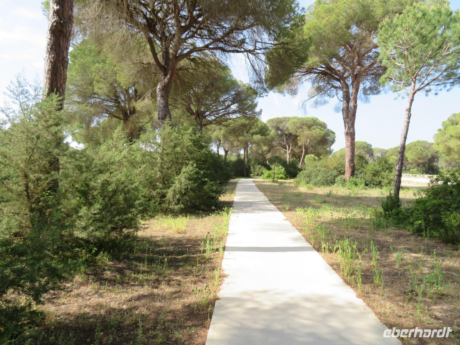 Nach dem Frühstück starten wir gegen 9:30 Uhr nach Trebujena. Hier laden wir die Fahrräder aus und kommunizieren mit dem Pfau. Nachdem dieser uns eine gute Fahrt gewünscht hat, geht es los Richtung Nationalpark Donana. Man wundert sich, wie in dieser offensichtlichen Trockenheit der Wein so gut aussehen kann. Vladimir erklärt uns, dass es an dem kalkhaltigen Boden liegt, welcher die Feuchtigkeit sehr gut speichern kann. Nachdem wir den Nationalpark durchquert haben, geht es über eine Straße quer durch Gemüsefelder zur Bodega Yuste. Hier lernen wir, zunächst nur mit den Ohren, etwas über den hiesigen Weinanbau. Nach der Theorie folgt glücklicherweise auch die Praxis und die Nase und der Mund vervollständigen das Wissen über die drei unterschiedlichen Tropfen. Nach der Verkostung spaltet sich die Truppe und der eine Teil fährt mit dem Bus zurück und der andere Teil fährt mit dem Fahrrad die 17 km zurück zum Hotel. Damit haben wir die längste Radstrecke der Tour gemeistert und konnten beim Buffet eine extra Runde ohne schlechtes Gewissen drehen.