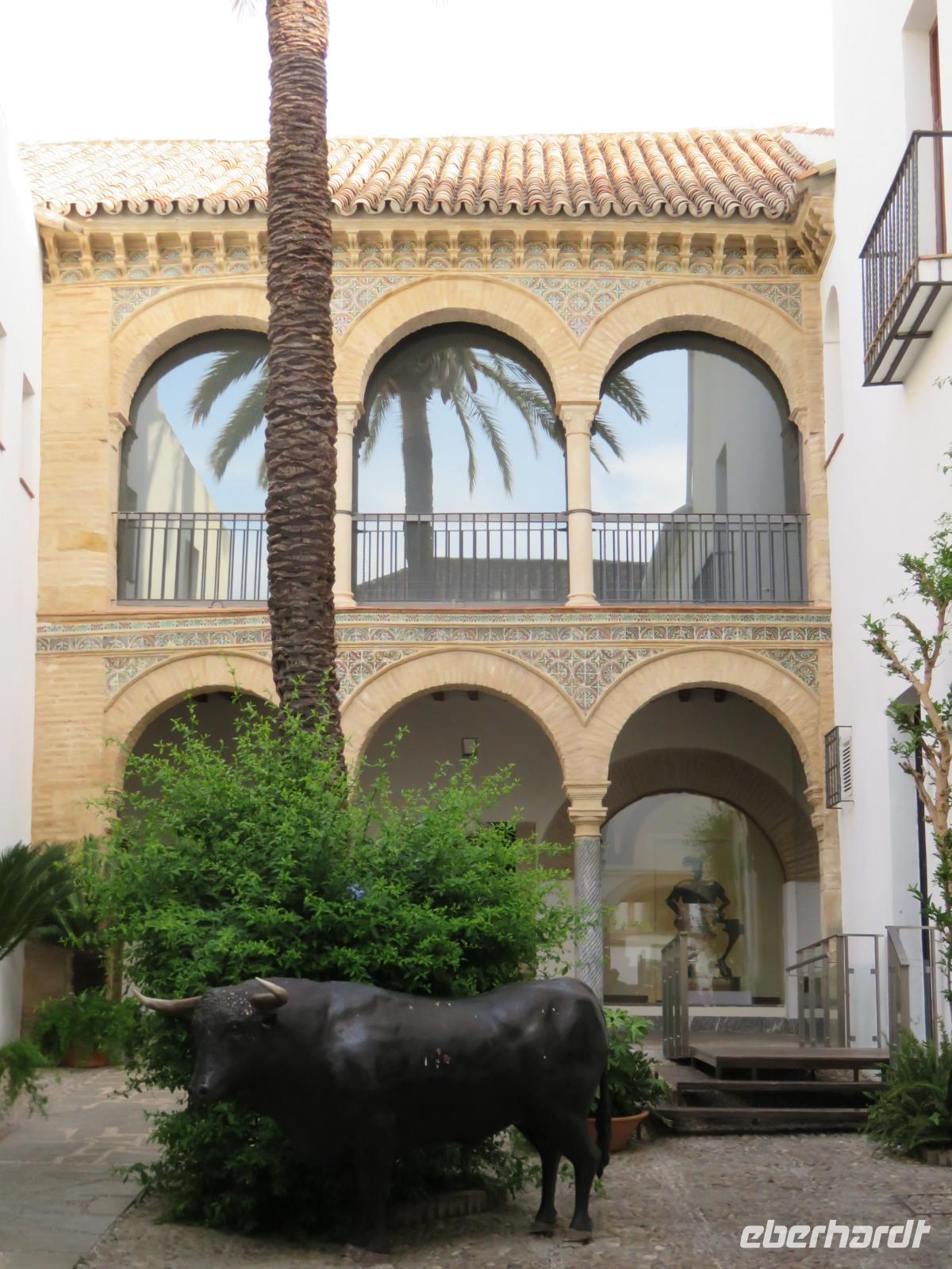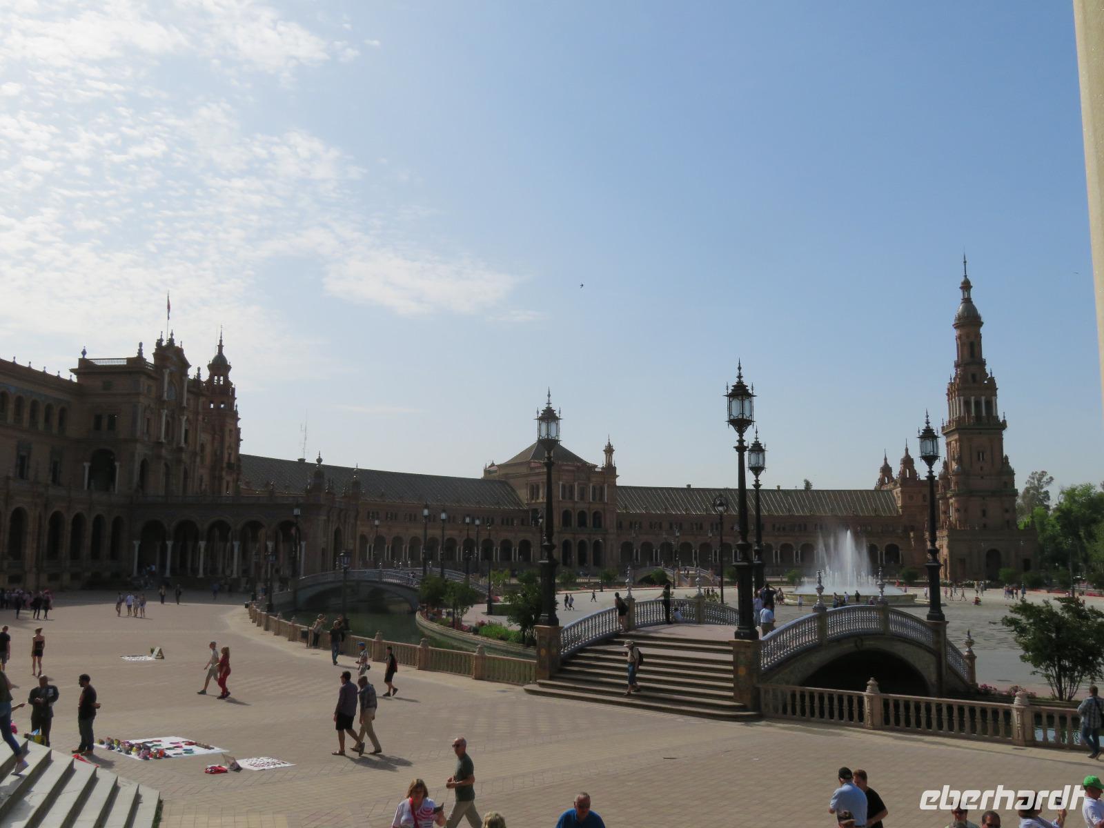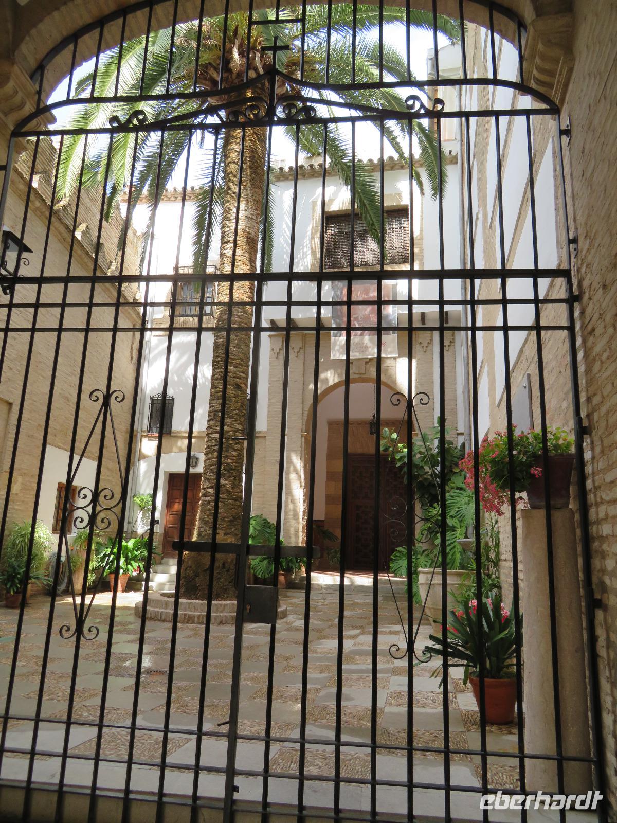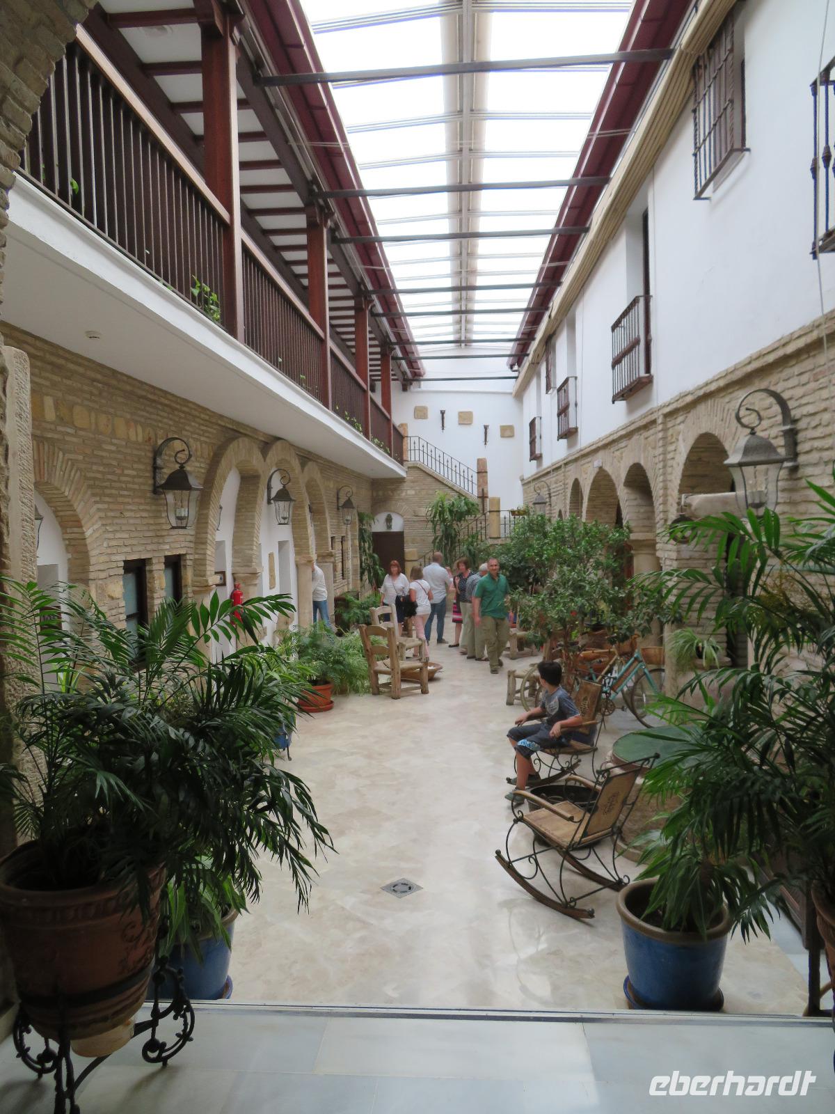 Heute blieben die Fahrradsachen im Koffer, denn es ging nach Sevilla. In Sevilla führte uns Carlos, unser örtlicher Reiseleiter durch die schicke Stadt. Zunächst starteten wir an der Plaza Espana, welche in unglaublichen 11 Jahren erbaut wurde. Anschließend bringt er uns mit musikalischem Charme die Stadt und den Palast Alcazar näher. Der mittelalterliche Königspalast ist beeindruckend und erinnert mich ein wenig an die Alhambra in Granada. Nach der Besichtigung hat jeder Freizeit und kann die vorgeschlagene Tapas Bar testen oder die Kathedrale Santa Maria de la Sede besuchen. Witzig sind hier die Straßenbahnen. An jeder Haltestelle fahren sie ihrer „Fühler" aus, um die Batterie aufzuladen. Daher können sie sich ohne Ober-oder Unterleitung fortbewegen. Nachdem wir die Stadt etwas näher kennen lernen durften, geht es mit dem Bus weiter nach Cordoba. Hier beziehen wir ein schickes, kleines Boutique Hotel, welches unmittelbar an der Mezquita und somit in der Innenstadt von Cordoba liegt. Gewöhnungsbedürftig, aber typisch für diese alten Gebäude, sind die Fenster zum Innenhof. Das Abendessen wird heute außerhalb eingenommen und so gewinnen wir automatisch schon ein paar Eindrücke von der Stadt. Beim Abendbrot geht es kurzzeitig Spanisch zu, da wir kein festes Menü haben und wir somit von der Karte uns etwas aussuchen dürfen. Nachdem aber alle bestellt haben, lassen wir uns unser Essen schmecken. Wie jeden Abend, steht irgendwo unsere Salmojero auf dem Tisch. Die ist aber auch lecker. Heute darf sie aber auch nicht fehlen, denn sie kommt ursprünglich aus Cordoba.