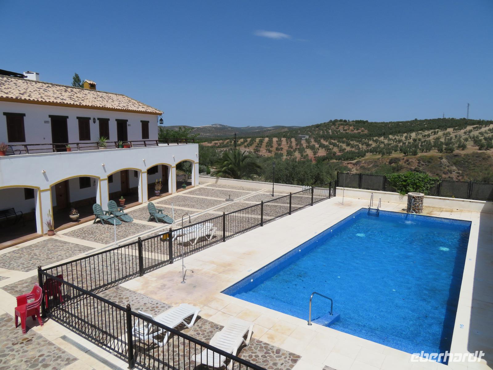 Am heutigen Tag stand die letzte Radtour auf dem Programm. Nach dem Frühstück fuhren wir mit dem Bus nach Lucena. Hier sattelten wir unserer „Pferde" und stellten fest, dass es doch noch recht frisch ist. Heute fuhren wir auf der „Via verde de la Subbetica", welche in meinen Augen die schönste Strecke war. Der Weg war wie gestern ohne Autos und führte durch endlose Olivenhaine und man hatte nach jeder Kurve einen neuen schönen Ausblick. Nach ungefähr zehn km erreichten wir den ersten Bahnhof. In Cabra schauten wir uns die alten Loks mit ihren Waggons an und pflückten und verkosteten Bitterorangen. Ungefähr bei der Hälfte der heutigen 52 km Tour machten wir Rast und verspeisten die Leckereien, die Juan für uns eingekauft hatte. Die Sonne war anscheinend nun auch aufgestanden und so hatten wir wie immer einen blauen Himmel mit einer wunderbar wärmenden Sonne. Unser heutiges Endziel war wie gestern das Hotel in Alcaudete. Nur sind wir heute von der anderen Seite gekommen. Vladimir wird von seinen Mitarbeitern am Hotel abgeholt und nimmt auch gleich seine Fahrräder mit. Hier heißt es das erste Mal Abschied nehmen. Den Nachmittag verbringen wir am Pool und legen, wie sich das für Spanien gehört, eine kleine Siesta ein oder schwimmen eine Runde im Pool. Witzig anzusehen ist, wie unterschiedlich Personen ins Wasser gehen. Früher gehörte ich zu der Gruppe, die direkt und scheinbar ohne Problem ins kühle Nass springt, aber mittlerweile habe ich mich der Gruppe angeschlossen, die erst einmal die Lage von weitem einschätzt, um sich anschließend langsam dem Pool zu nähern. Im Großen und Ganzen darf gesagt werden, dass die Atmosphäre fabelhaft ist. Da wir das Hotel praktisch für uns haben, können wir uns im gesamten Innenhof ausbreiten und können das machen, wozu wir gerade Lust haben.