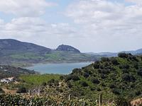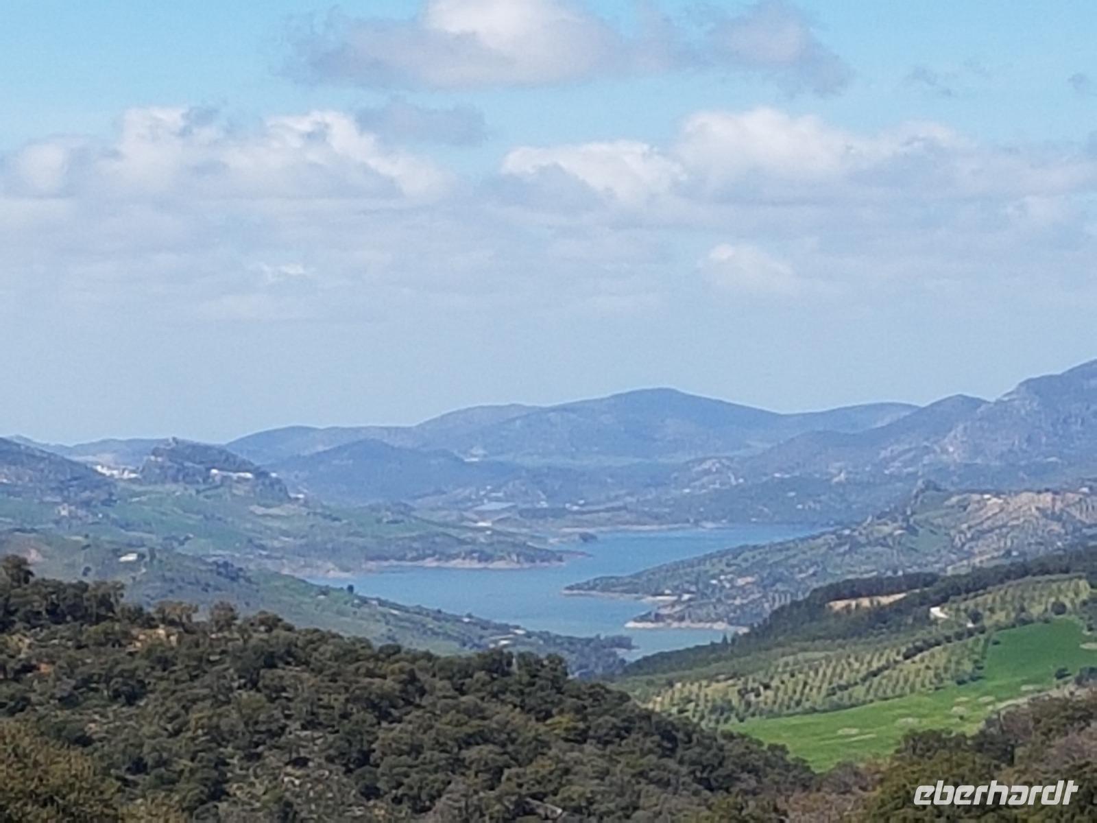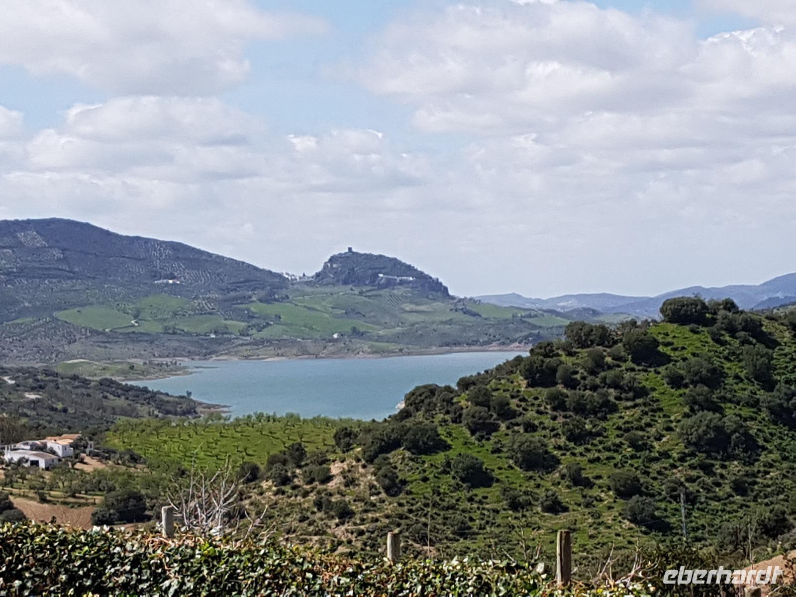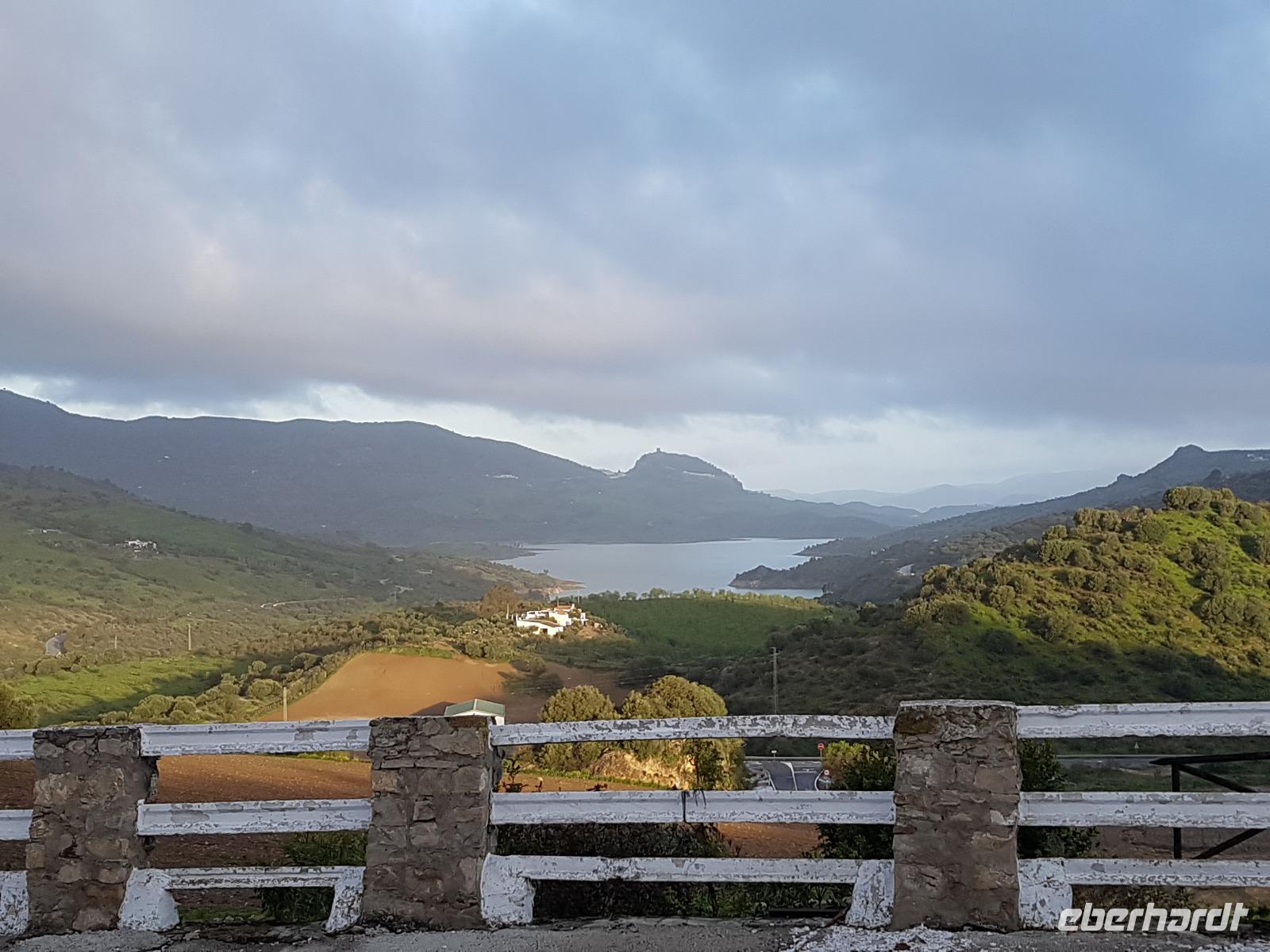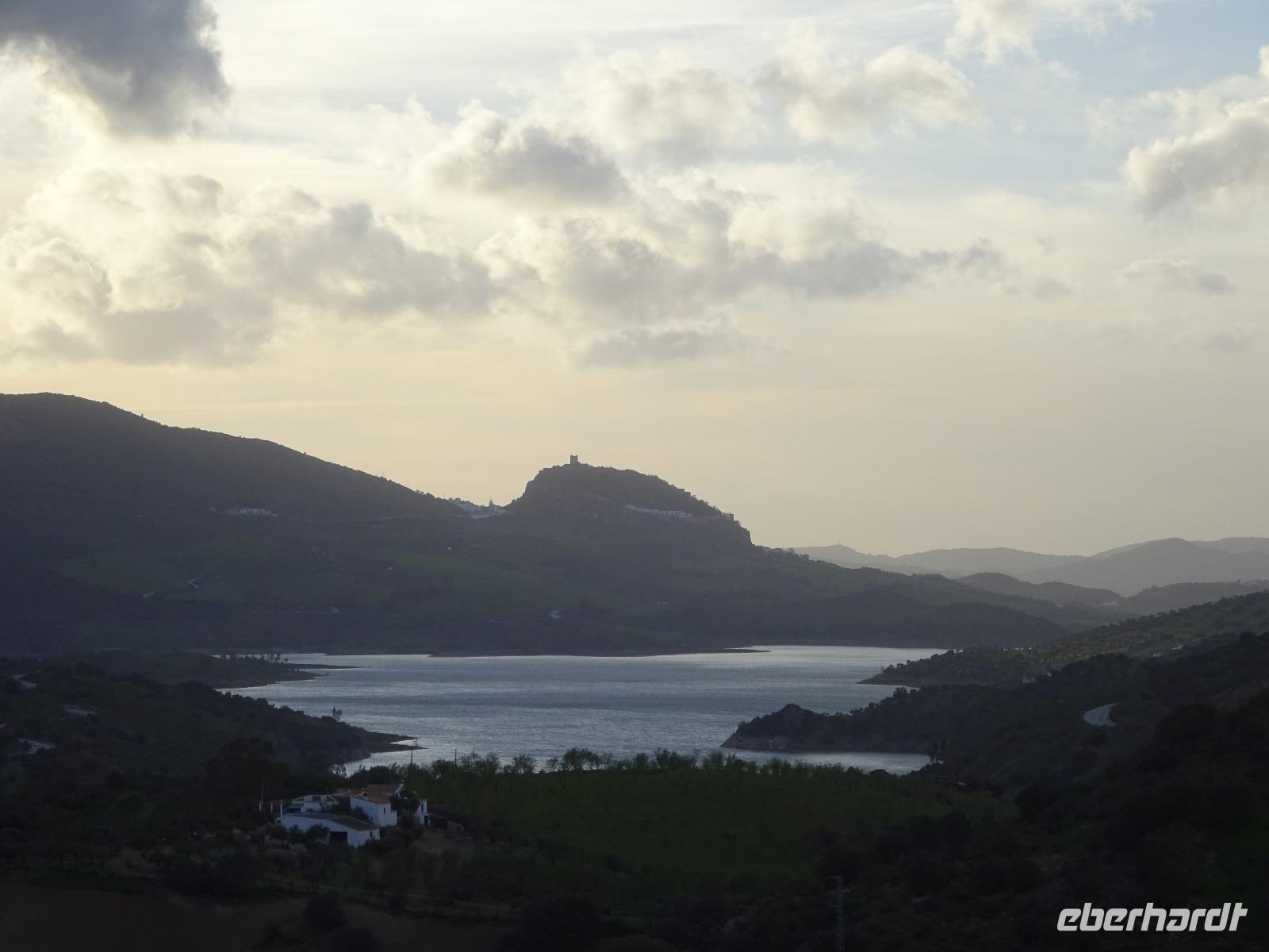 Wir wollten heute die Fahrradstrecke Via Verde de la Sierra, die zu den Höhepunkten der Reise zählte, fahren. Aber es regnete in den letzten Wochen so viel, dass mindestens 4 von den 27 Tunneln unbefahrbar waren und die ganze Route gesperrt wurde. Aber keine Sorge. Benjamin und Juan hatten verschiedene Optionen und wir haben uns für eine sehr schöne entschieden. Direkt am Hotel fuhren wir ab bis El Bosque, über die erhabene Burg Zahara de la Sierra. Der Weg führte uns erstmal am Stausee Zahara de la Sierra vorbei, wo wir einen Stopp machten, um zu fotografieren. Die Straße führt uns heute die ganze Zeit leicht nach unten. Insgesamt fuhren wir 33 km mit ca. 800 Metern Höhenunterschied. Die Radtour hat uns heute gefallen. Am Ende in El Bosque wartete Juan wieder mit dem Picknick auf uns. Danach tranken wir einen Kaffee ganz gemütlich im Dorf und fuhren über Arcos de la Frontera und Jerez de la Frontera bis zu unserem 4 Sterne Hotel Playa de la Luz bei Rota. Da das Wetter so gut war, fuhren wir direkt ins Hotel, das direkt am Strand liegt. Einige gingen spazieren, die andere baden. Und um 19.30 trafen wir uns wieder zum Buffet beim Abendessen, wo wir einen Tisch nur für uns am Fenster beim Sonnenuntergang am Atlantik bekamen.