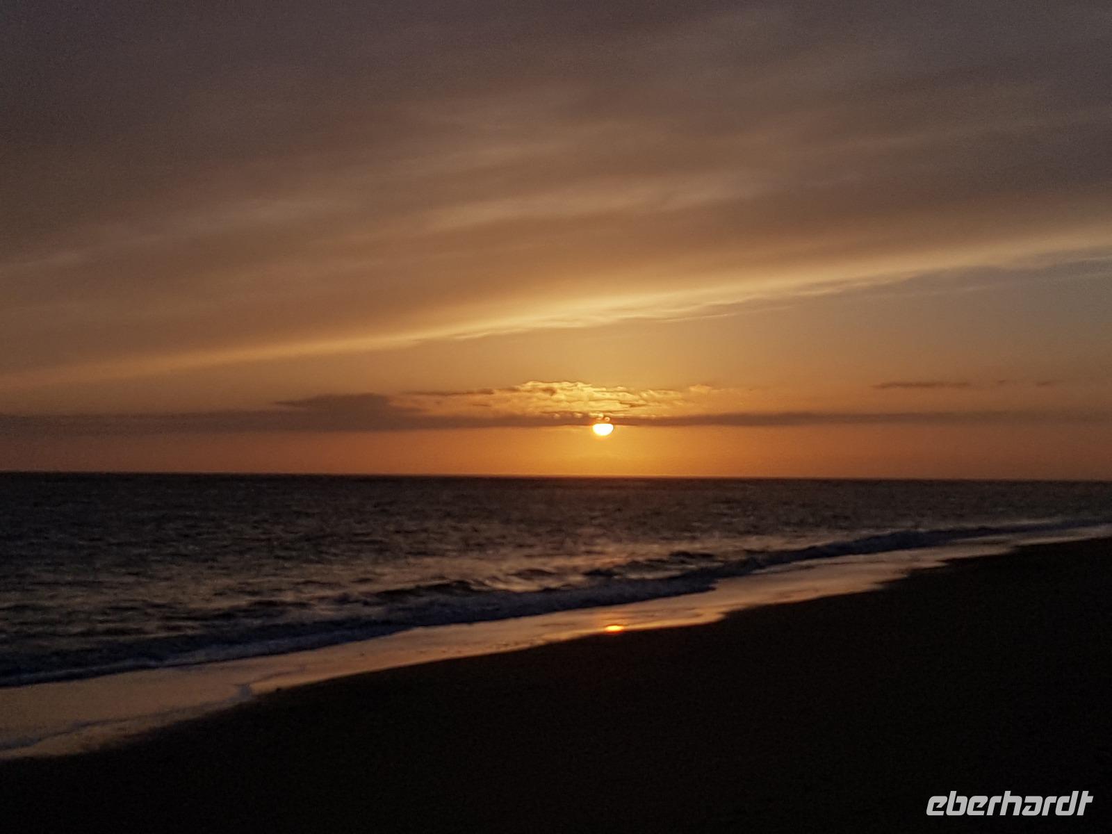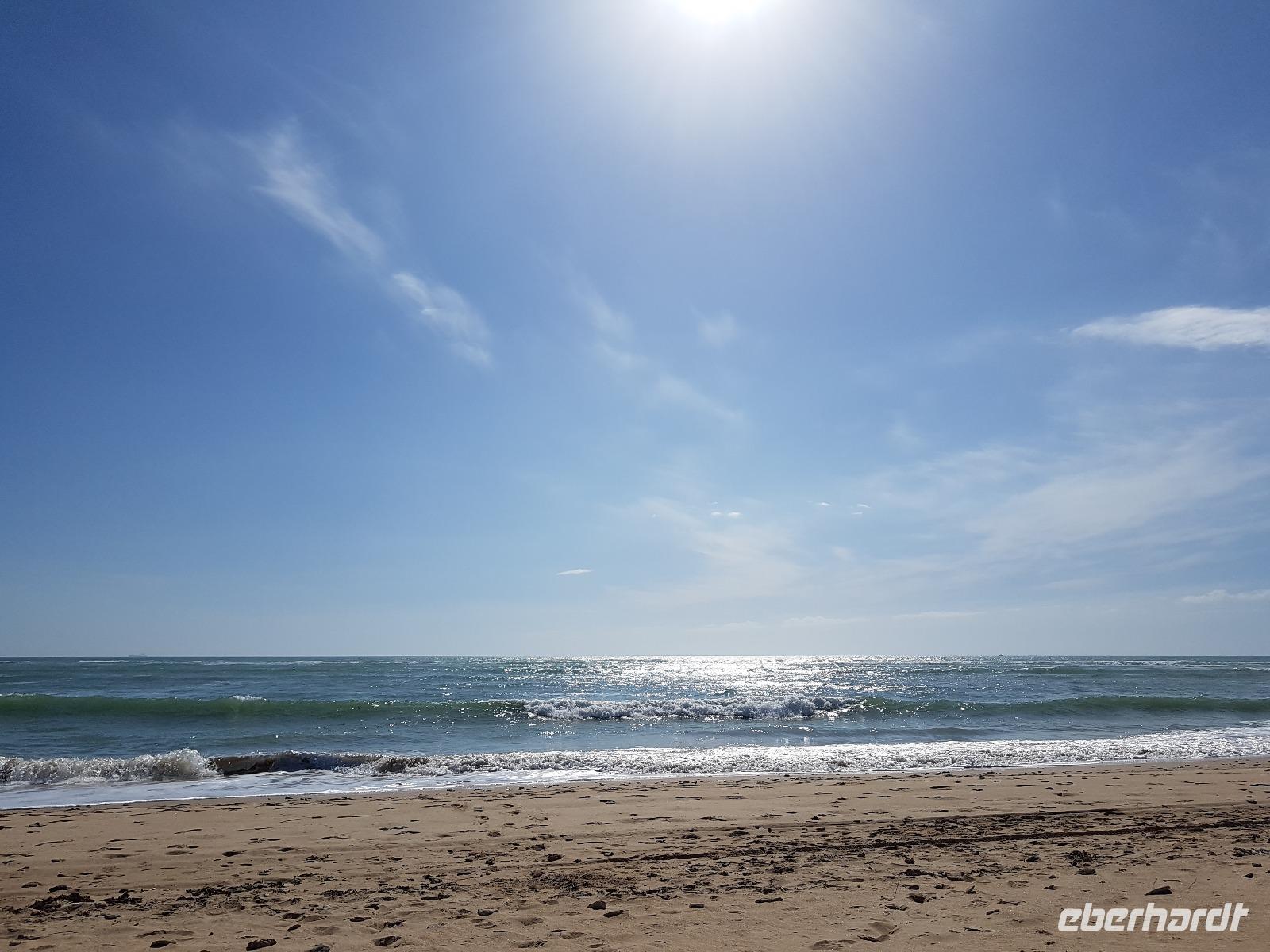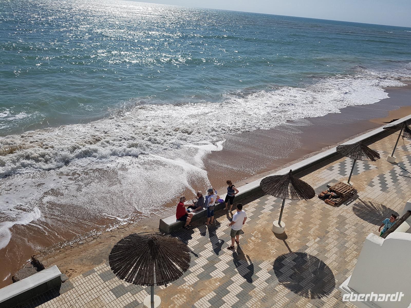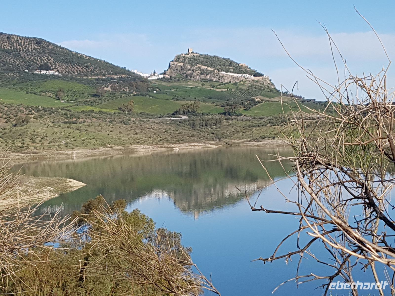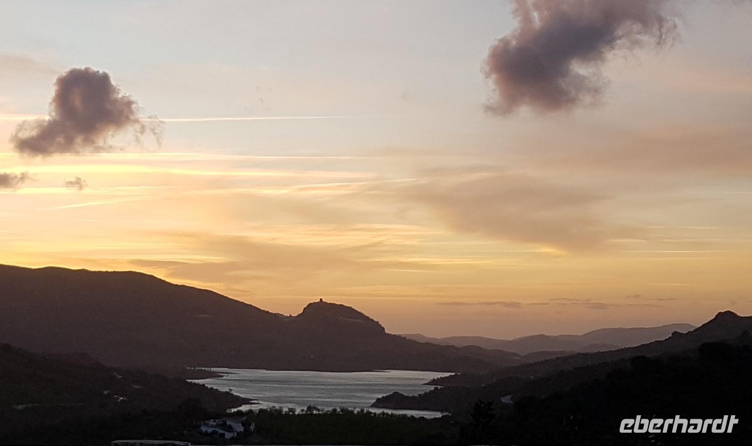Wir wollten heute die Fahrradstrecke Via Verde de la Sierra, die zu den Höhepunkten der Reise zählte, fahren. Aber es regnete in den letzten Wochen so viel, dass mindestens 4 von den 27 Tunneln unbefahrbar waren und die ganze Route gesperrt wurde. Aber keine Sorge. Benjamin und Juan hatten verschiedene Optionen und wir haben uns für eine sehr schöne entschieden. Direkt am Hotel fuhren wir ab bis El Bosque, über die erhabene Burg Zahara de la Sierra. Der Weg führte uns erstmal am Stausee Zahara de la Sierra vorbei, wo wir einen Stopp machten, um zu fotografieren. Die Straße führt uns heute die ganze Zeit leicht nach unten. Insgesamt fuhren wir 33 km mit ca. 800 Metern Höhenunterschied. Die Radtour hat uns heute gefallen. Am Ende in El Bosque wartete Juan wieder mit dem Picknick auf uns. Danach tranken wir einen Kaffee ganz gemütlich im Dorf und fuhren über Arcos de la Frontera und Jerez de la Frontera bis zu unserem 4 Sterne Hotel Playa de la Luz bei Rota. Da das Wetter so gut war, fuhren wir direkt ins Hotel, das direkt am Strand liegt. Einige gingen spazieren, die andere baden. Und um 19.30 trafen wir uns wieder zum Buffet beim Abendessen, wo wir einen Tisch nur für uns am Fenster beim Sonnenuntergang am Atlantik bekamen.