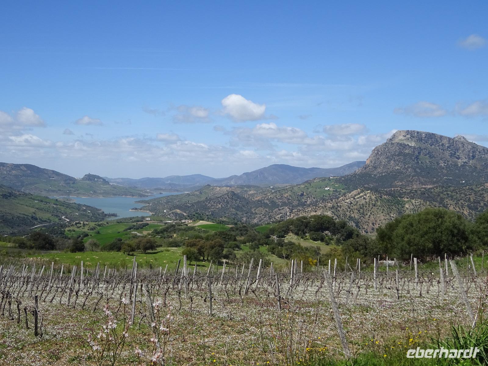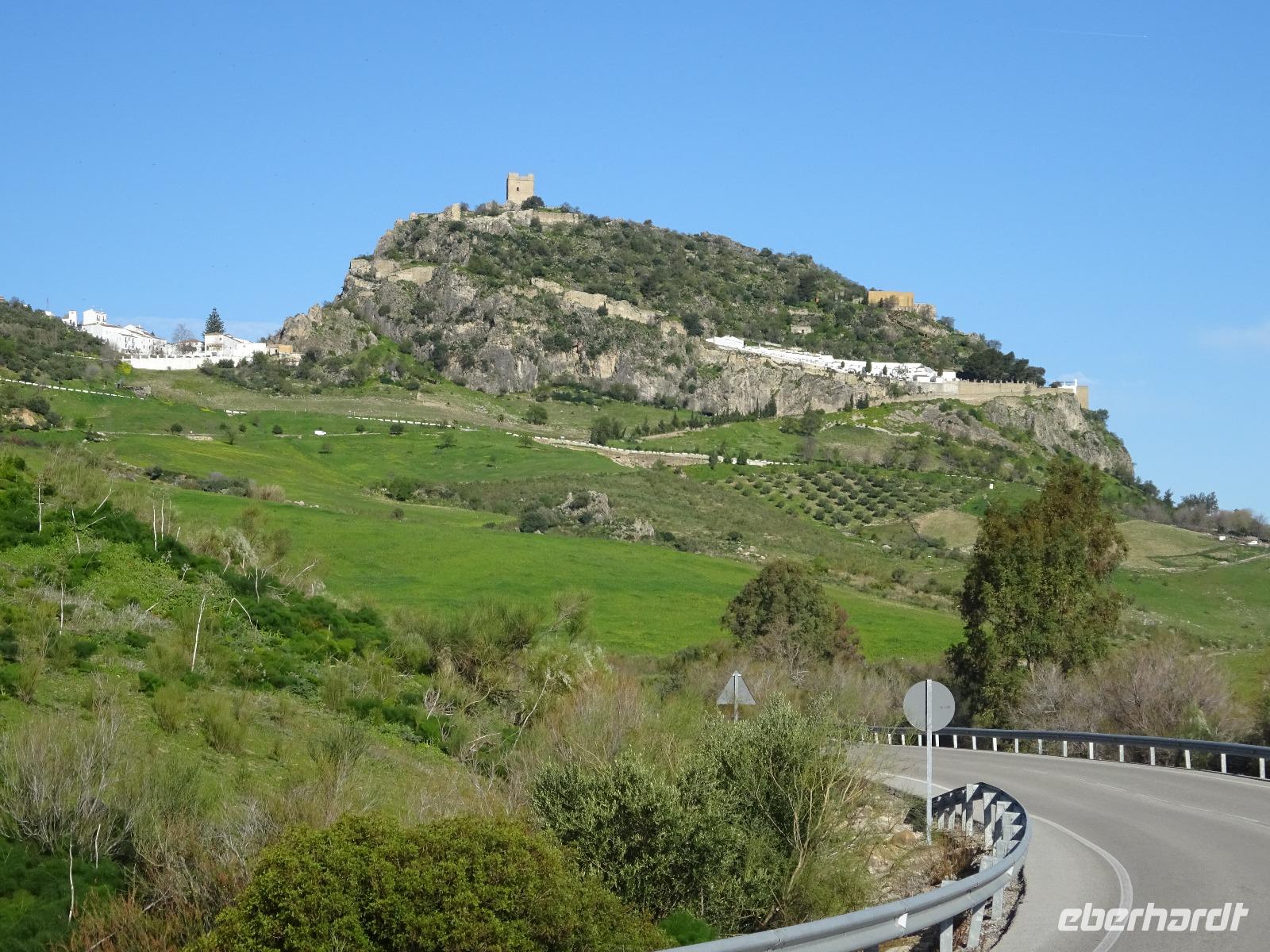 In Spanien wird es nicht wie in Deutschland um 06:45 Uhr schon hell, sondern erst viel später. Deswegen hatten wir um 8 Uhr Frühstück mit herrlichem Blick auf den Stausee Zahara de la Sierra. Zum Frühstück gab es geschälte Knoblauchzehe, die traditionell auf das Brot gerieben wurde. Mit Tomatenaufstrich, Salz, Pfeffer und Olivenöl abgeschmeckt, brachte das Frühstück genug Kraft für die heutige Radtour. Zunächst brachte uns Juan mit dem Bus nach Benaocaz, in der Sierra de la Grazalema. Hier begann unsere erste Radtour. Wir probieren dort unsere Fahrräder und waren damit sehr zufrieden. Zwei Damen hatten E-bikes. Die ersten 50 Minuten heute gingen bergab, danach waren wir schon im Käsedorf Villaluenga del Rosario angelangt. Die Sonne schien und so sollte es den ganzen Tag bleiben. Es war ein bisschen frisch am Morgen im Schatten, aber langsam merkte man, dass die Sonne Kraft bekam.