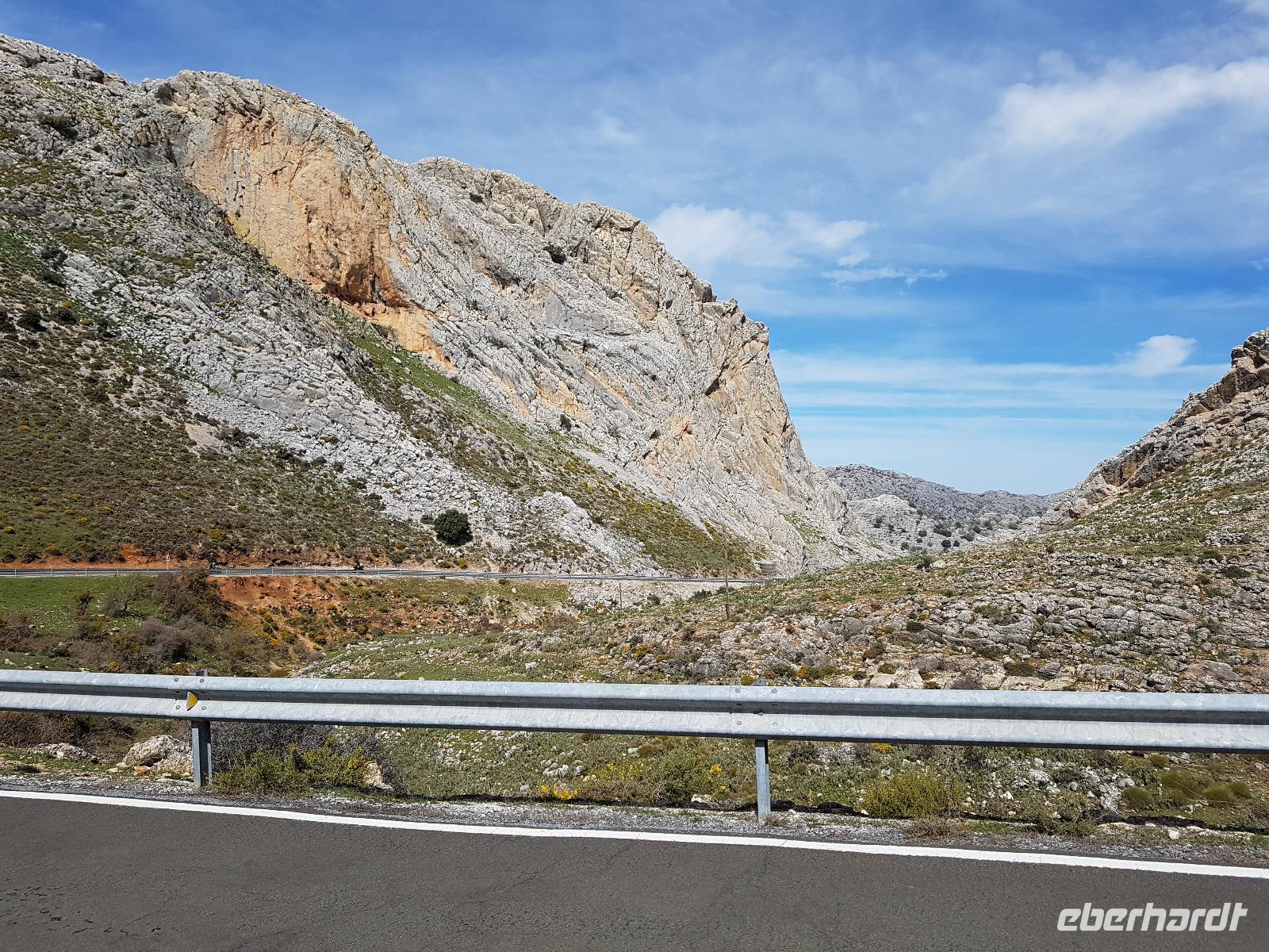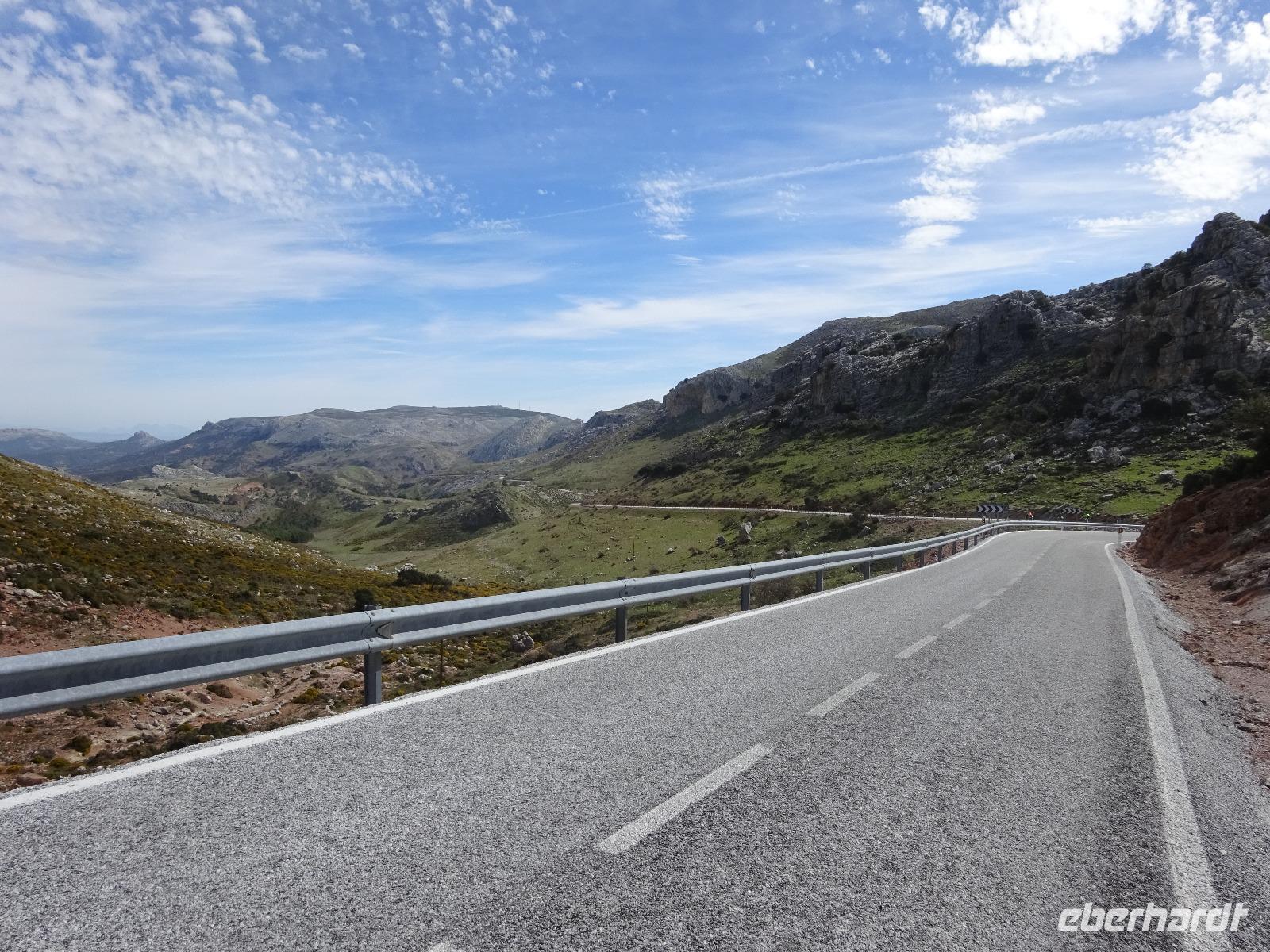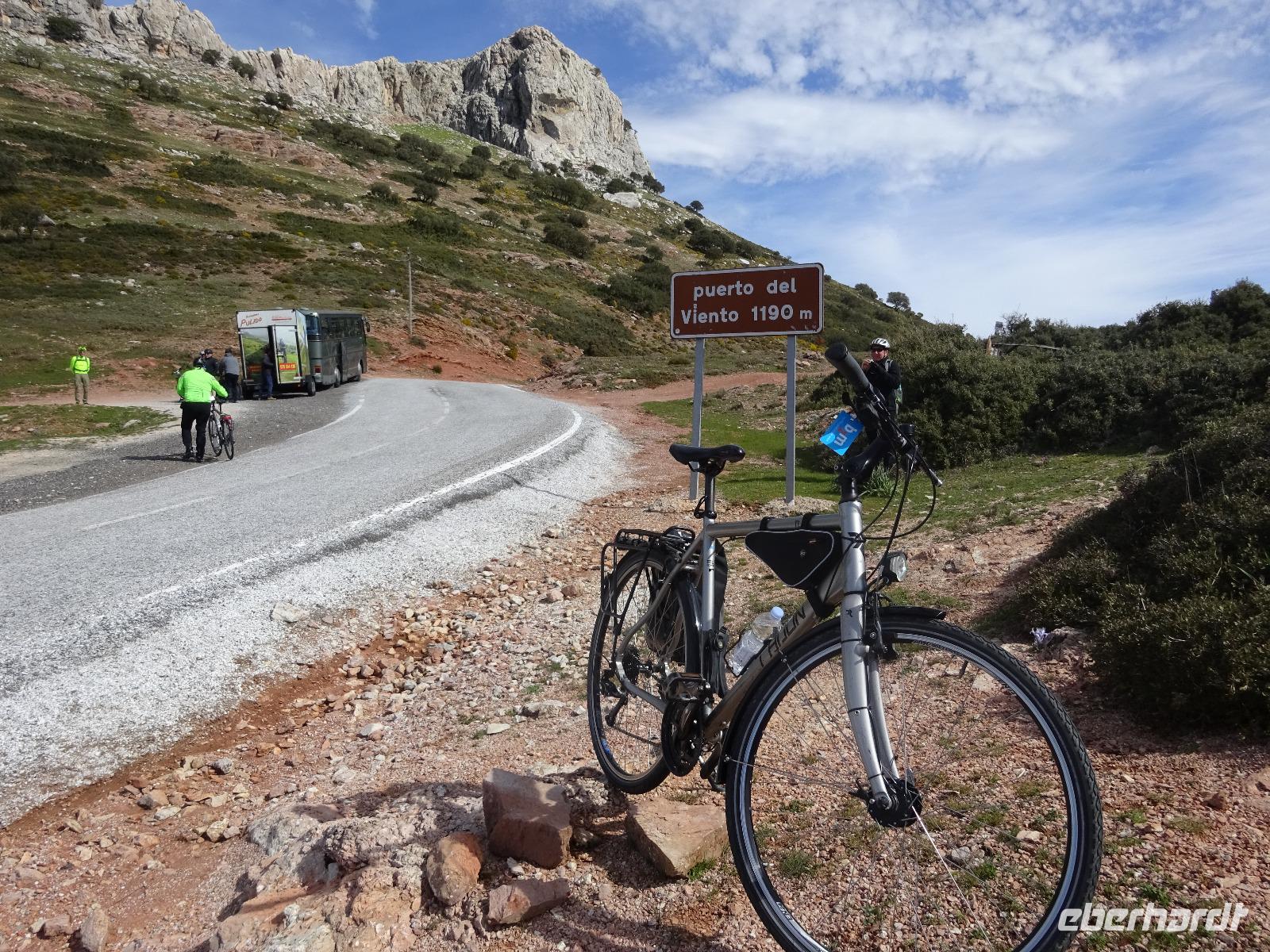 Nach dem tollen spanischen Frühstück, fuhren wir erneut in Richtung Ronda. Heute regnete es auch nicht - es war sonnig aber windig. Kaum aufgesattelt, ging es zunächst erst einmal hinauf. Heute war es richtig windig. Unser erstes Ziel heute war der „Puerto del Viento" (Pass des Windes). Dieser liegt auf einer Höhe von 1190 Meter. Wir verstanden ganz gut, warum er "Pass des Windes" heißt. Wir machten hier ein Gruppebild und ab jetzt hatten wir den höchsten Punkt erreicht und es geht größtenteils nur noch bergab bis zum weißen Dorf El Burgo. Auf dem Berg sahen wir am Horizont einen großen, weißen Berg, voll von Schnee. Was könnte das sein? Sierra Nevada ohne Zweifel. Wunderschön von hier, dem höchsten Punkt der Halbinsel Spanien, zu bestaunen. Unten in El Burgo begrüßte uns bereits Juan. Heute fuhren wir insgesamt 27 km mit 1230 Höhenmetern Unterschied (531 nach unten und 701 nach oben).
