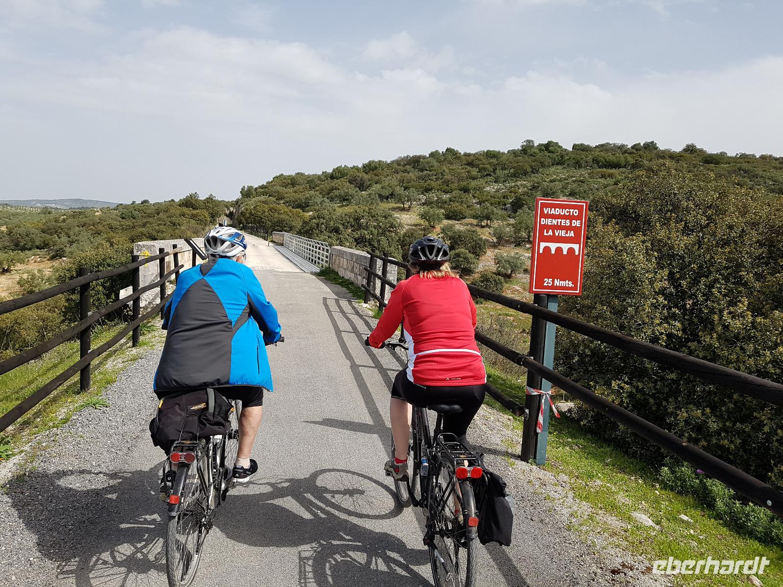 Unsere Radtour heute ist die Via Verde de la Campina - insgesamt 35 km, anspruchsvolle Anforderung. Heute war die Strecke wieder mal ganz anders durch eine leichte Hügellandschaft und über grüne Wiesen. Wir fuhren über Landschaftswege, quer durch das schöne, grüne Land. Manchmal war die Strecke etwas holpriger als gewohnt, aber landschaftlich fanden wir es wieder sehr schön. Bis jetzt haben wir keinen Platten oder Panne gehabt und so sollte es auch bis zum Ende der Reise bleiben. Nachdem wir die Räder im Anhänger verladen haben und ein Eis und Erfrischungen an einer Tankstelle geholt hatten, fuhren wir Richtung Alcaudete, wo wir unsere drei letzten Nächte verbrachten. Es ist ein kleines Hotel mit Pool und wir waren fast die ganze Zeit allein.