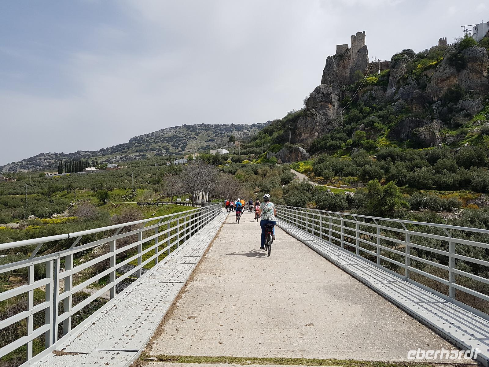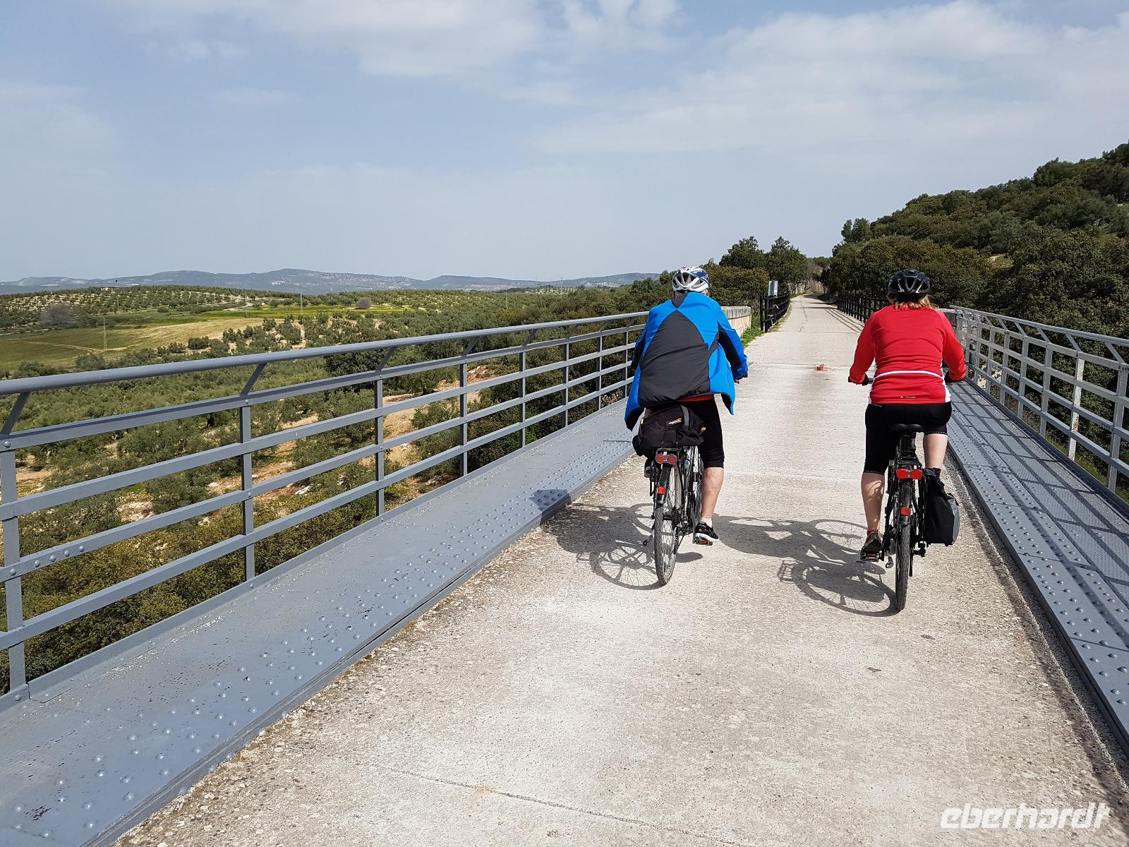 Heute war der Tag dem Olivenöl gewidmet. Wir radelten heute und morgen auf der „Via verde del Aceite". Diese Strecke haben die ehemaligen Olivenölzüge benutzt. Heute aber sind sie sehr gut ausgebaut und Radfahren macht hier Spaß und ist einfach ein Genuss. Insbesondere die weite Landschaft heute und morgen mit den unzähligen Olivenhainen. Höhepunkte sind auch die paar alten Metallviadukte, über die wir fuhren. Wir haben gut gefrühstückt und fuhren um 9.30 Uhr erstmal mit dem Bus nach Lucena, wo die „Via verde de la Subbetica" anfängt. Nach einigen Kilometern, erreichten wir den ersten alten Bahnhof von Cabra, wo wir uns die alten Lokomotiven mit ihren Waggons anschauten. Wir waren super in der Zeit und entschieden, hier einen Kaffee zu trinken. Bei Dona Mencia trafen wir Juan, der uns die Picknicktaschen gab. Heute war wieder Picknick angesagt. Weiter vorne suchten wir uns ein schönes Plätzchen unterhalb der Burg von Zuheros und aßen die Leckereien. Wir hatten Glück mit dem Wetter, der wärmenden Sonne und dem fast immer blauem Himmel. Unser Endziel war heute unser Hotel in Alcaudete, aber zuvor fuhren wir am Laguna de Salobral See vorbei, der erstaunlicherweise voll mit Wasser war. Wie in Ronda, hat es auch hier viel in den letzten Wochen geregnet und für Benjamin ist es das erste Mal gewesen, dass er diesen See mit richtig viel Wasser sah. Zum zeitigen Nachmittag -wie gesagt- kamen wir mit den Fahrrädern direkt beim Hotel an. Wir sind heute insgesamt 52 Kilometer gefahren und hatten viel Spaß. Im Hotel gut angekommen, hatte jeder nun Freizeit. Einige tranken ein Bier auf der Terrasse. Andere wollten am Pool in der Sonne sein. Um 17.30 Uhr trafen wir uns wieder. Nachdem wir die Kirche in Alcaudete besichtigt haben, wo Benjamin ein paar Lieder sang, fuhren wir nach Alcaudete zum Supermarket, da einige von uns noch für Deutschland Oliven und Olivenöl kaufen wollten.