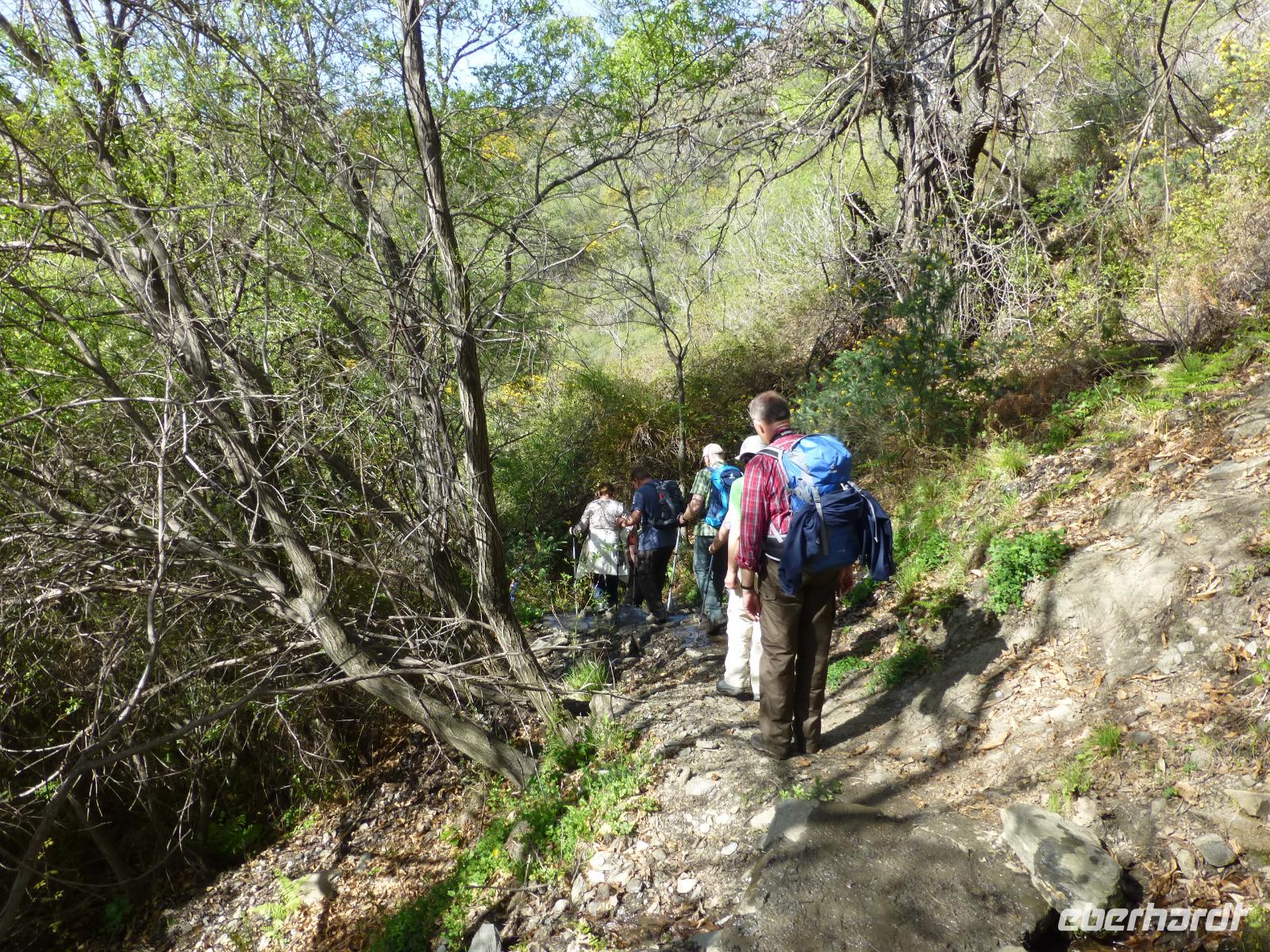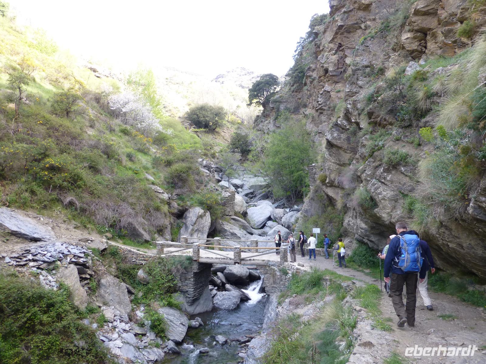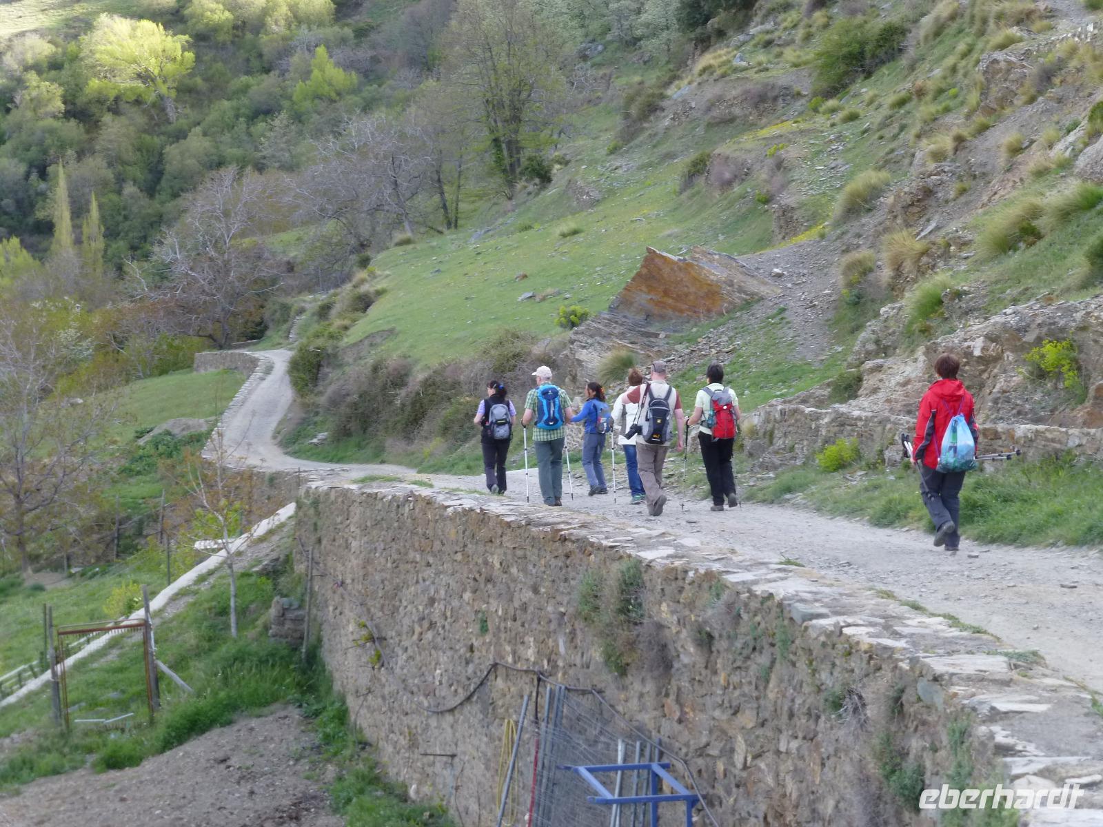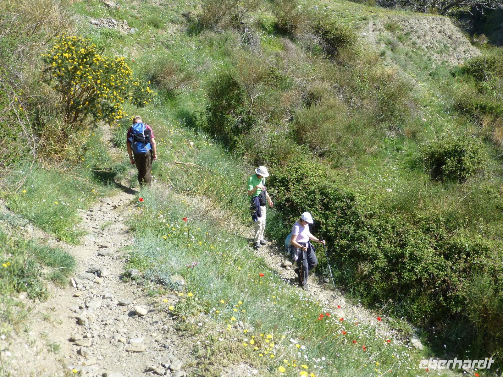 Am Morgen lacht schon wieder die Sonne und nach dem Frühstück erwartet uns mit einem lachsenden Gesicht unsere Wanderführerin Chello. Am Ortsrand beginnen wir in die Schlucht des Rio Poqueira abzusteigen. Unterwegs gehen wir vorbei an alten Getreidedreschplätzen und einigen Gärten. Wieder blühen allerlei Blumen, aber auch Ginster säumt unseren Weg. Wir erfahren das in dieser alten Kulturlandschaft bereits die Römer ein Bewässerungssystem erbauten welches später von den Mauren verfeinert wurde. Wir queren zweimal den Rio Poqueira, früher gab es an jeder Brücke eine Mühle zum Mahlen von Mehl, heute gibt es davon nur noch einige Mauerreste. Immer wieder können wir vor uns auch die beiden Nachbardörfer Bubión und Pampaneira sehen, beide „kleben" an den Hängen der Sierra Nevada. Zur Mittagspause erreichen wir Bubión, machen dort unser Picknick und gehen dann weiter bergab nach Pampaneira. In der Tourist Info können wir an einem Modell der Sierra Nevada noch einmal sehen wo wir gelaufen sind, erfahren aber auch noch einmal etwas über die klimatischen Besonderheiten des Gebirges. Wir verabschieden uns von Chello und fahren weiter nach Trevelez. In diesem Ort wird auf traditionelle Art Serrano - Schinken hergestellt. Bei der Firma Jamones Vallejo bekommen wir erklärt was notwendig ist um nach bis zu 24 Monaten einen guten Schinken zu erhalten. Der Anblick so vieler Schinken war schon einmalig. Zum Schluss des Rundgangs können wir den Schinken bei einem Glas Rotwein probieren. Auf dem Weg nach Capileira halten wir noch einmal Bubión. Hier können wir sehen wie auf traditionelle Weise Teppiche gewebt werden. Die Auswahl ist riesig, die Preise moderat, aber der Koffer zu klein. Zum Abendessen genießen wir wieder die lokale sehr gute Küche des Hotels.