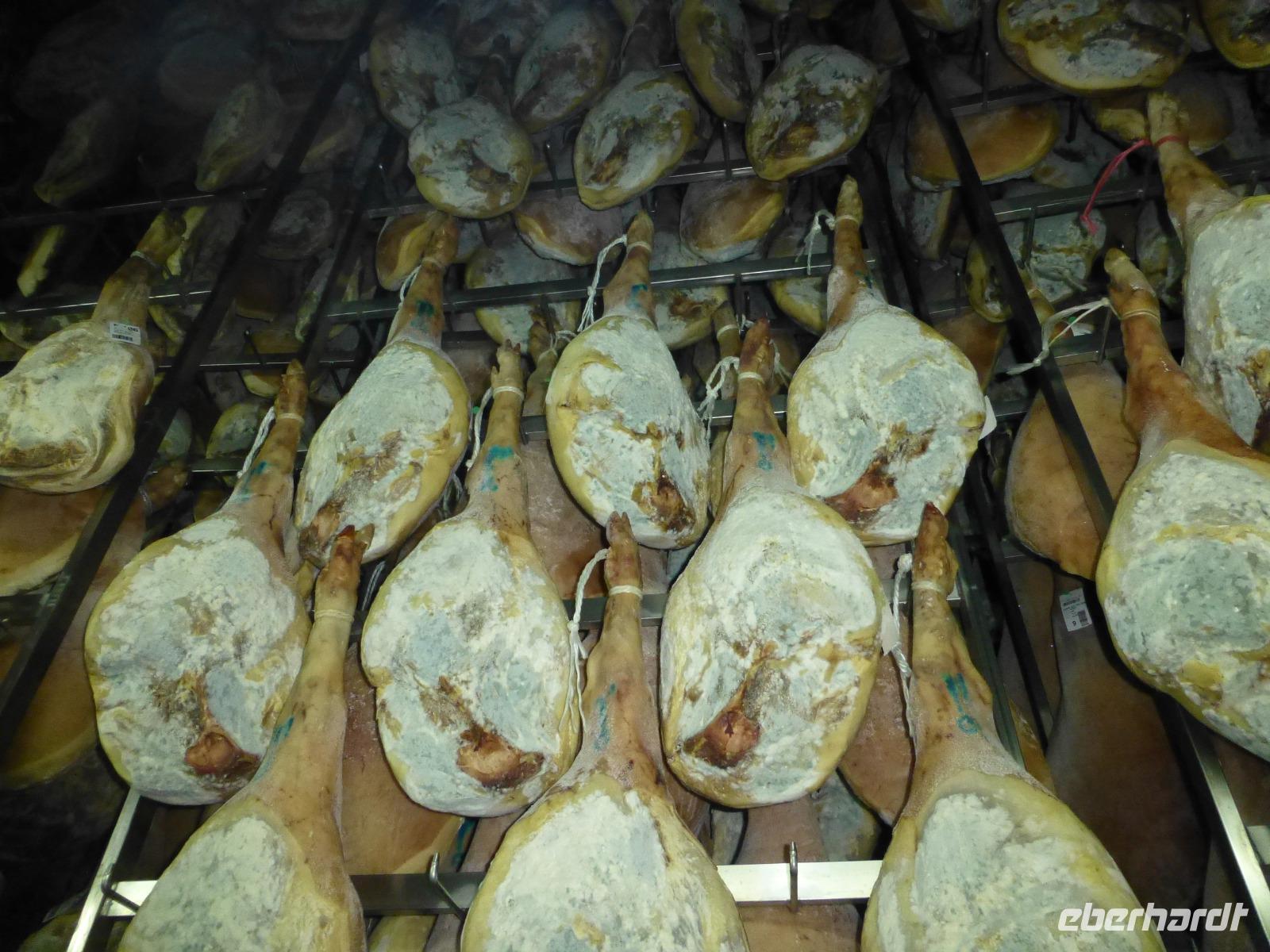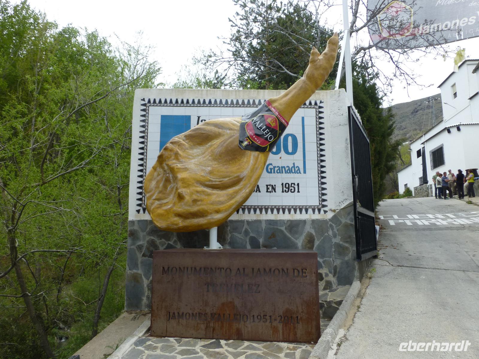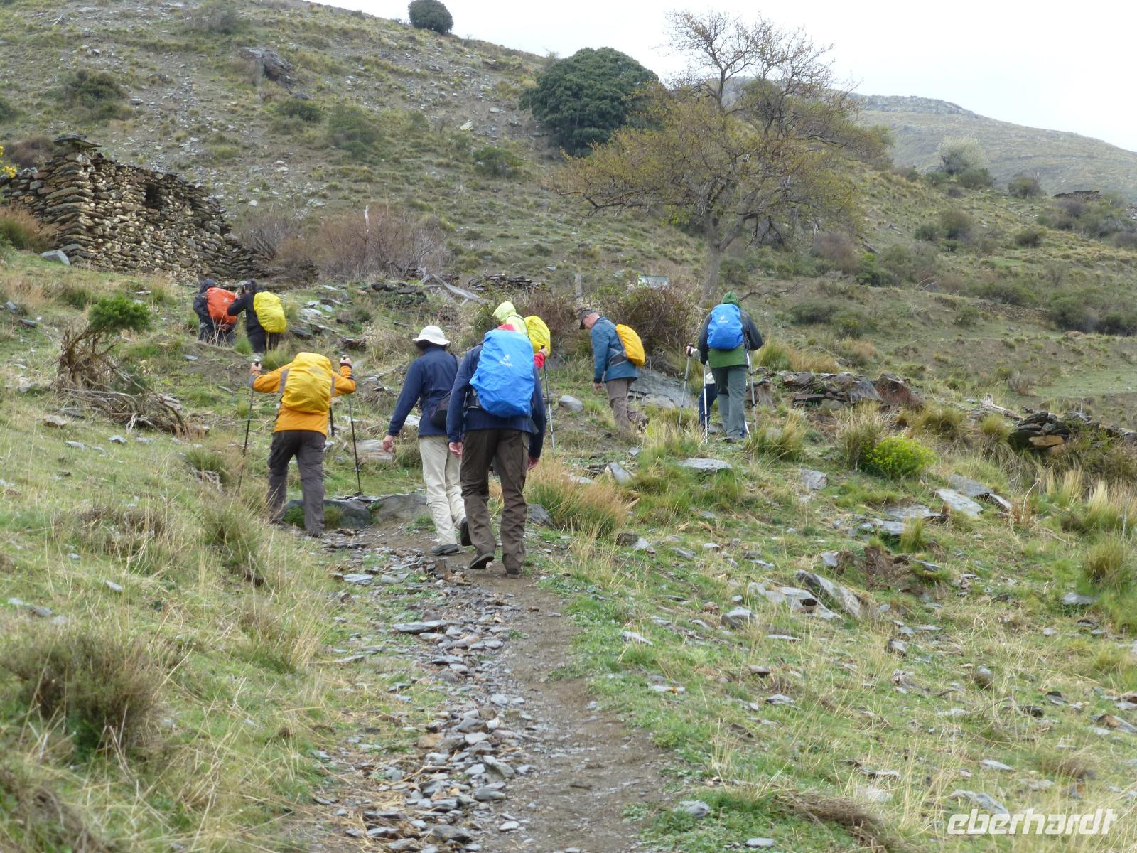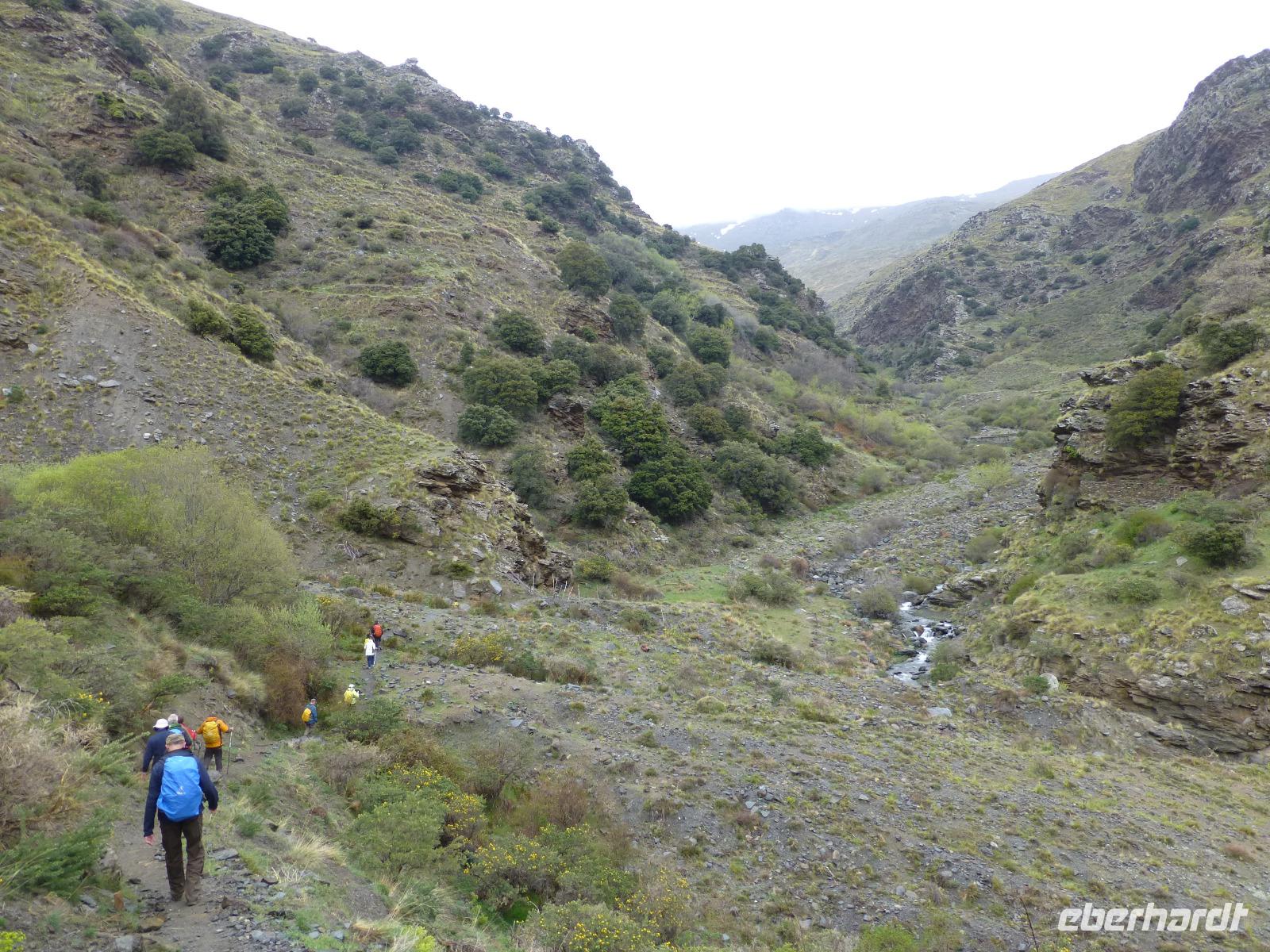Am Morgen lacht schon wieder die Sonne und nach dem Frühstück erwartet uns mit einem lachsenden Gesicht unsere Wanderführerin Chello. Am Ortsrand beginnen wir in die Schlucht des Rio Poqueira abzusteigen. Unterwegs gehen wir vorbei an alten Getreidedreschplätzen und einigen Gärten. Wieder blühen allerlei Blumen, aber auch Ginster säumt unseren Weg. Wir erfahren das in dieser alten Kulturlandschaft bereits die Römer ein Bewässerungssystem erbauten welches später von den Mauren verfeinert wurde. Wir queren zweimal den Rio Poqueira, früher gab es an jeder Brücke eine Mühle zum Mahlen von Mehl, heute gibt es davon nur noch einige Mauerreste. Immer wieder können wir vor uns auch die beiden Nachbardörfer Bubión und Pampaneira sehen, beide „kleben" an den Hängen der Sierra Nevada. Zur Mittagspause erreichen wir Bubión, machen dort unser Picknick und gehen dann weiter bergab nach Pampaneira. In der Tourist Info können wir an einem Modell der Sierra Nevada noch einmal sehen wo wir gelaufen sind, erfahren aber auch noch einmal etwas über die klimatischen Besonderheiten des Gebirges. Wir verabschieden uns von Chello und fahren weiter nach Trevelez. In diesem Ort wird auf traditionelle Art Serrano - Schinken hergestellt. Bei der Firma Jamones Vallejo bekommen wir erklärt was notwendig ist um nach bis zu 24 Monaten einen guten Schinken zu erhalten. Der Anblick so vieler Schinken war schon einmalig. Zum Schluss des Rundgangs können wir den Schinken bei einem Glas Rotwein probieren. Auf dem Weg nach Capileira halten wir noch einmal Bubión. Hier können wir sehen wie auf traditionelle Weise Teppiche gewebt werden. Die Auswahl ist riesig, die Preise moderat, aber der Koffer zu klein. Zum Abendessen genießen wir wieder die lokale sehr gute Küche des Hotels.