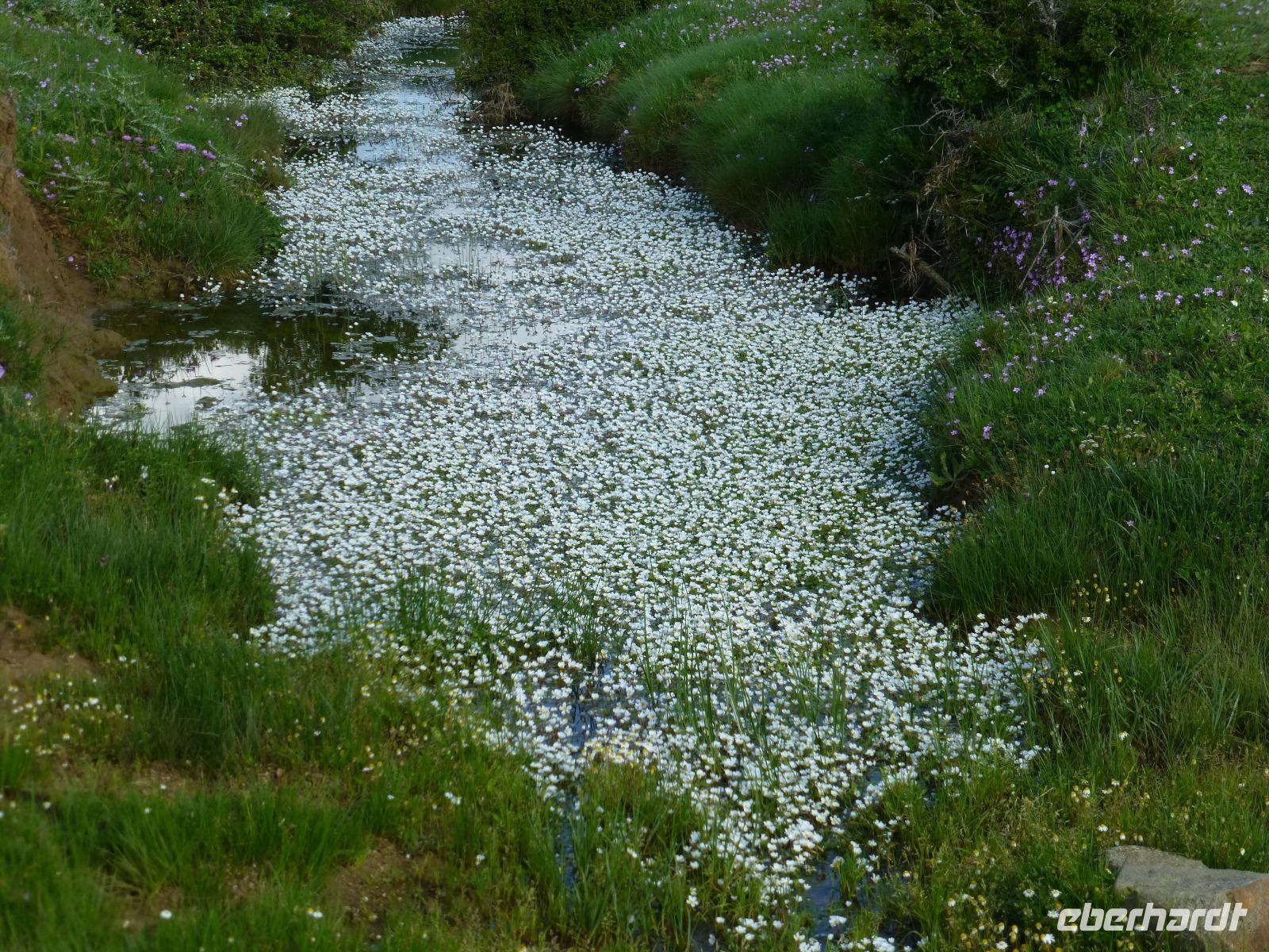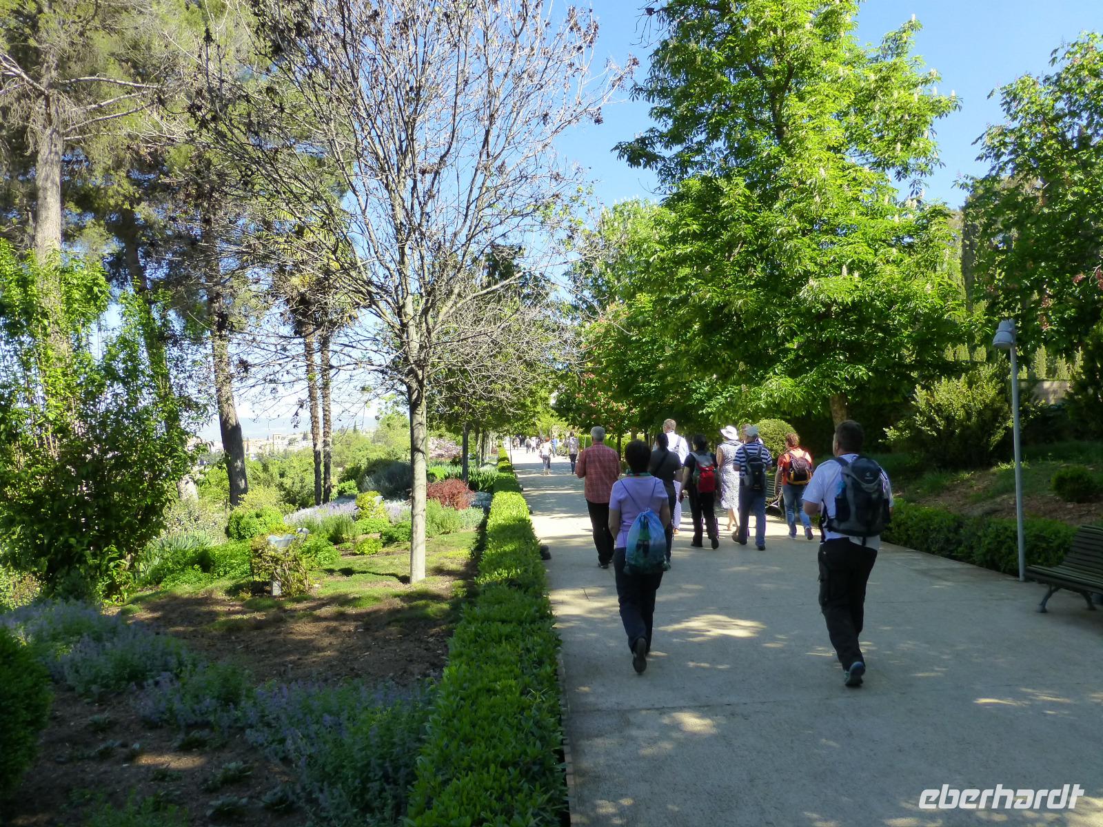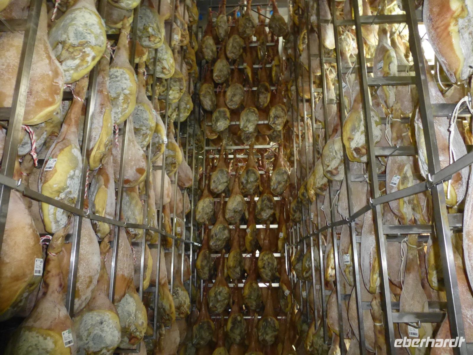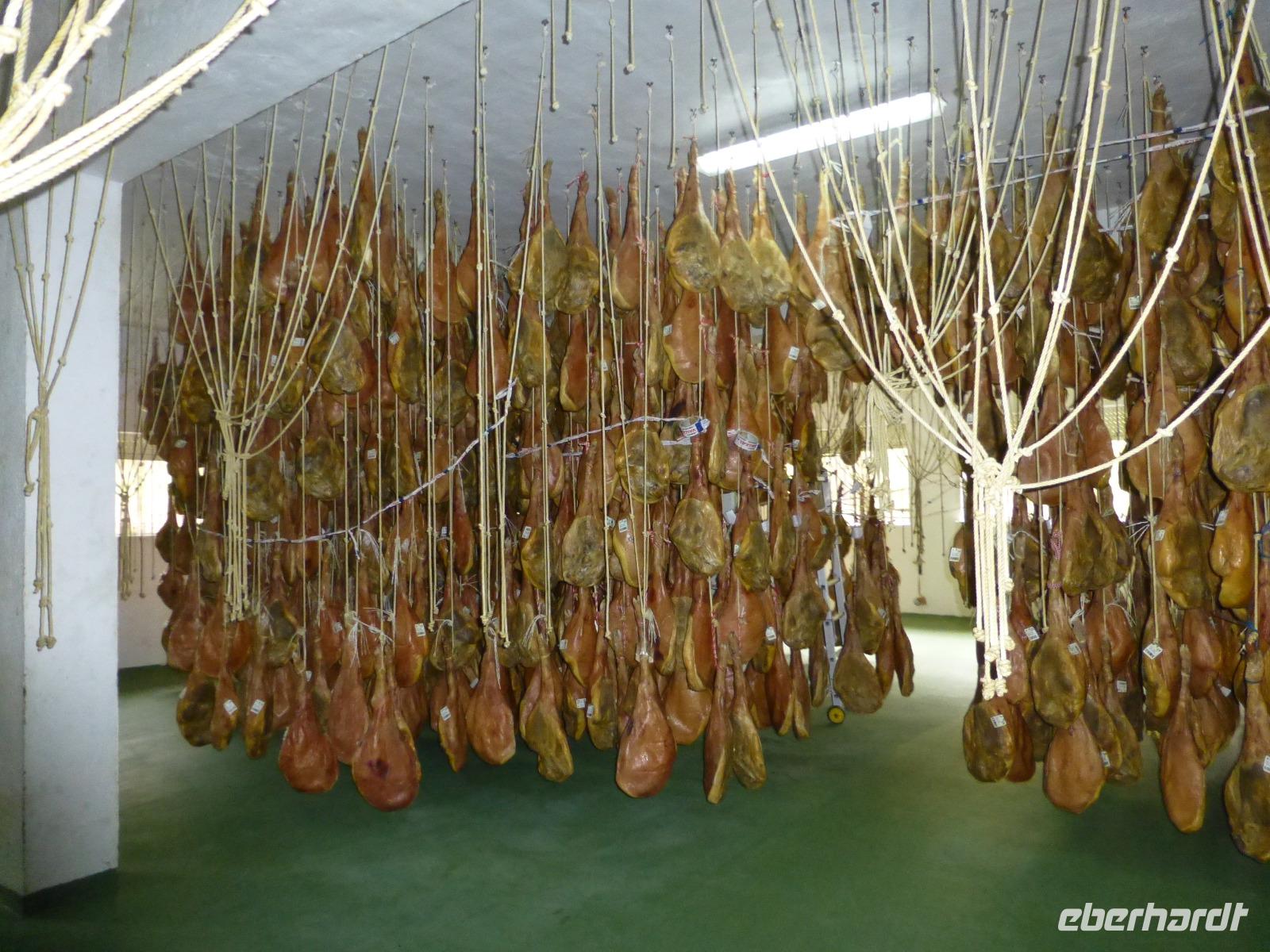 Am Morgen lacht schon wieder die Sonne und nach dem Frühstück erwartet uns mit einem lachsenden Gesicht unsere Wanderführerin Chello. Am Ortsrand beginnen wir in die Schlucht des Rio Poqueira abzusteigen. Unterwegs gehen wir vorbei an alten Getreidedreschplätzen und einigen Gärten. Wieder blühen allerlei Blumen, aber auch Ginster säumt unseren Weg. Wir erfahren das in dieser alten Kulturlandschaft bereits die Römer ein Bewässerungssystem erbauten welches später von den Mauren verfeinert wurde. Wir queren zweimal den Rio Poqueira, früher gab es an jeder Brücke eine Mühle zum Mahlen von Mehl, heute gibt es davon nur noch einige Mauerreste. Immer wieder können wir vor uns auch die beiden Nachbardörfer Bubión und Pampaneira sehen, beide „kleben" an den Hängen der Sierra Nevada. Zur Mittagspause erreichen wir Bubión, machen dort unser Picknick und gehen dann weiter bergab nach Pampaneira. In der Tourist Info können wir an einem Modell der Sierra Nevada noch einmal sehen wo wir gelaufen sind, erfahren aber auch noch einmal etwas über die klimatischen Besonderheiten des Gebirges. Wir verabschieden uns von Chello und fahren weiter nach Trevelez. In diesem Ort wird auf traditionelle Art Serrano - Schinken hergestellt. Bei der Firma Jamones Vallejo bekommen wir erklärt was notwendig ist um nach bis zu 24 Monaten einen guten Schinken zu erhalten. Der Anblick so vieler Schinken war schon einmalig. Zum Schluss des Rundgangs können wir den Schinken bei einem Glas Rotwein probieren. Auf dem Weg nach Capileira halten wir noch einmal Bubión. Hier können wir sehen wie auf traditionelle Weise Teppiche gewebt werden. Die Auswahl ist riesig, die Preise moderat, aber der Koffer zu klein. Zum Abendessen genießen wir wieder die lokale sehr gute Küche des Hotels.