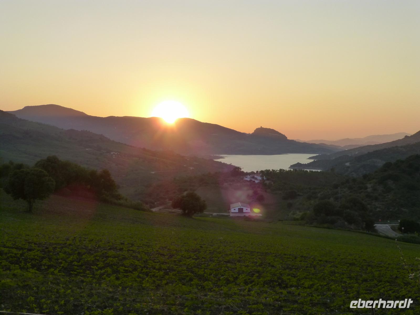 Unsere kleine Gruppe trifft sich am Morgen auf dem Flughafen Berlin-Tegel. Der Check in geht trotz einer riesigen Schlange flott vorwärts. Pünktlich landen wir in am frühen Nachmittag in Málaga. Das Wetter ist hervorragend, am Morgen hatten wir in Deutschland noch 0 - 2°C und jetzt über 20°C. Da wir noch Zeit haben, bietet sich ein kurzer Besuch von Málaga an. Wir machen einen Stopp an der neugestalteten Marina mit dem Leuchtturm, fahren hinauf zum Mirador Gibralfaro, besuchen die Plaza de la Merced mit dem Geburtshaus von Pablo Picasso. Vorbei am römischen Theater erreichen wir die Kathedrale von Málaga und treffen wenig später in der Nähe des Rathauses unseren Bus wieder. Dieser wird an allen Tagen von Alejandro gefahren. Von Málaga fahren wir Richtung Ronda. Unser Hotel, Cortijo Salinas, liegt eine halbe Stunde von Ronda entfernt in der Nähe des Zahara - Stausees. Gemeinsam lassen wir uns unser Abendessen schmecken, nicht ohne ein Glas spanischen Rotwein zur Begrüßung.