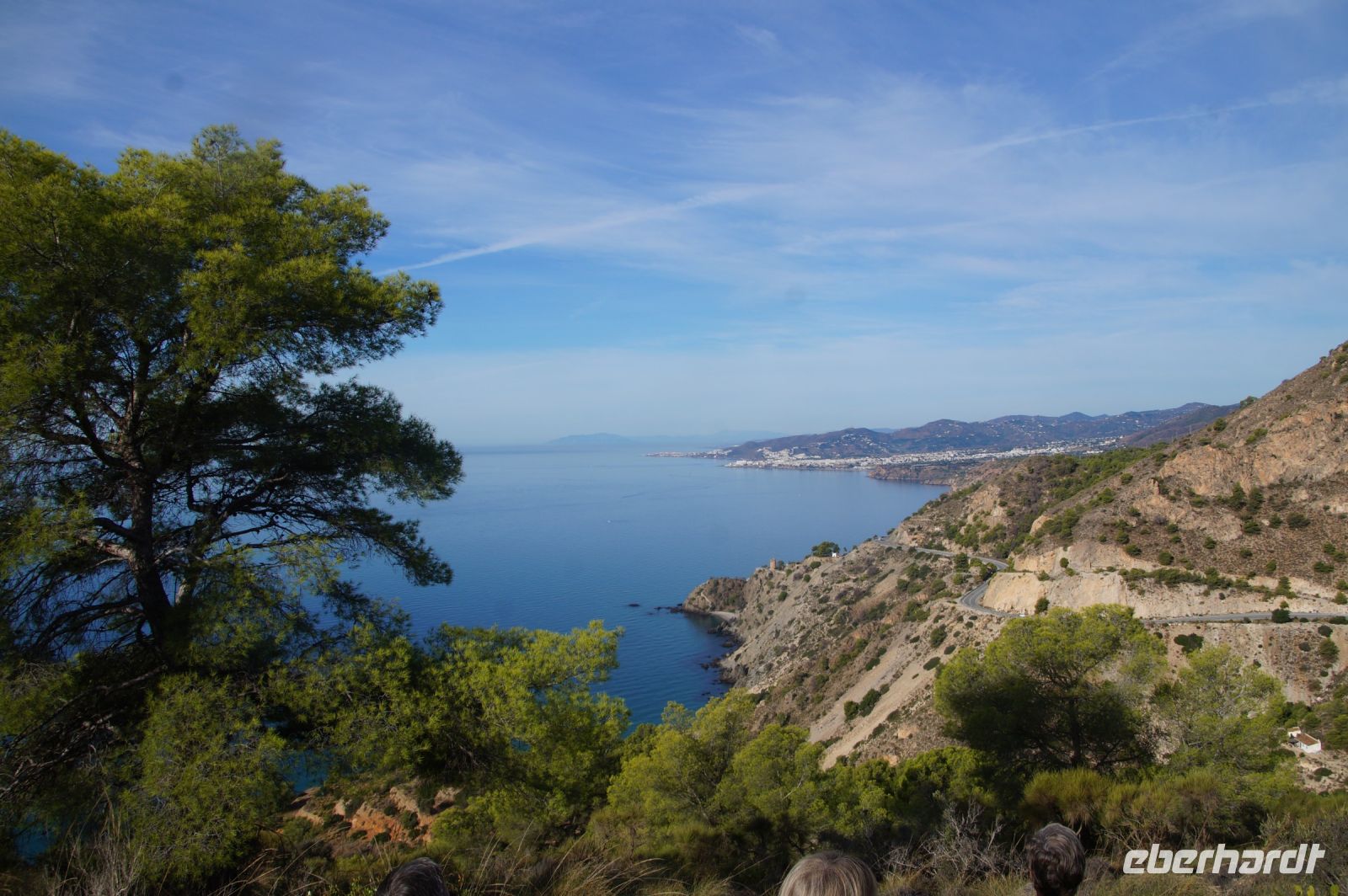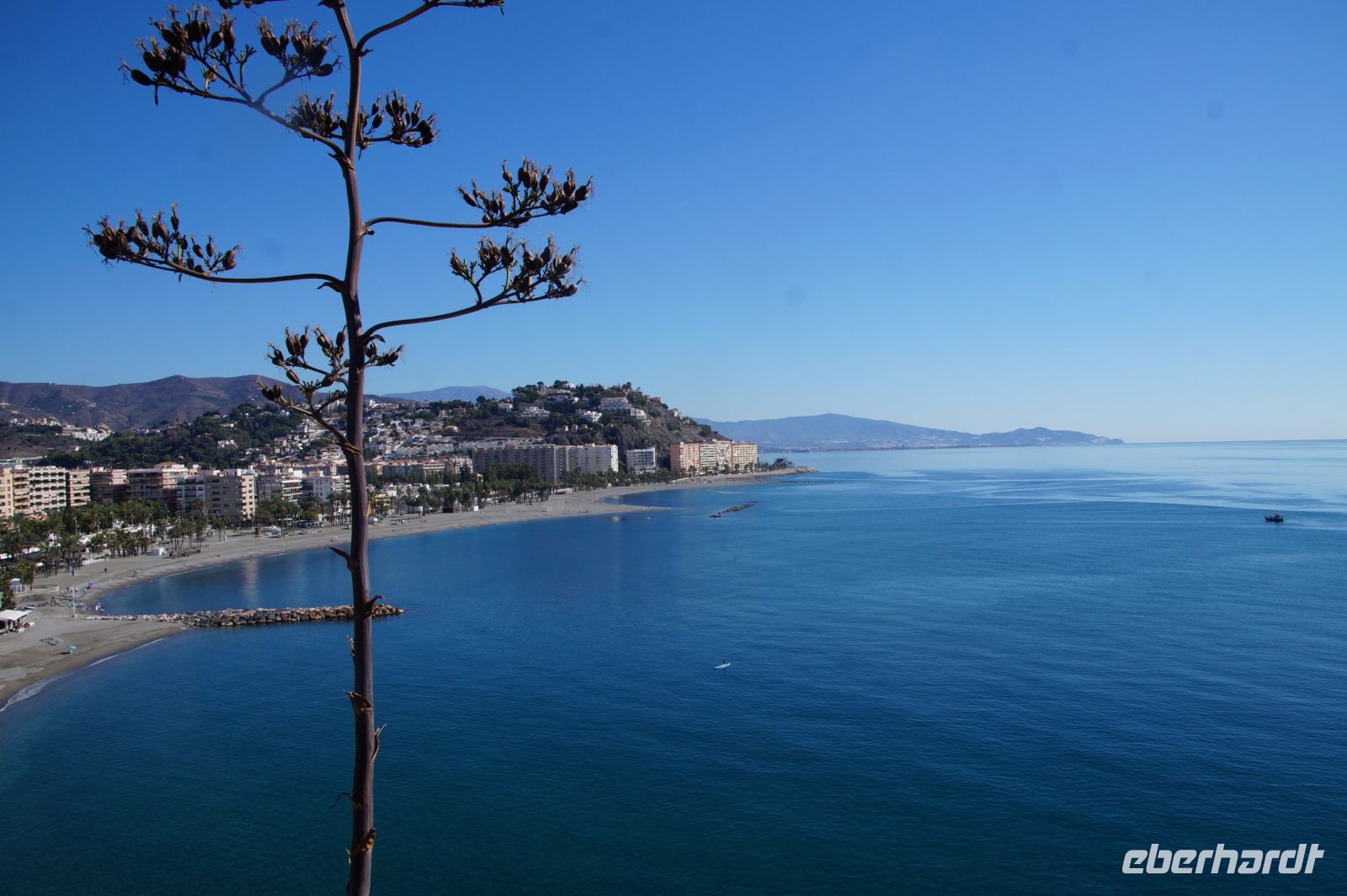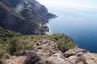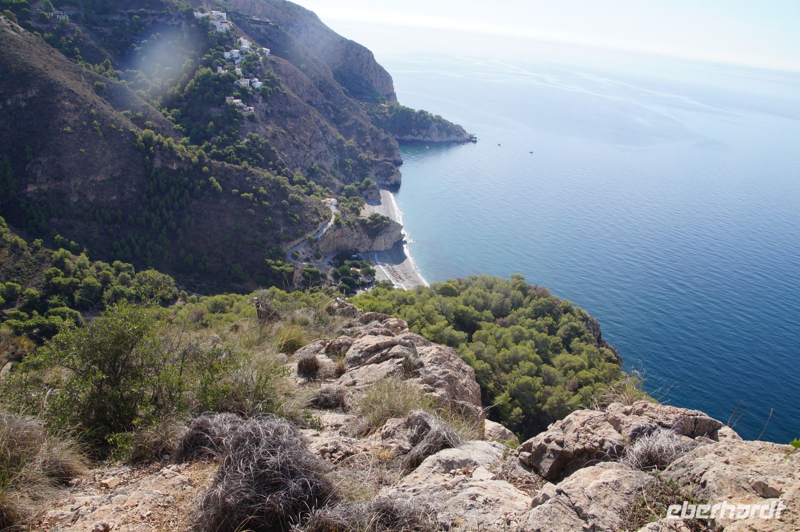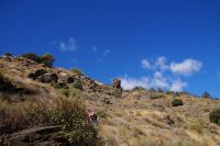 Am Morgen verlassen wir die Alpujarra und fahren in Richtung Küste. Wir folgen dem Lauf des Guadalfeo (in den der Poqueira fließt, an dem wir vorgestern entlang gewandert sind) in Richtung Küste. Wir verlassen die Alpujarra durch den Ort Orgiva, kommen am Rules-Stausee vorbei, der vom Guadalfeo gebildet wird, an der Küste passieren wir Salobreña und erreichen schließlich unseren Wanderparkplatz über den Stränden von Cantarriján und der Cala del Cañuelo. Der Plan ist, zum Cantarriján-Strand herunterzulaufen und von dort aus zur Cala del Cañuelo zu laufen. Der Wanderweg führt über einen Gebirgsgrad mit tollen Aussichten über die Küste. Ich, der ich gestern erkältungsbedingt, eine Wanderpause hatte, laufe voran, die anderen, 900 Höhenmeter in den Beinen, mir hinterher. Fehler. Irgendwann hört man einen spitzen Schrei von hinten. Ich drehe mich um und sehe zunächst nichts. Wo ist etwas passiert? Wem ist etwas passiert? Es stellt sich heraus, dass Simone mit dem Schuh an einem Stein hängen geblieben und infolgedessen gestürzt ist: Mit ihrem Oberschenkel prallt sie auf einen Stein, und fällt in einen Dornbusch.