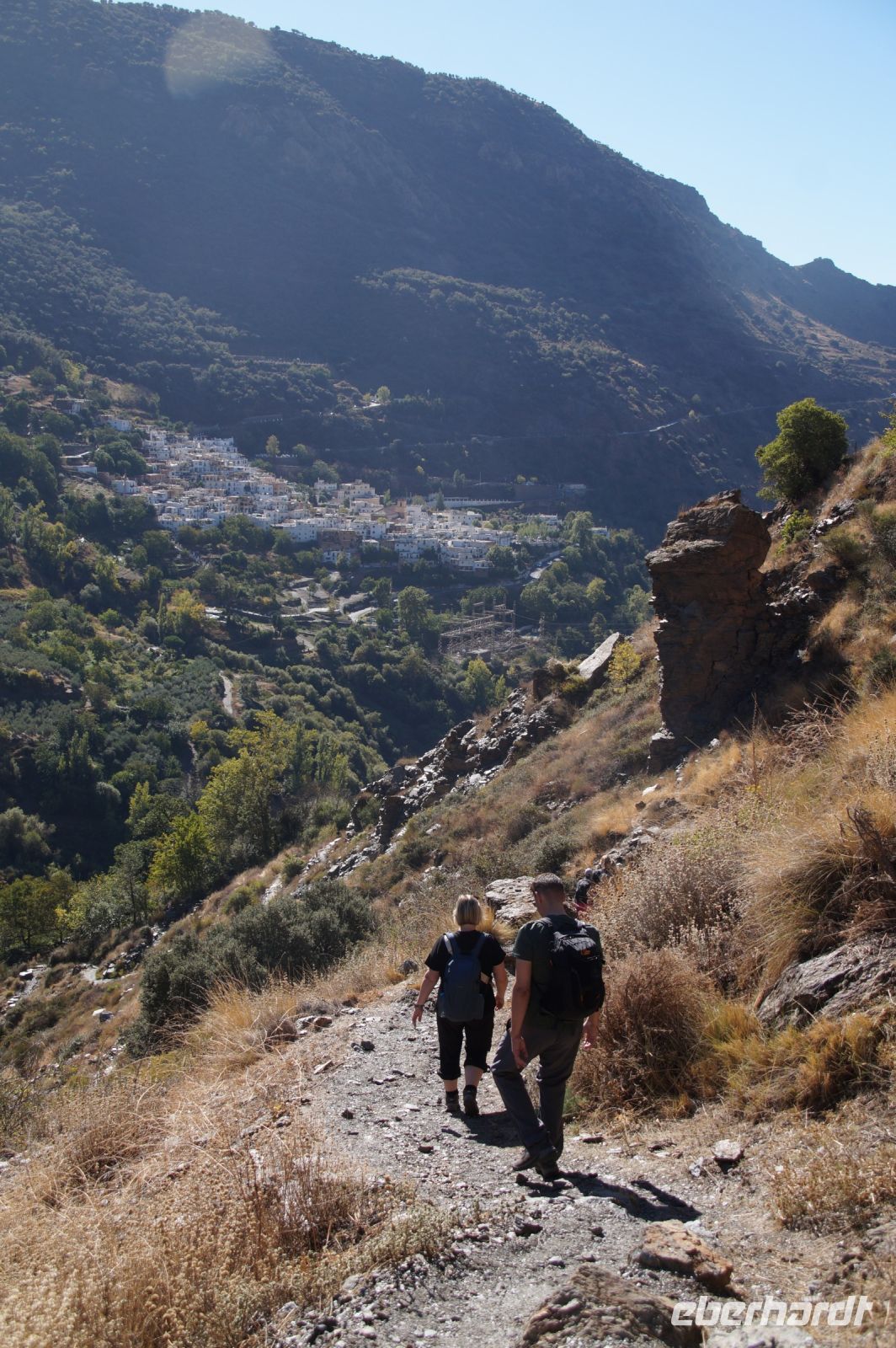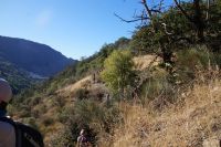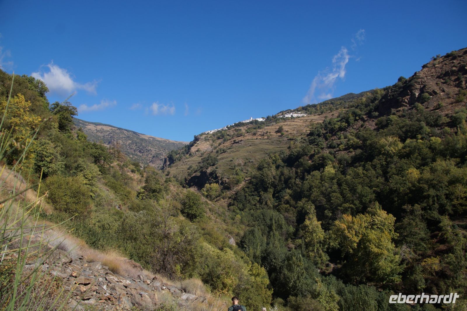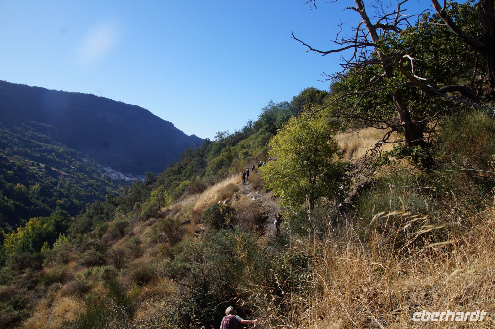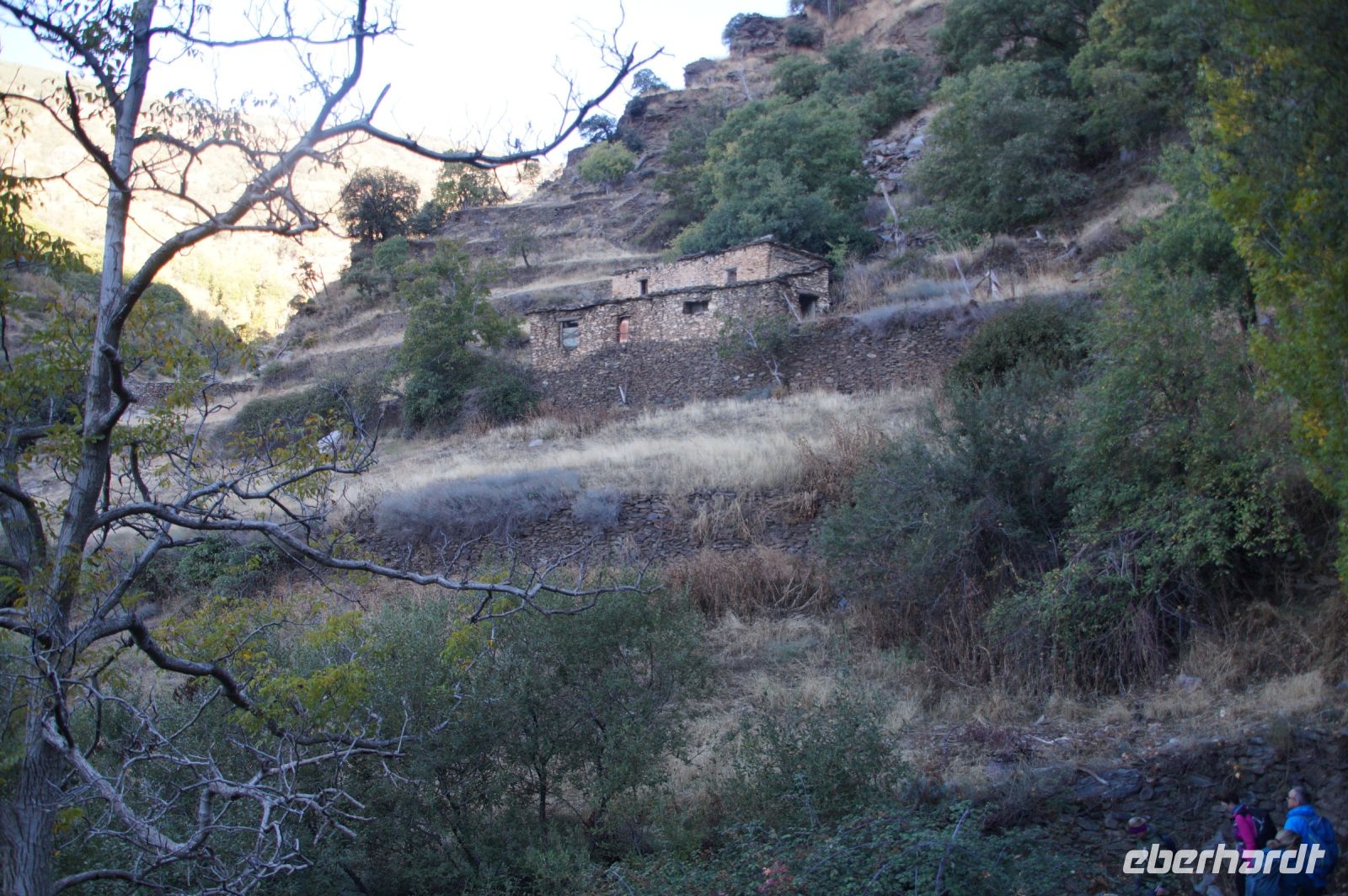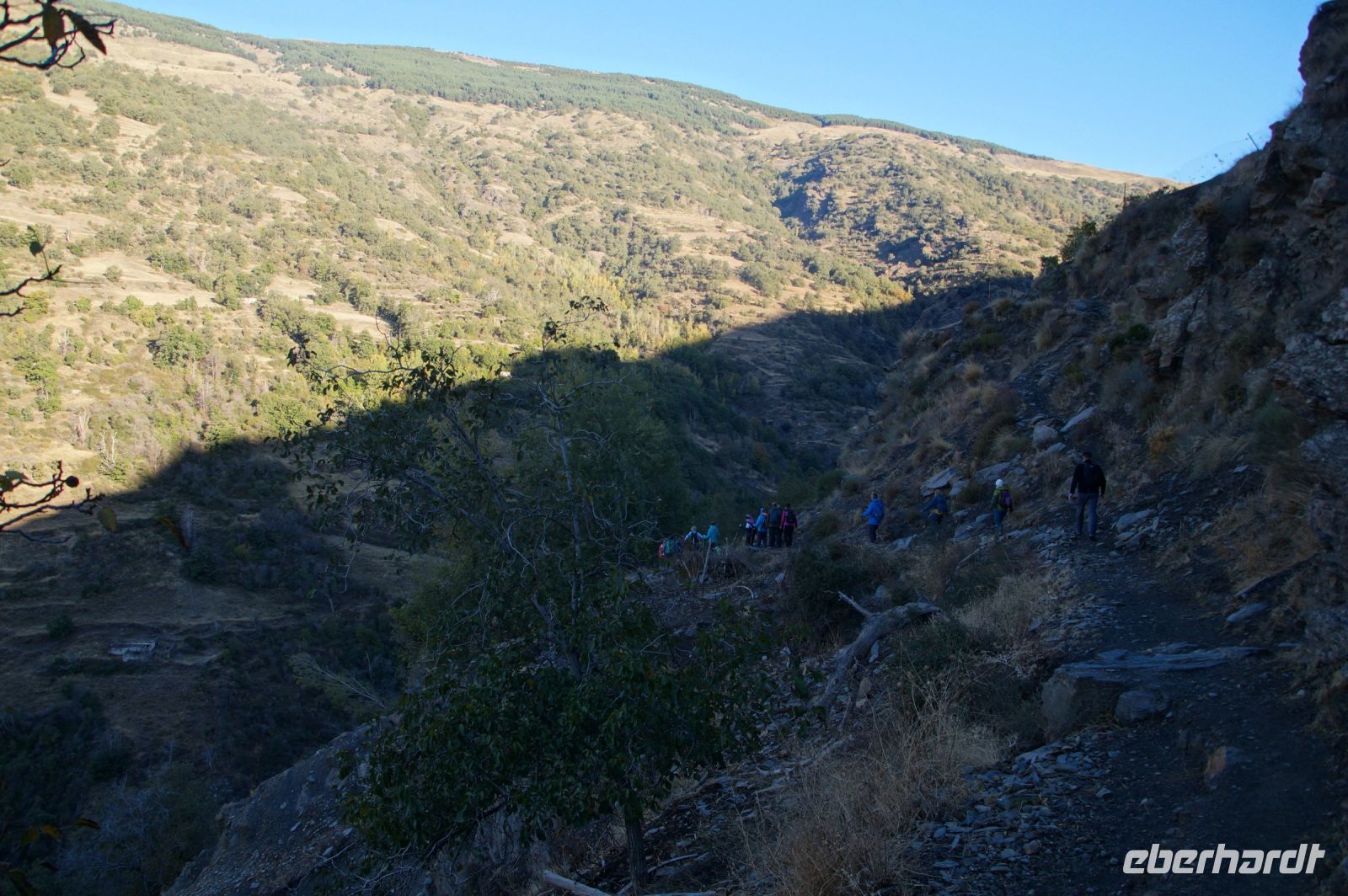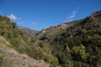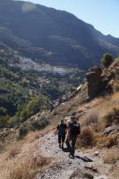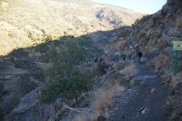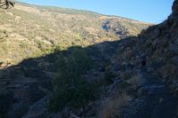 Dann steigen wir zwischen Walnussbäumen und Maronen - es ist schattig und kühl - relativ zügig hinab zum Bach Poqueira, wir überqueren den Bach und steigen am gegenüberliegenden Hang wieder ein Stück hoch. Kaum sind wir in der Sonne, wird es schnell warm und wir entledigen uns unserer Kleidung. Also nicht ganz, nur der oberen Schichten.