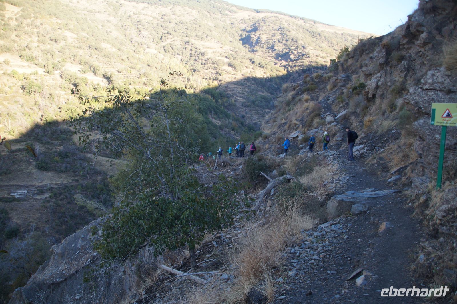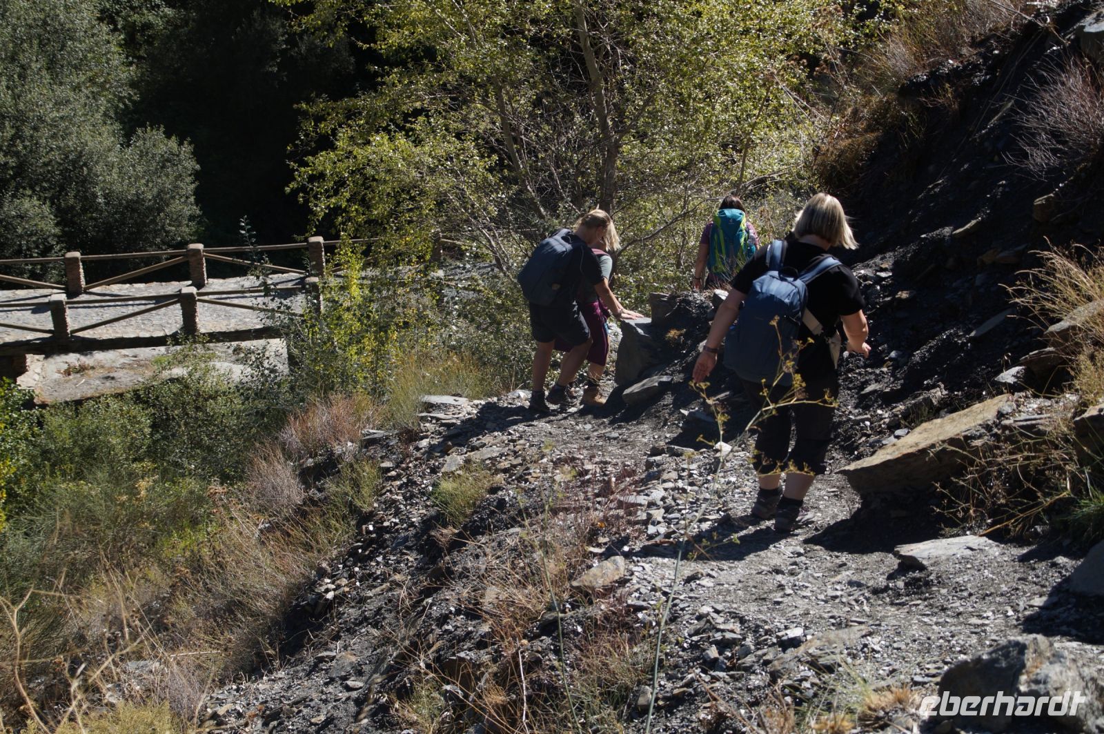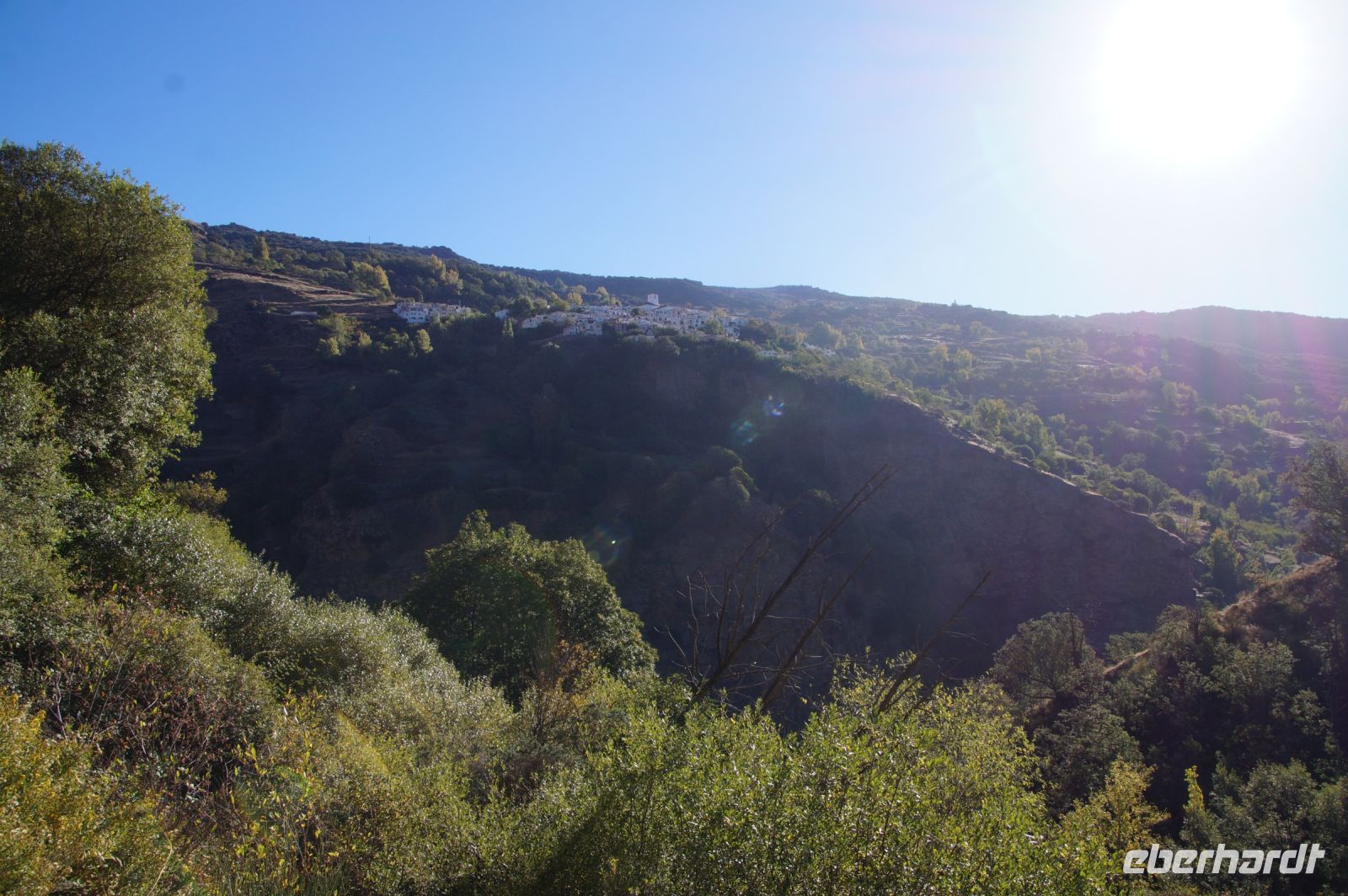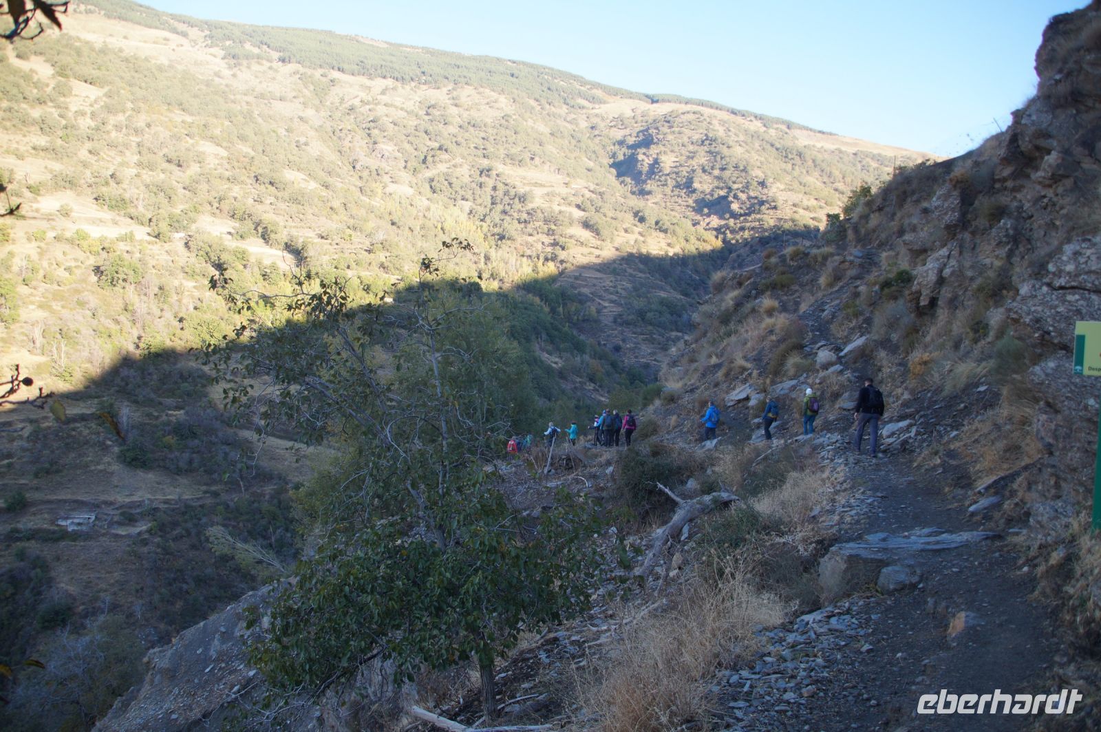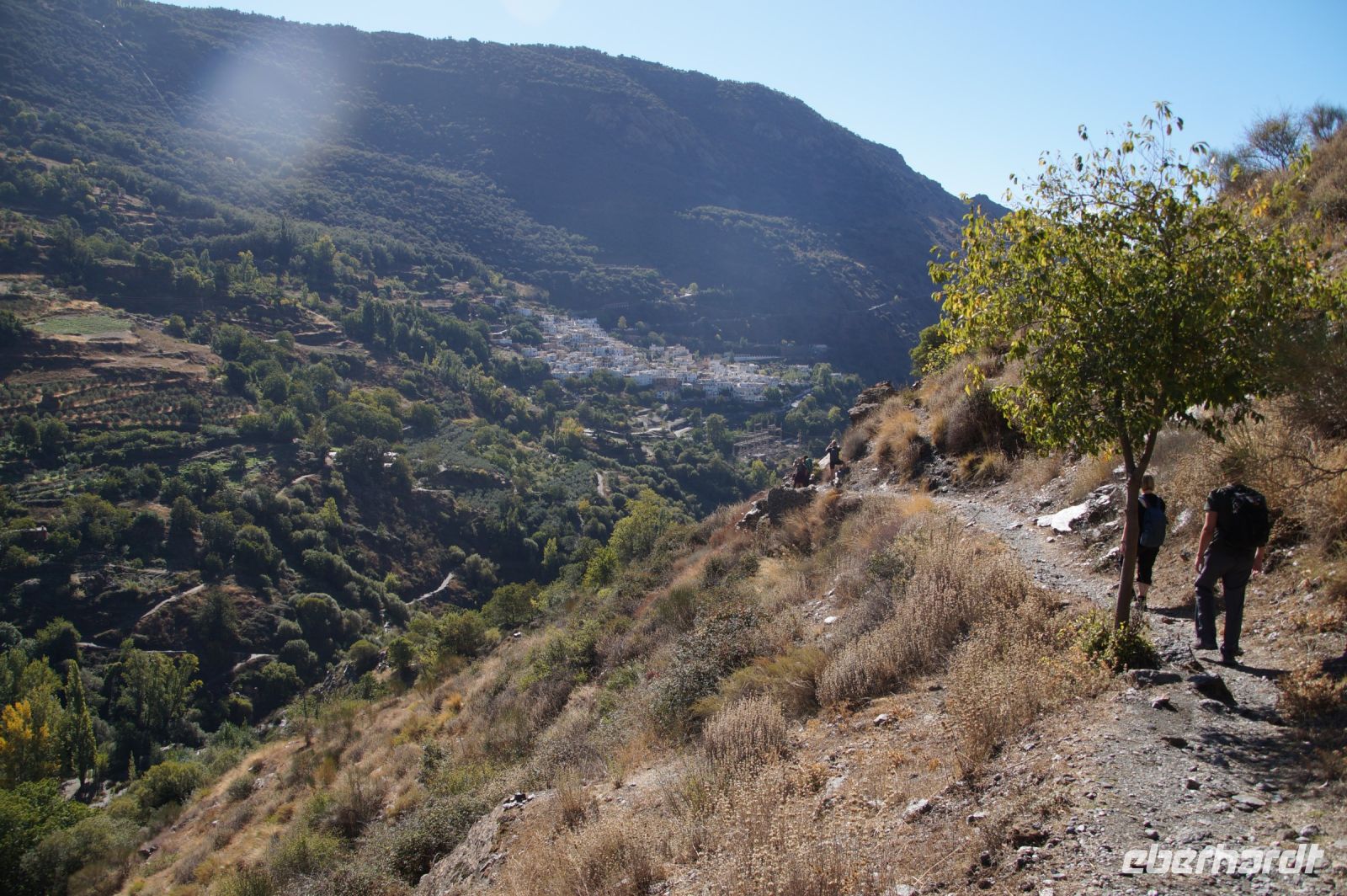 Dann steigen wir zwischen Walnussbäumen und Maronen - es ist schattig und kühl - relativ zügig hinab zum Bach Poqueira, wir überqueren den Bach und steigen am gegenüberliegenden Hang wieder ein Stück hoch. Kaum sind wir in der Sonne, wird es schnell warm und wir entledigen uns unserer Kleidung. Also nicht ganz, nur der oberen Schichten.