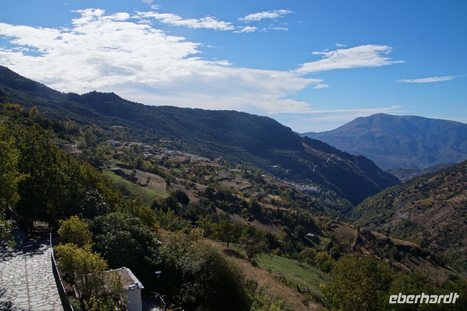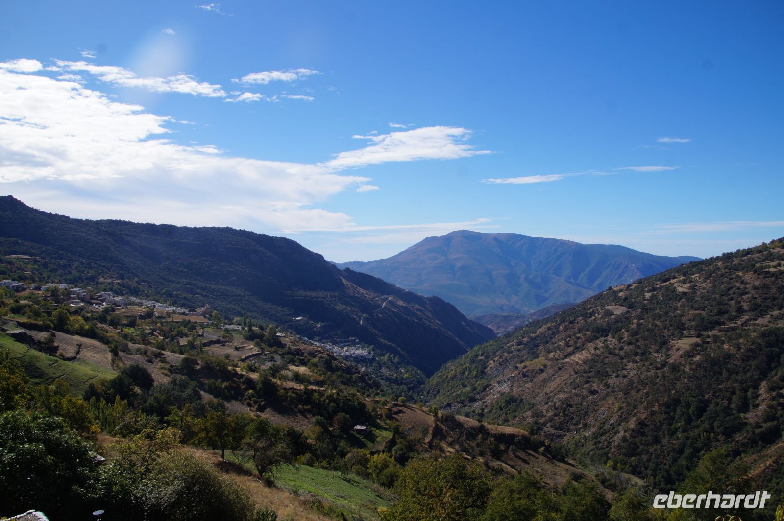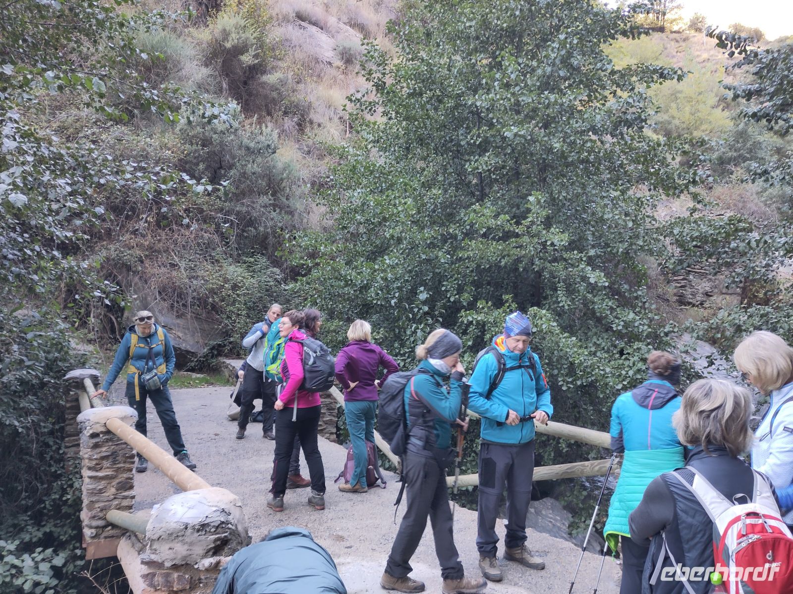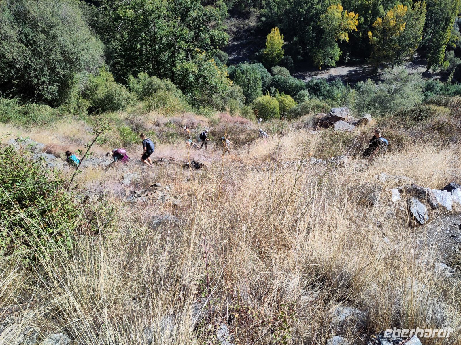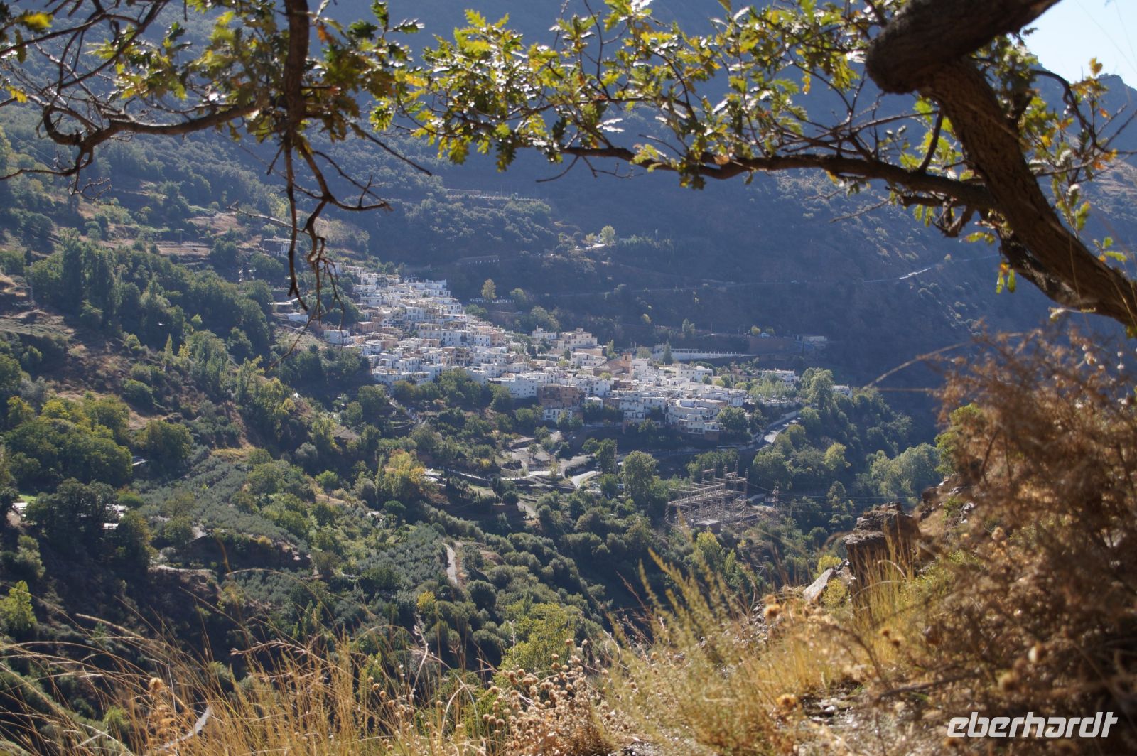 Dann steigen wir zwischen Walnussbäumen und Maronen - es ist schattig und kühl - relativ zügig hinab zum Bach Poqueira, wir überqueren den Bach und steigen am gegenüberliegenden Hang wieder ein Stück hoch. Kaum sind wir in der Sonne, wird es schnell warm und wir entledigen uns unserer Kleidung. Also nicht ganz, nur der oberen Schichten.