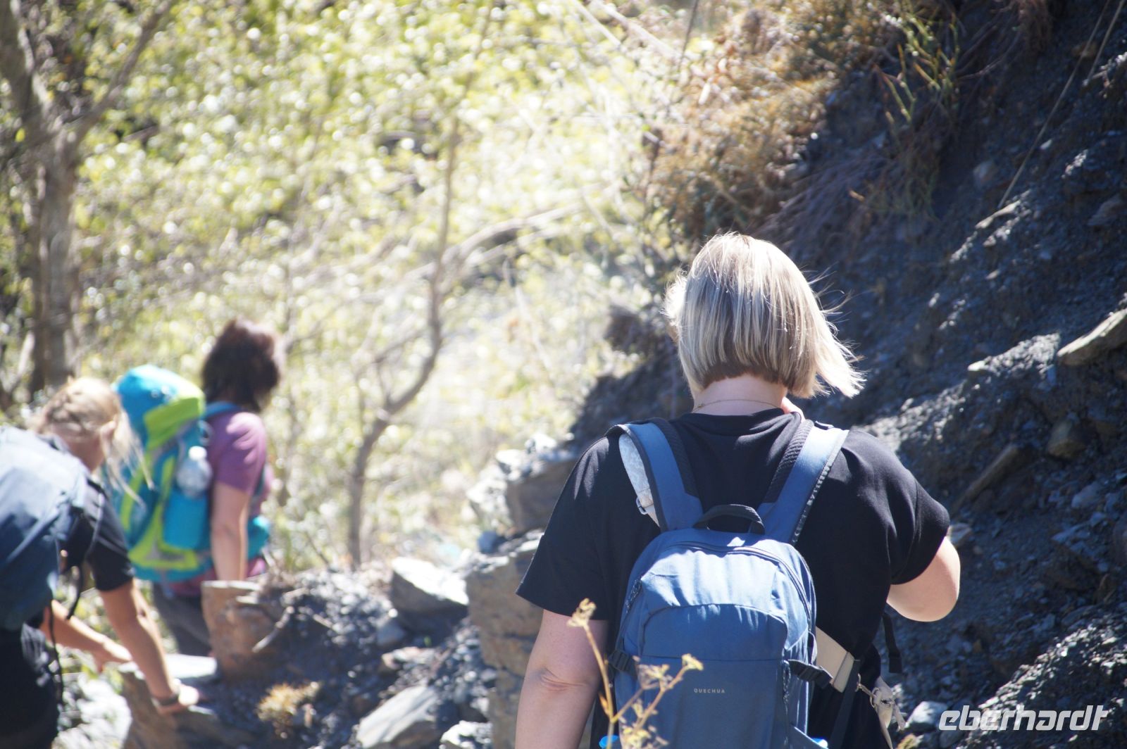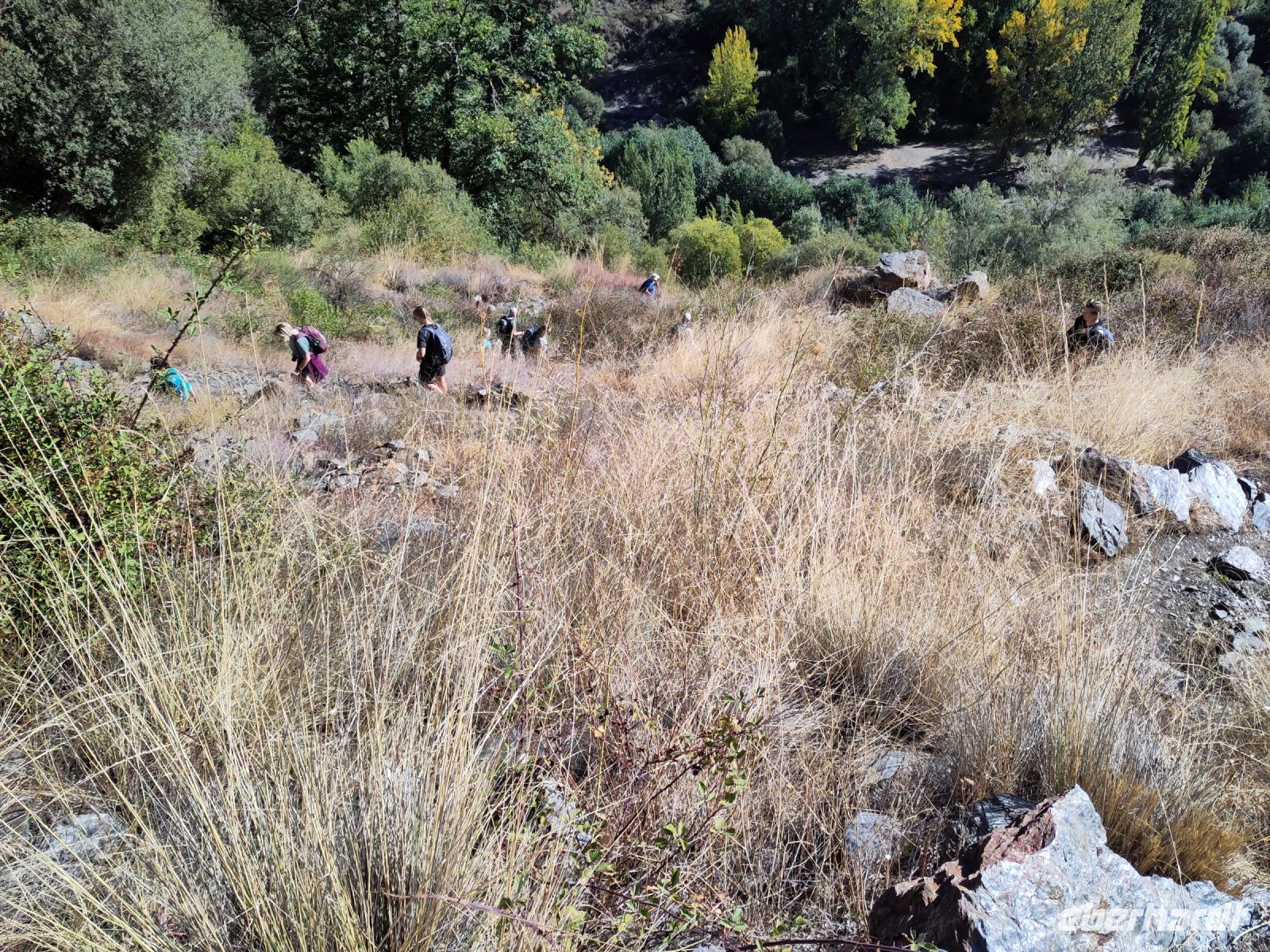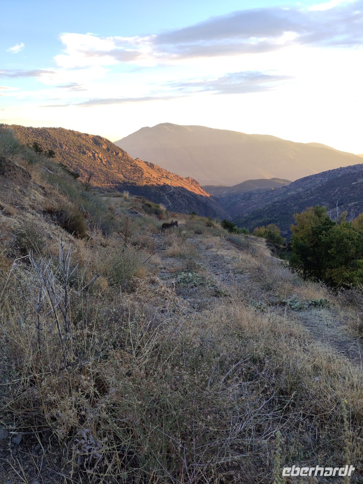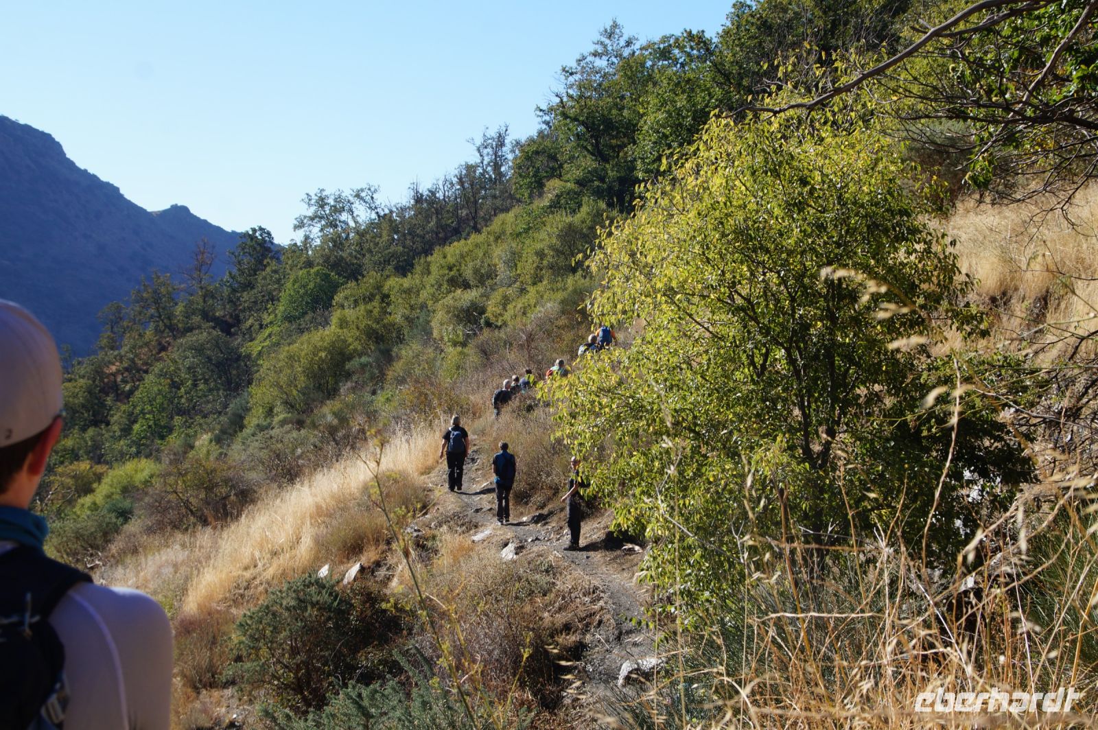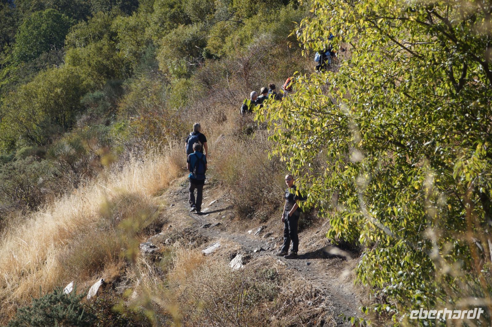 Dann steigen wir zwischen Walnussbäumen und Maronen - es ist schattig und kühl - relativ zügig hinab zum Bach Poqueira, wir überqueren den Bach und steigen am gegenüberliegenden Hang wieder ein Stück hoch. Kaum sind wir in der Sonne, wird es schnell warm und wir entledigen uns unserer Kleidung. Also nicht ganz, nur der oberen Schichten.