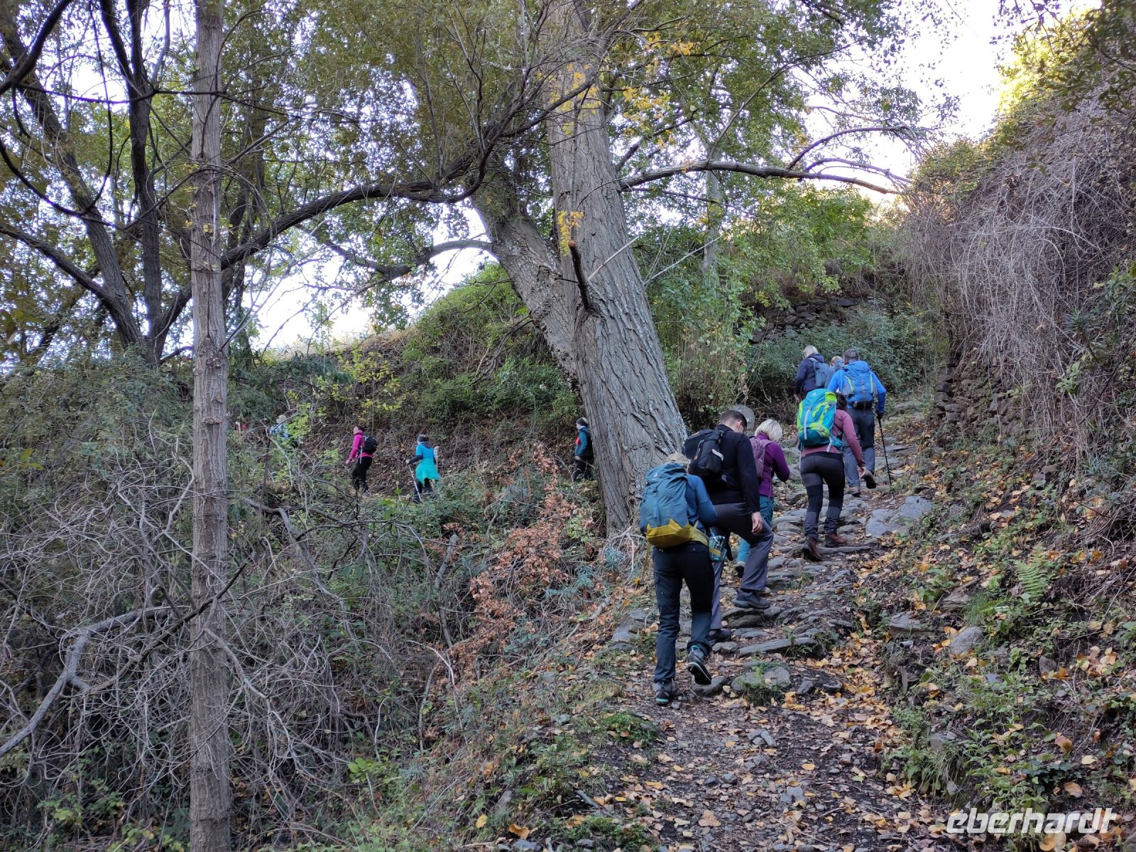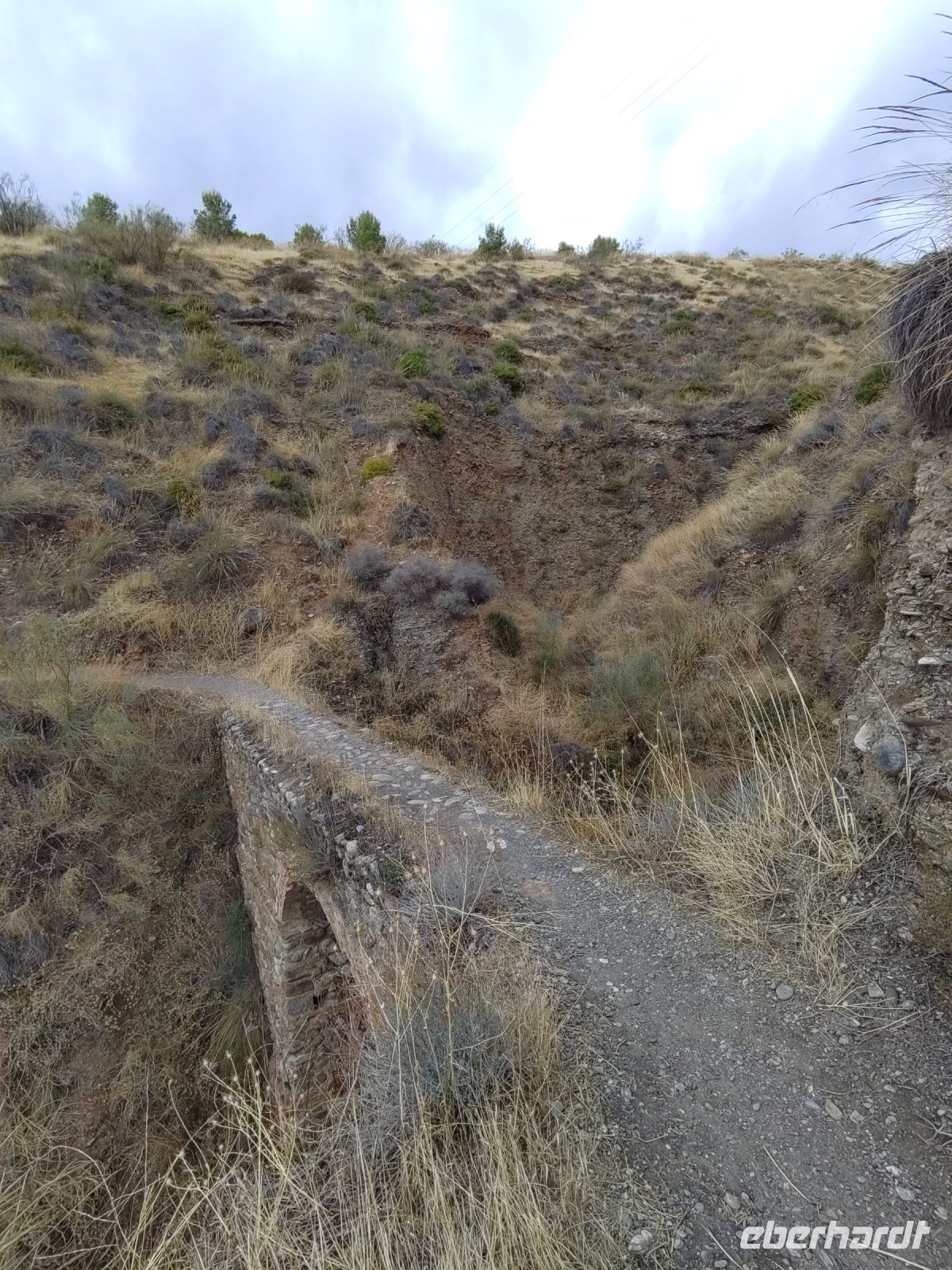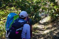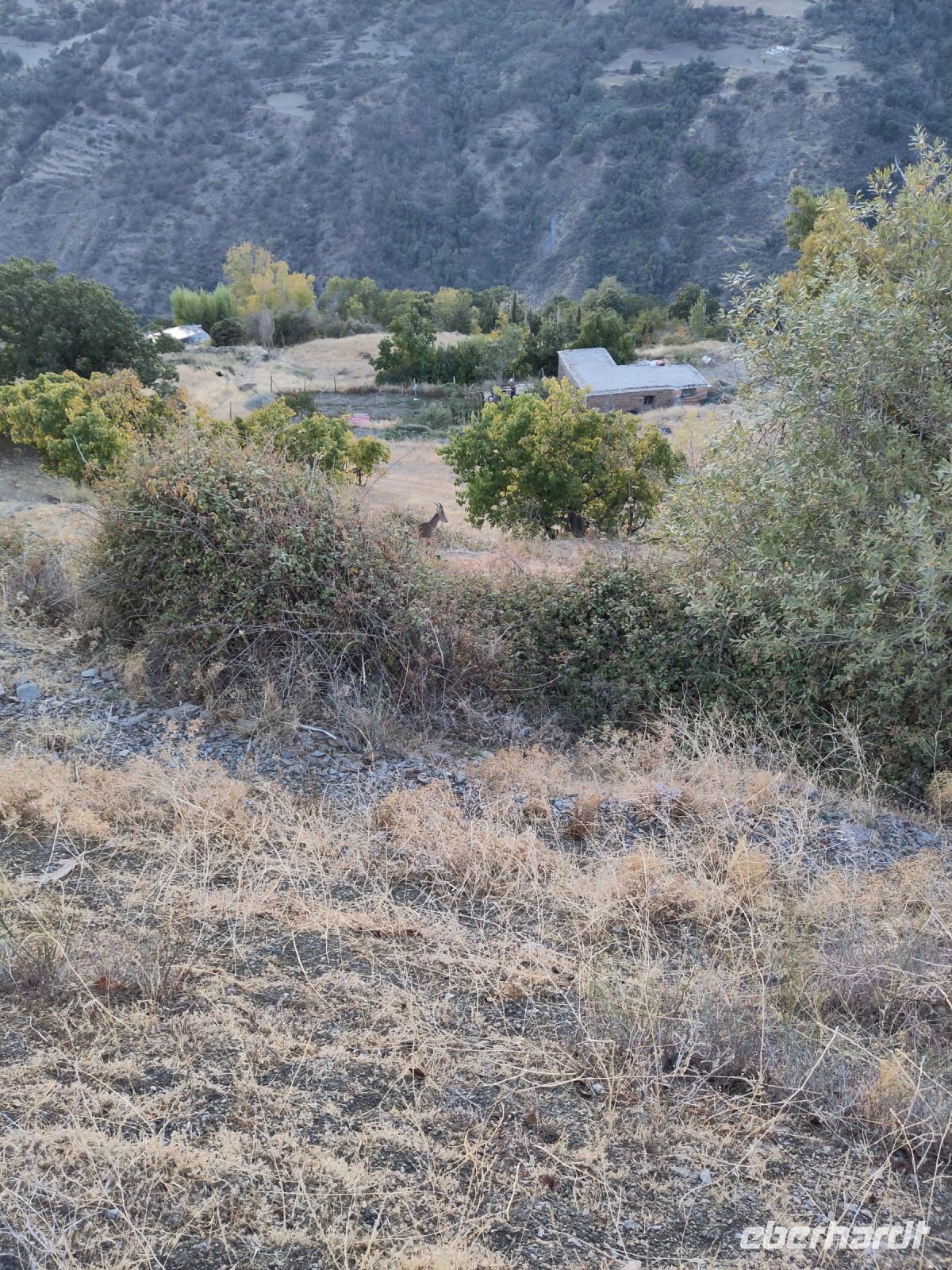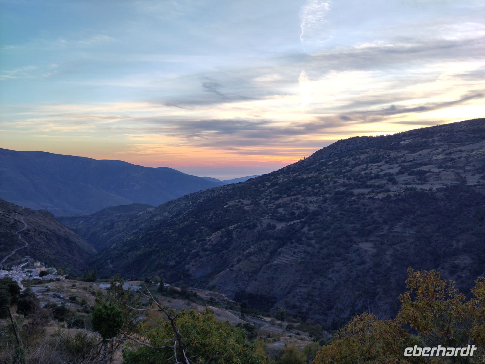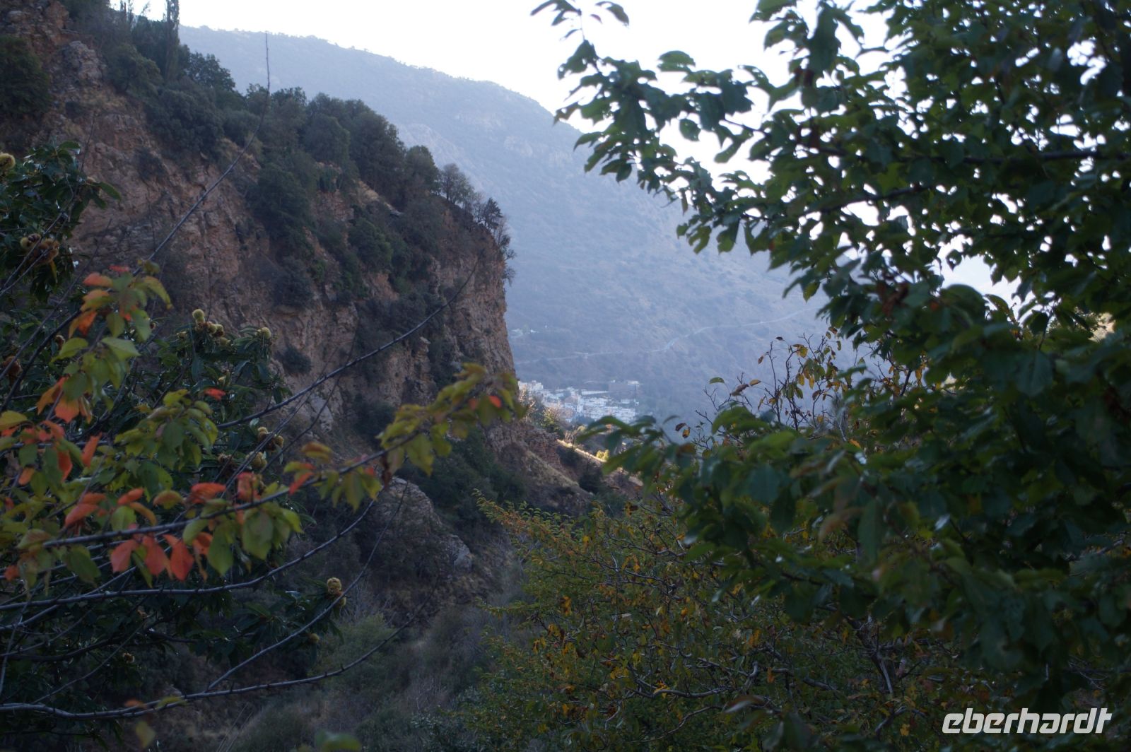 Dann steigen wir zwischen Walnussbäumen und Maronen - es ist schattig und kühl - relativ zügig hinab zum Bach Poqueira, wir überqueren den Bach und steigen am gegenüberliegenden Hang wieder ein Stück hoch. Kaum sind wir in der Sonne, wird es schnell warm und wir entledigen uns unserer Kleidung. Also nicht ganz, nur der oberen Schichten.
