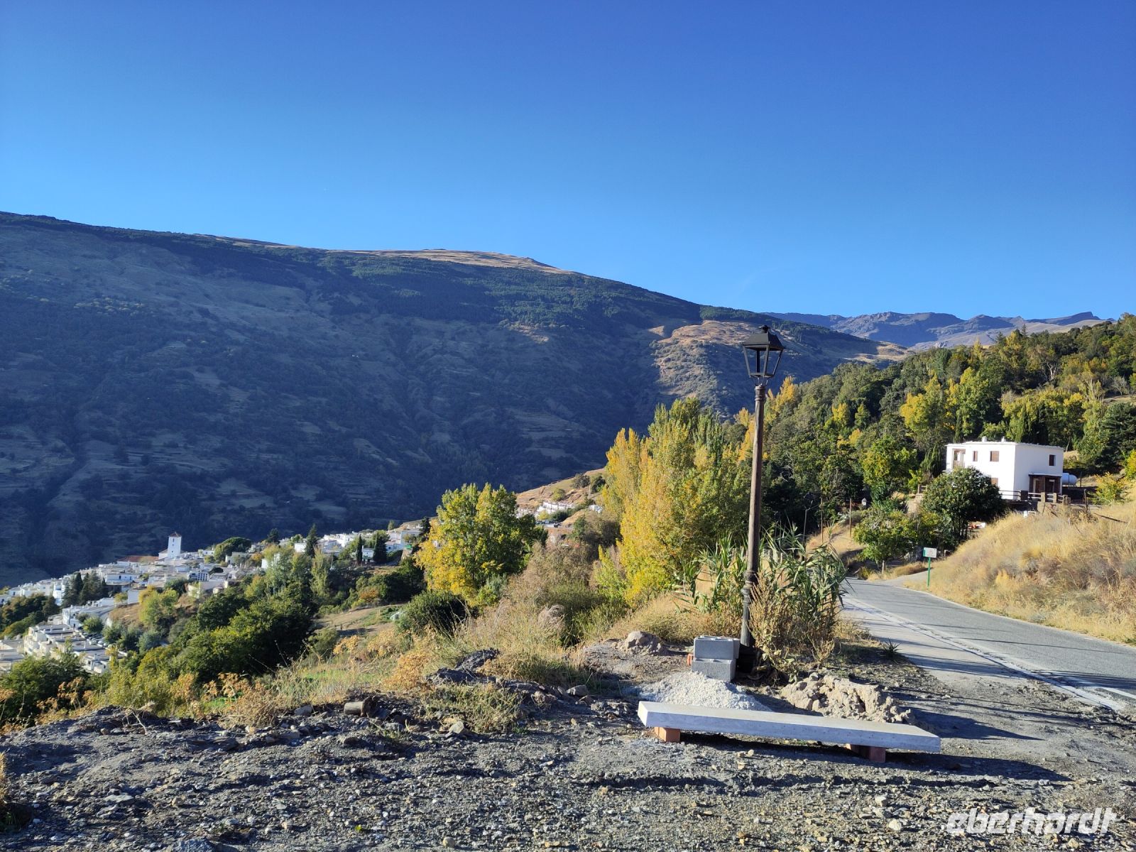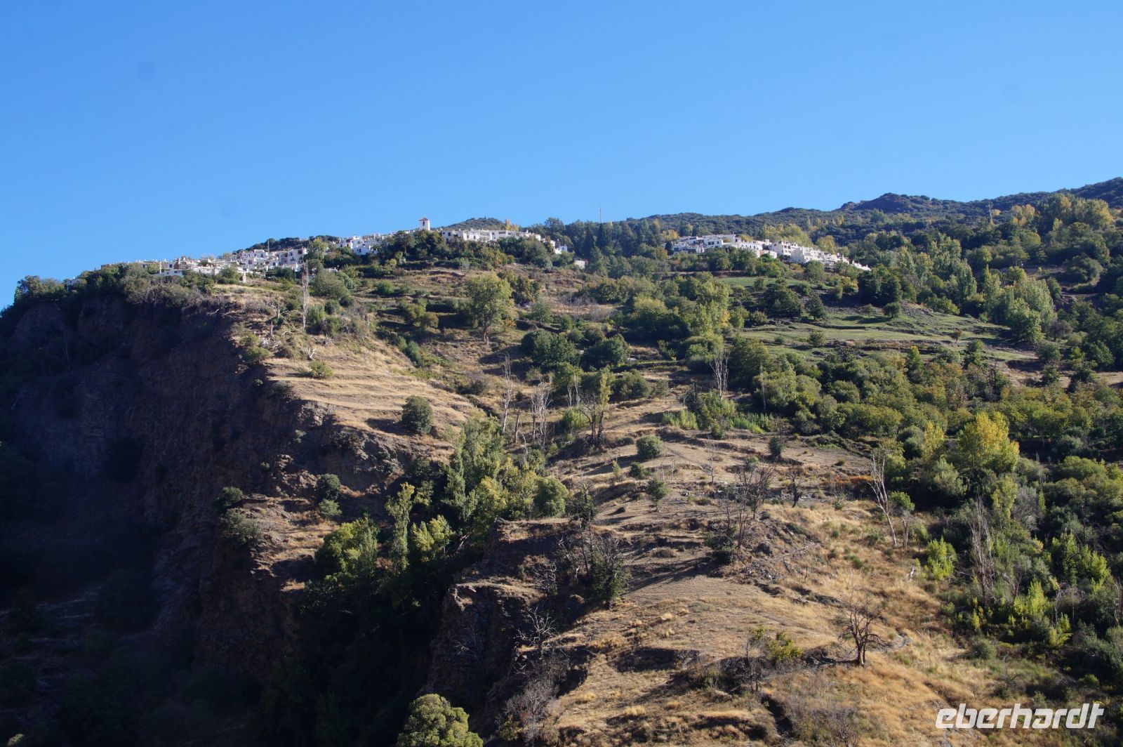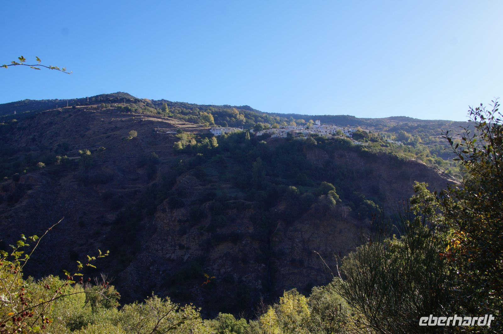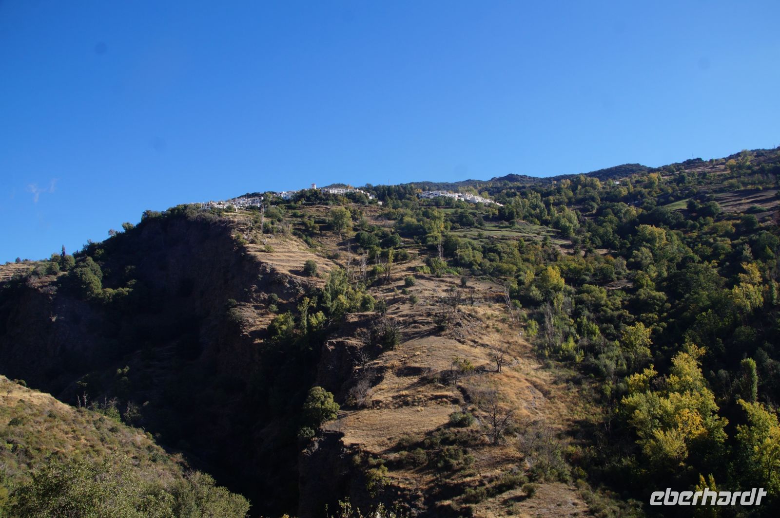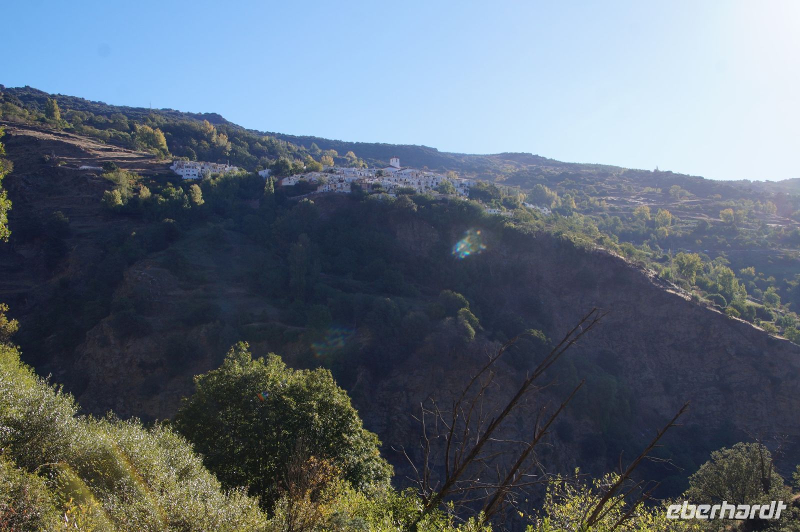 Wir wandern fortan durch die Sonne und schauen zu den drei Dörfern hinüber, die auf unserem Weg liegen: Oben liegt Capileira, unser Start- und Zielpunkt, in der Mitte Bubión, und unten Pamapeneira, der tiefeste Punkt, den wir bei der Wanderung erreichen werden und wo wir unser Picknick machen werden. Wir wandern also durch die Sonne und schauen rüber auf die im Schatten liegenden Hänge auf der anderen Seite des tiefen Einschnitts, den der Poquira in den Berg gegraben hat. José erklärt uns, dass das da drüben, was jetzt im Schatten liegt, eigentlich die Sonnenseite ist, wohingegen die Seite, auf der wir jetzt durch die Sonne wandeln, eigentlich die Schattenseite sei. Auf Nachfrage bestätigt er das und weist auf die Dörfer hin: Deshalb liegen sie auf der Gegenseite, während hier, auf dieser Seite nur vereinzelte, verlassene Kleinstbauernhöfe sind.