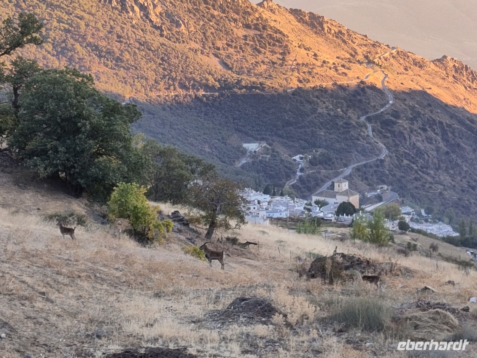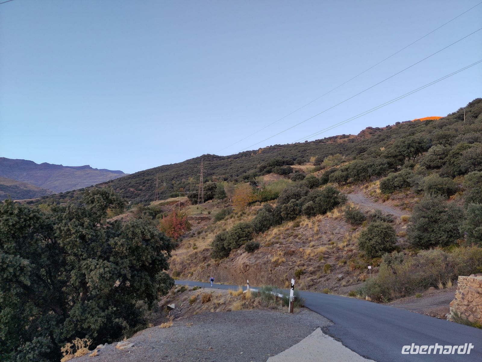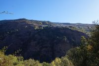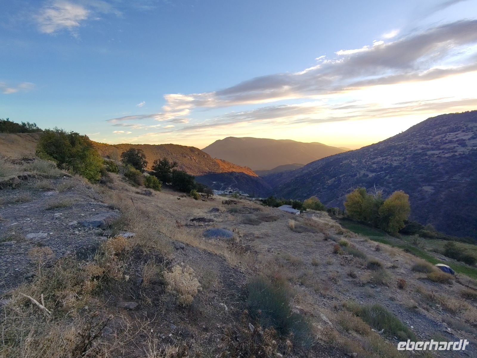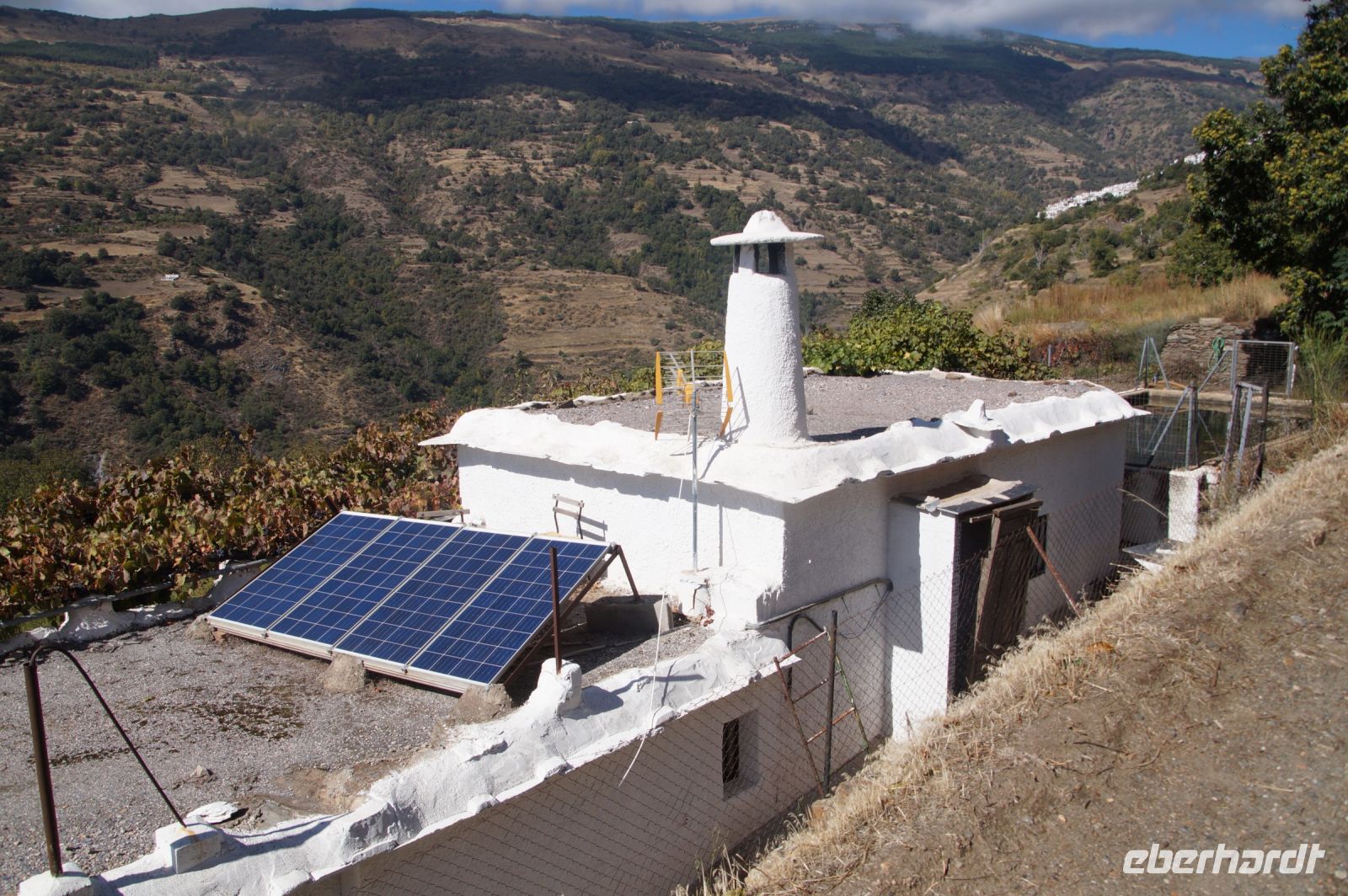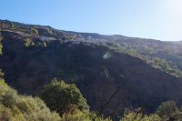 Wir wandern fortan durch die Sonne und schauen zu den drei Dörfern hinüber, die auf unserem Weg liegen: Oben liegt Capileira, unser Start- und Zielpunkt, in der Mitte Bubión, und unten Pamapeneira, der tiefeste Punkt, den wir bei der Wanderung erreichen werden und wo wir unser Picknick machen werden. Wir wandern also durch die Sonne und schauen rüber auf die im Schatten liegenden Hänge auf der anderen Seite des tiefen Einschnitts, den der Poquira in den Berg gegraben hat. José erklärt uns, dass das da drüben, was jetzt im Schatten liegt, eigentlich die Sonnenseite ist, wohingegen die Seite, auf der wir jetzt durch die Sonne wandeln, eigentlich die Schattenseite sei. Auf Nachfrage bestätigt er das und weist auf die Dörfer hin: Deshalb liegen sie auf der Gegenseite, während hier, auf dieser Seite nur vereinzelte, verlassene Kleinstbauernhöfe sind.