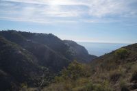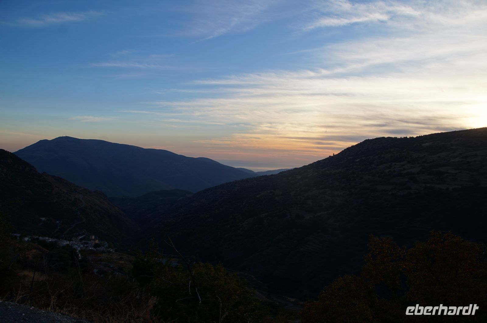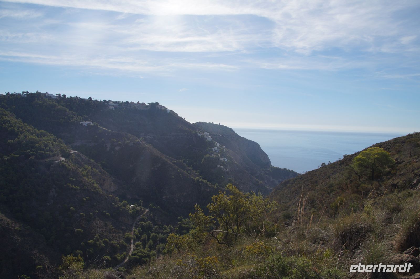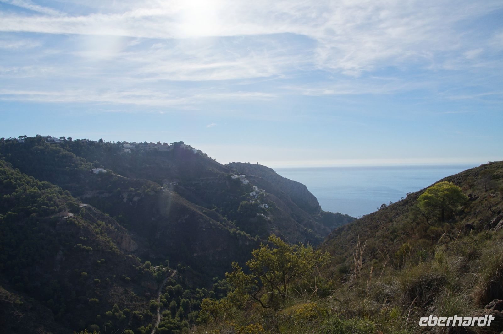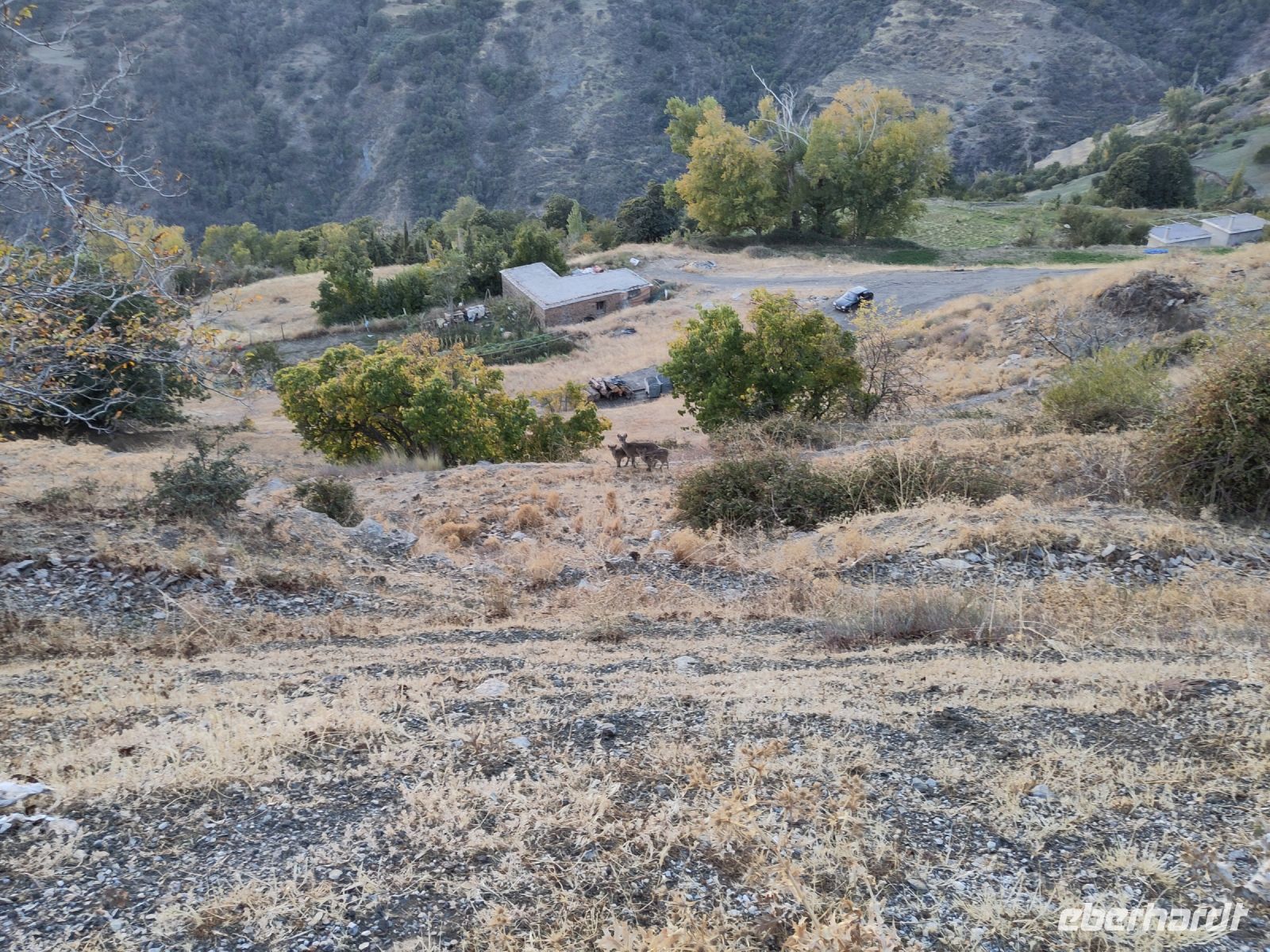 Wir wandern fortan durch die Sonne und schauen zu den drei Dörfern hinüber, die auf unserem Weg liegen: Oben liegt Capileira, unser Start- und Zielpunkt, in der Mitte Bubión, und unten Pamapeneira, der tiefeste Punkt, den wir bei der Wanderung erreichen werden und wo wir unser Picknick machen werden. Wir wandern also durch die Sonne und schauen rüber auf die im Schatten liegenden Hänge auf der anderen Seite des tiefen Einschnitts, den der Poquira in den Berg gegraben hat. José erklärt uns, dass das da drüben, was jetzt im Schatten liegt, eigentlich die Sonnenseite ist, wohingegen die Seite, auf der wir jetzt durch die Sonne wandeln, eigentlich die Schattenseite sei. Auf Nachfrage bestätigt er das und weist auf die Dörfer hin: Deshalb liegen sie auf der Gegenseite, während hier, auf dieser Seite nur vereinzelte, verlassene Kleinstbauernhöfe sind.