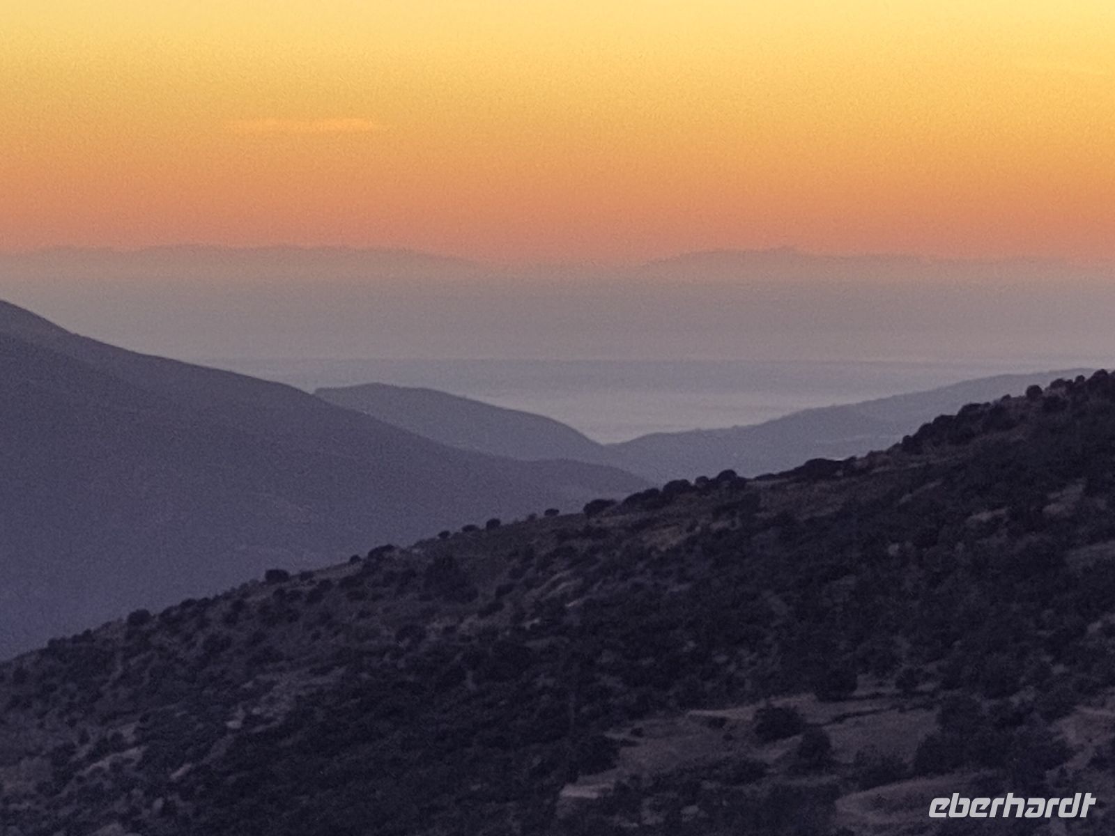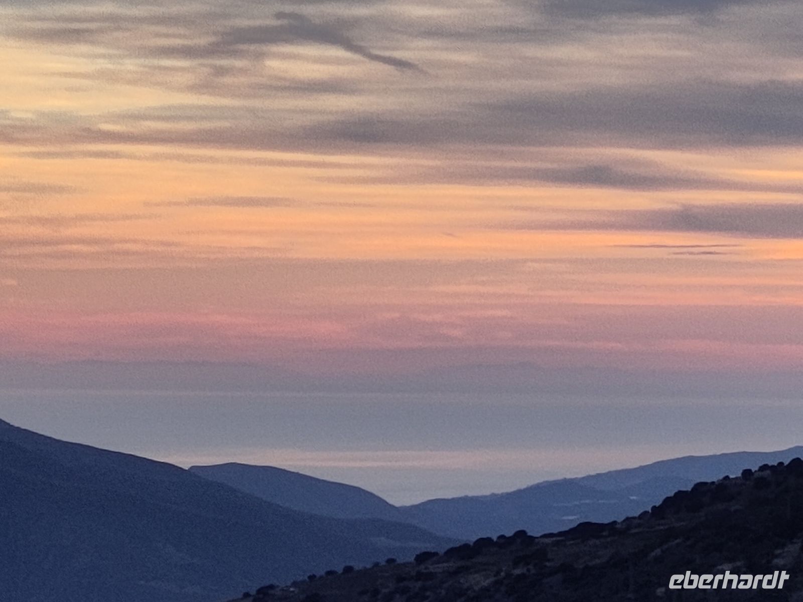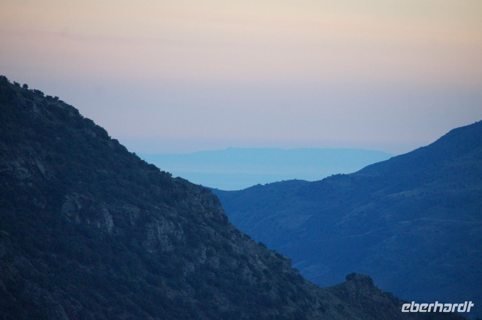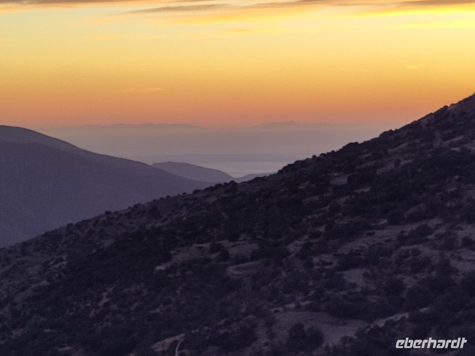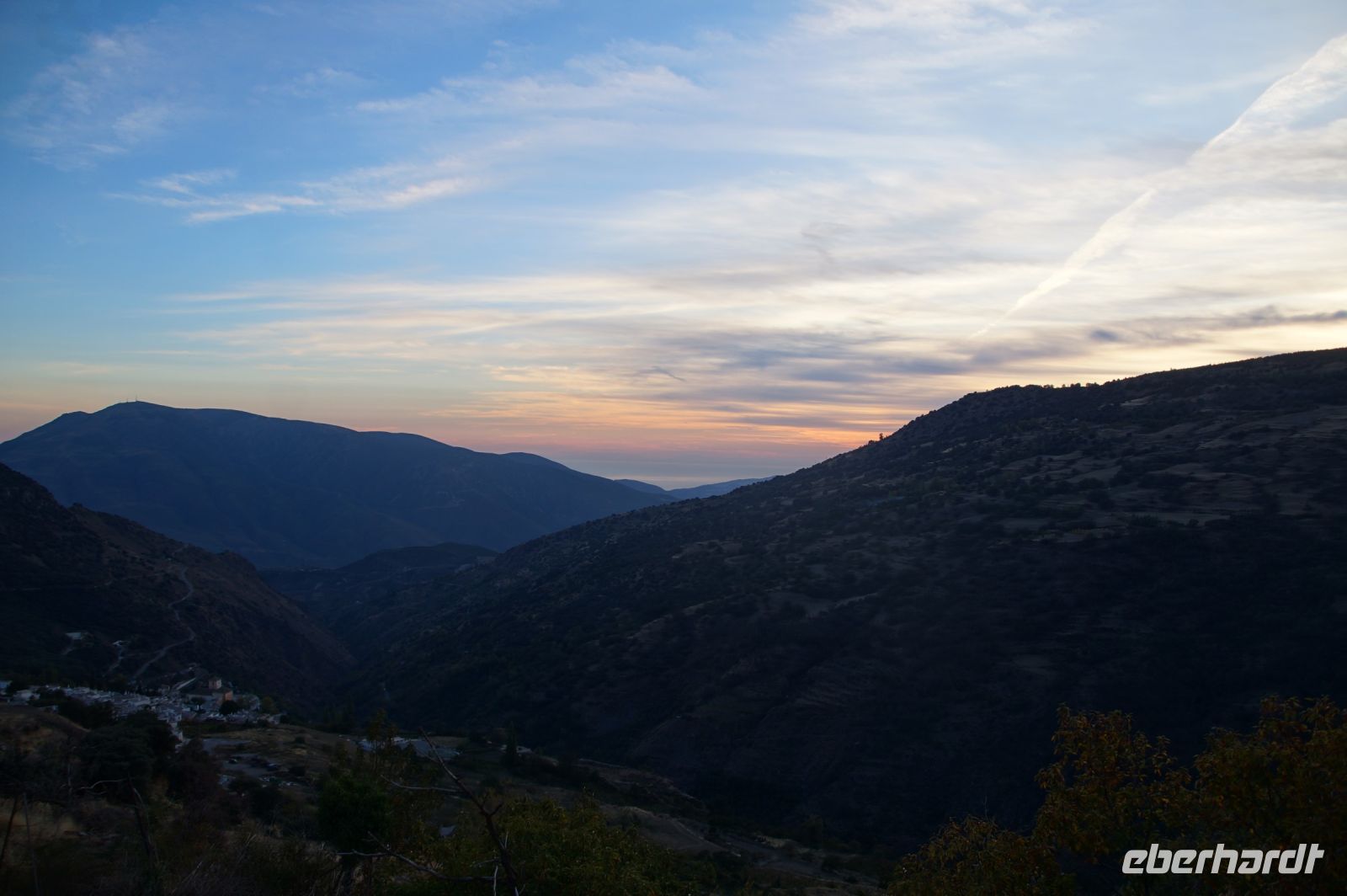 Wir wandern fortan durch die Sonne und schauen zu den drei Dörfern hinüber, die auf unserem Weg liegen: Oben liegt Capileira, unser Start- und Zielpunkt, in der Mitte Bubión, und unten Pamapeneira, der tiefeste Punkt, den wir bei der Wanderung erreichen werden und wo wir unser Picknick machen werden. Wir wandern also durch die Sonne und schauen rüber auf die im Schatten liegenden Hänge auf der anderen Seite des tiefen Einschnitts, den der Poquira in den Berg gegraben hat. José erklärt uns, dass das da drüben, was jetzt im Schatten liegt, eigentlich die Sonnenseite ist, wohingegen die Seite, auf der wir jetzt durch die Sonne wandeln, eigentlich die Schattenseite sei. Auf Nachfrage bestätigt er das und weist auf die Dörfer hin: Deshalb liegen sie auf der Gegenseite, während hier, auf dieser Seite nur vereinzelte, verlassene Kleinstbauernhöfe sind.