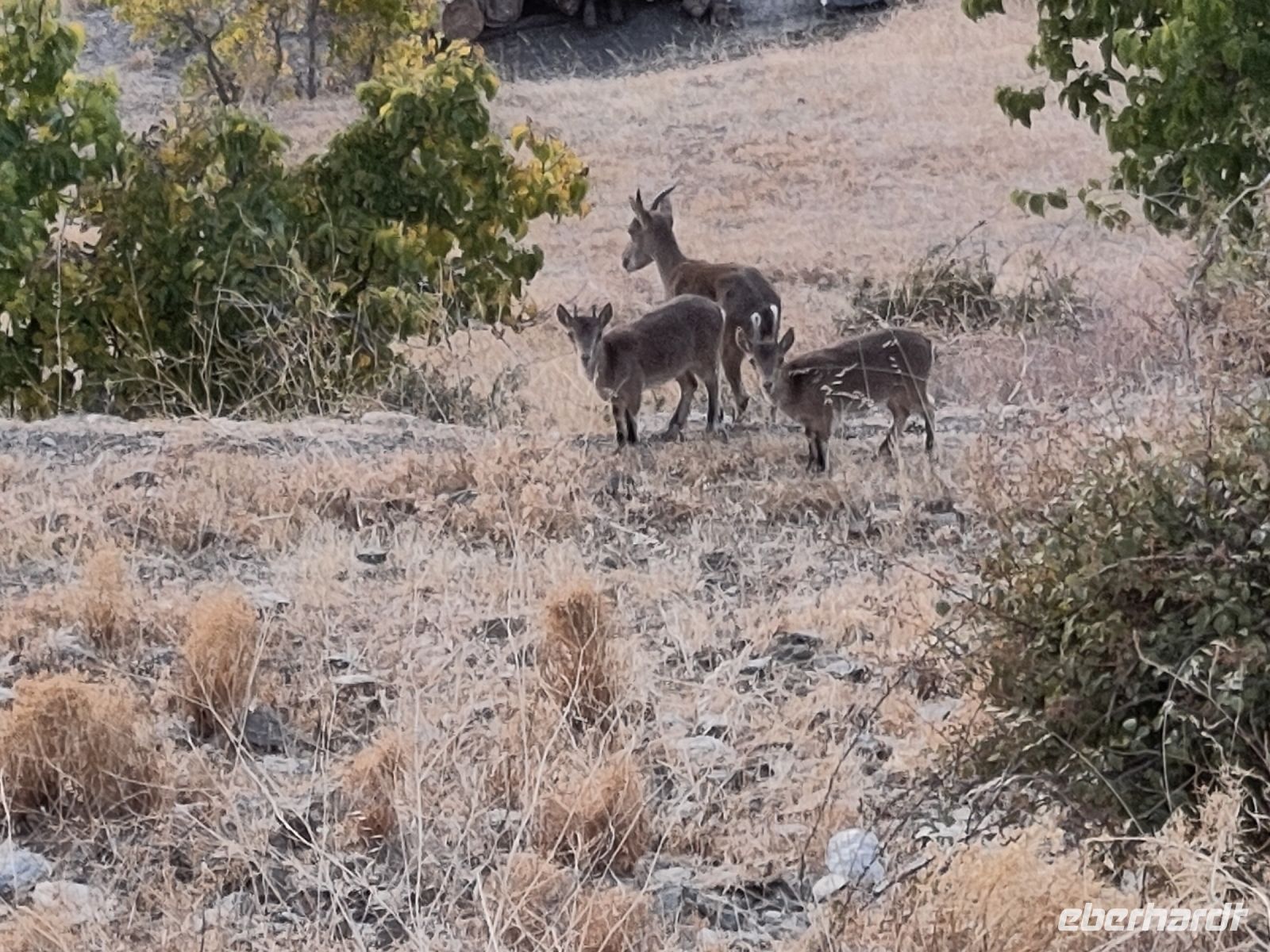 An einer alten Dreschplattform, an der wir halt machen, macht er uns auf die hier wachsenden Pyrenäeneichen aufmerksam, ein Überbleibsel aus einer anderen Klimaepoche, nachher würde er uns auf der anderen Seite die Steineichen zeigen. Warum wachsen hier großblättrige Pyrenäeneichen (die Blätter weisen erst bei genauerem Hinsehen einige Unterschiede zu unseren Stiel- und Traubeneichen auf) und auf der Gegenseite die kleiblättrigen Steineichen? Eben weil wir hier auf der Schattenseite sind, wo die Bäume sich erlauben können, mehr Wasser zu verdunsten, auf der Sonnenseite hingegen der mediterranere Eichenbewuchst, weil hier das Wasser durch mehr Sonnenstunden am Tag schneller verdunstet.