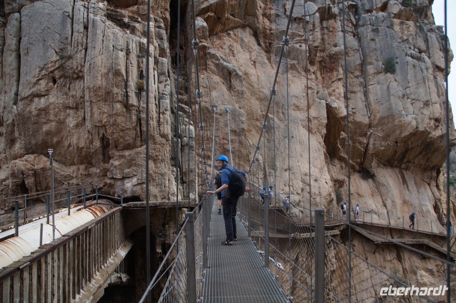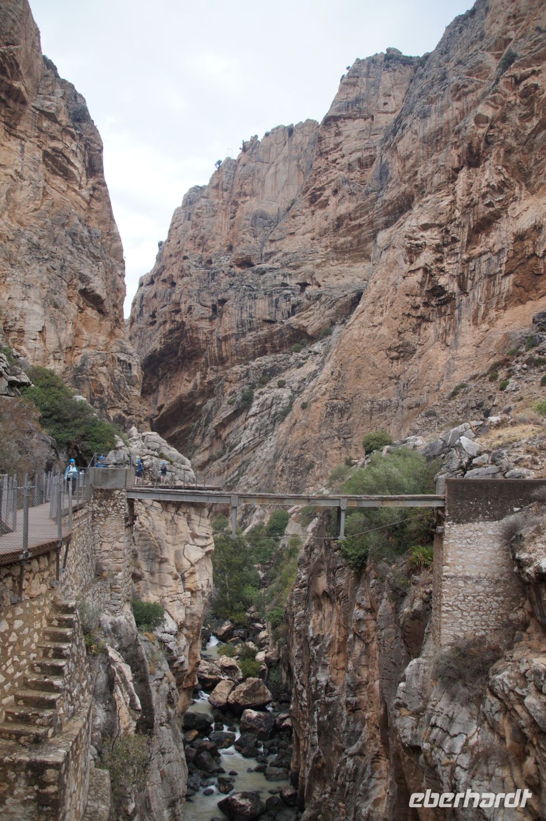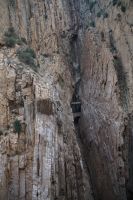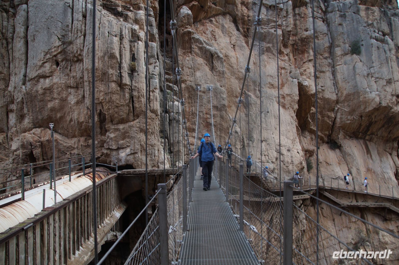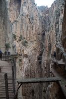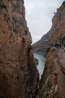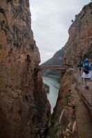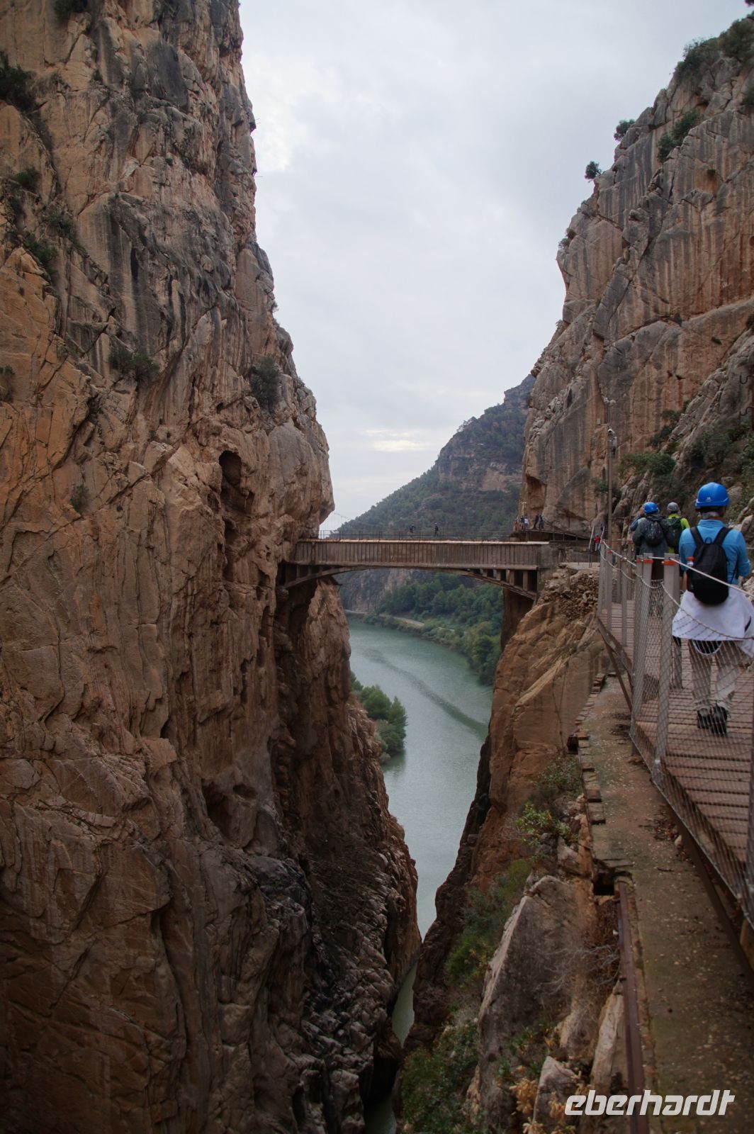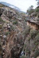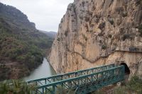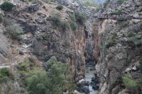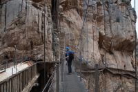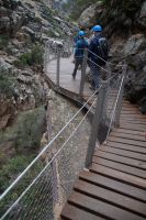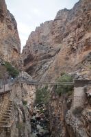Steilwände wechselten sich mit lieblicheren und baumbewachsenen Abschnitten ab, bis wir schließlich in der letzten Schlucht über eine Hängebrücke liefen, die durchaus nichts für Leute ist, die nicht schwindelfrei sind, obwohl man hier absolut sicher ist. Danach ließ man die Schlucht hinter sich, musste nur noch treppab und - auf gehen, bis man endgültig festen Boden unter den Füßen hatte, dann ging es bergab, dem Dorf el Chorro entgegen.