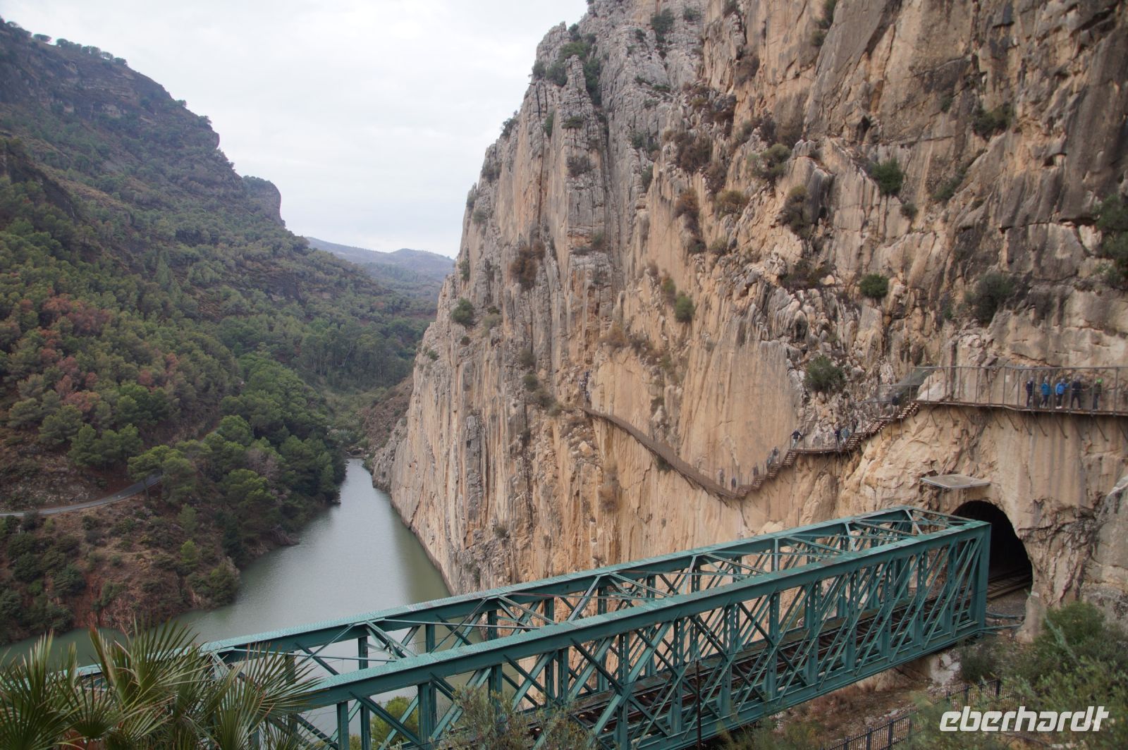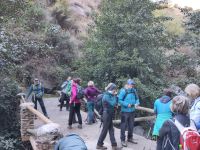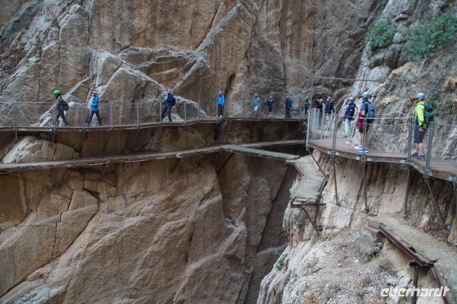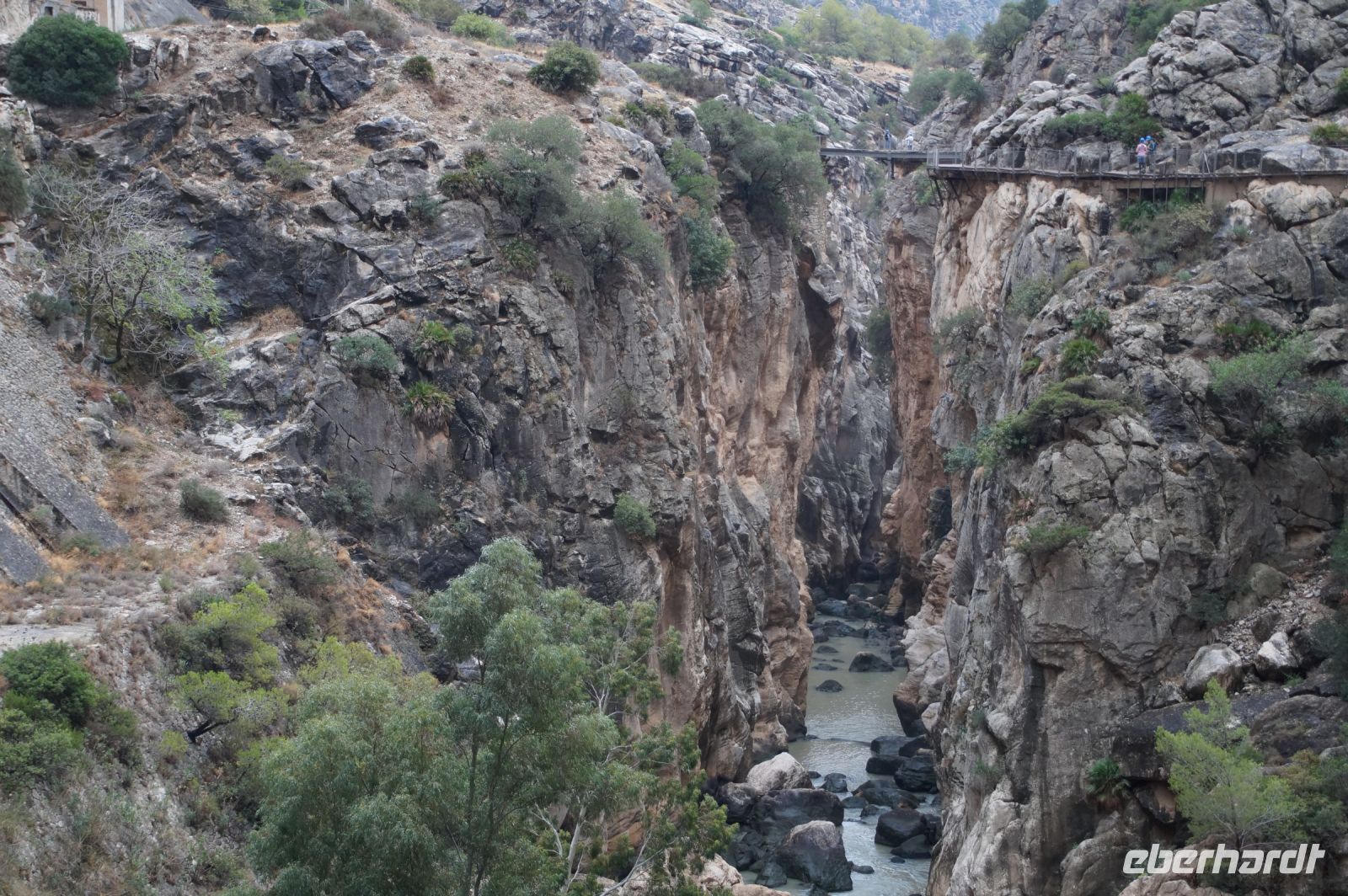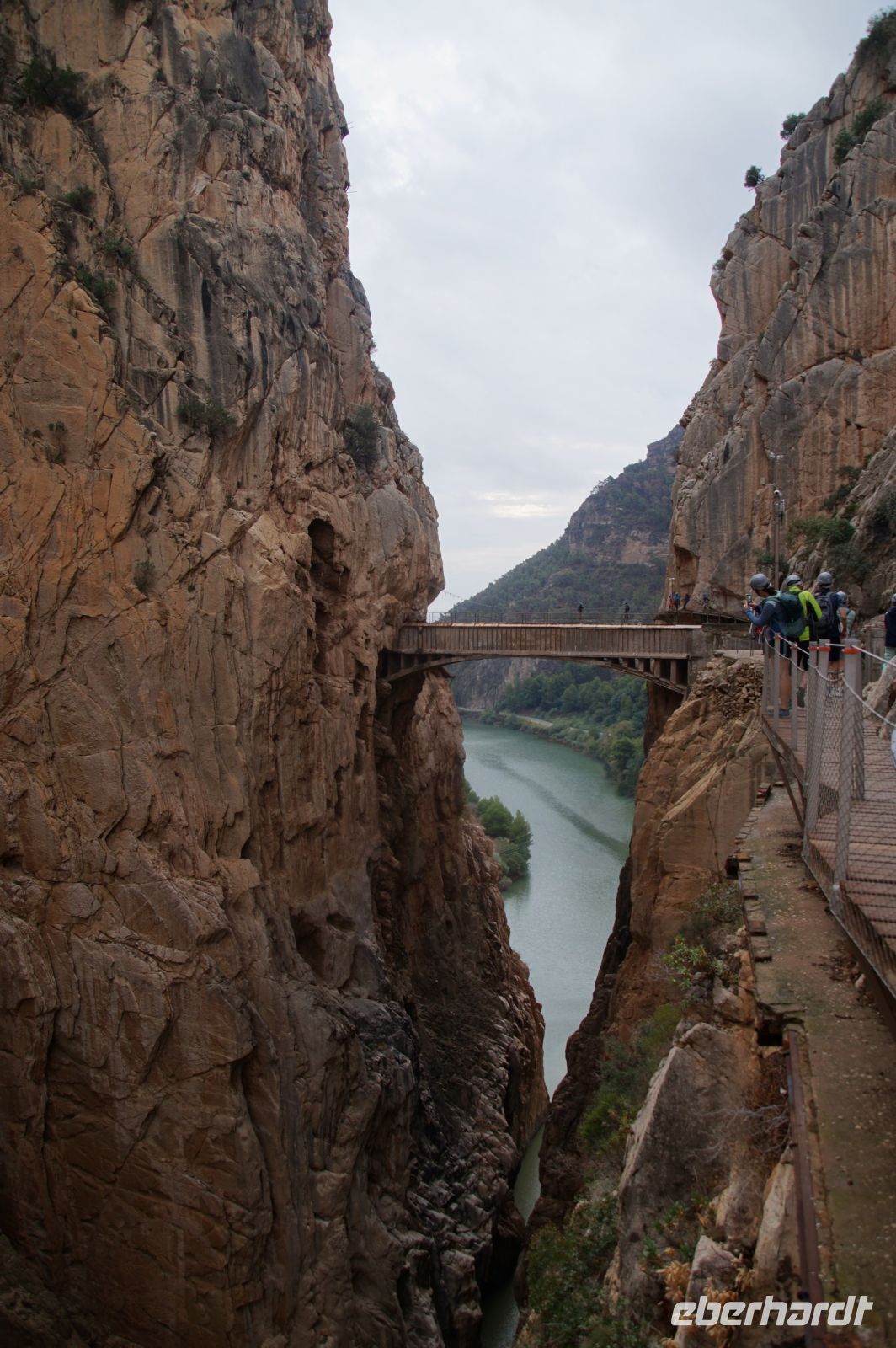 Steilwände wechselten sich mit lieblicheren und baumbewachsenen Abschnitten ab, bis wir schließlich in der letzten Schlucht über eine Hängebrücke liefen, die durchaus nichts für Leute ist, die nicht schwindelfrei sind, obwohl man hier absolut sicher ist. Danach ließ man die Schlucht hinter sich, musste nur noch treppab und - auf gehen, bis man endgültig festen Boden unter den Füßen hatte, dann ging es bergab, dem Dorf el Chorro entgegen.