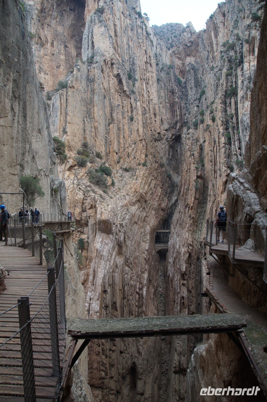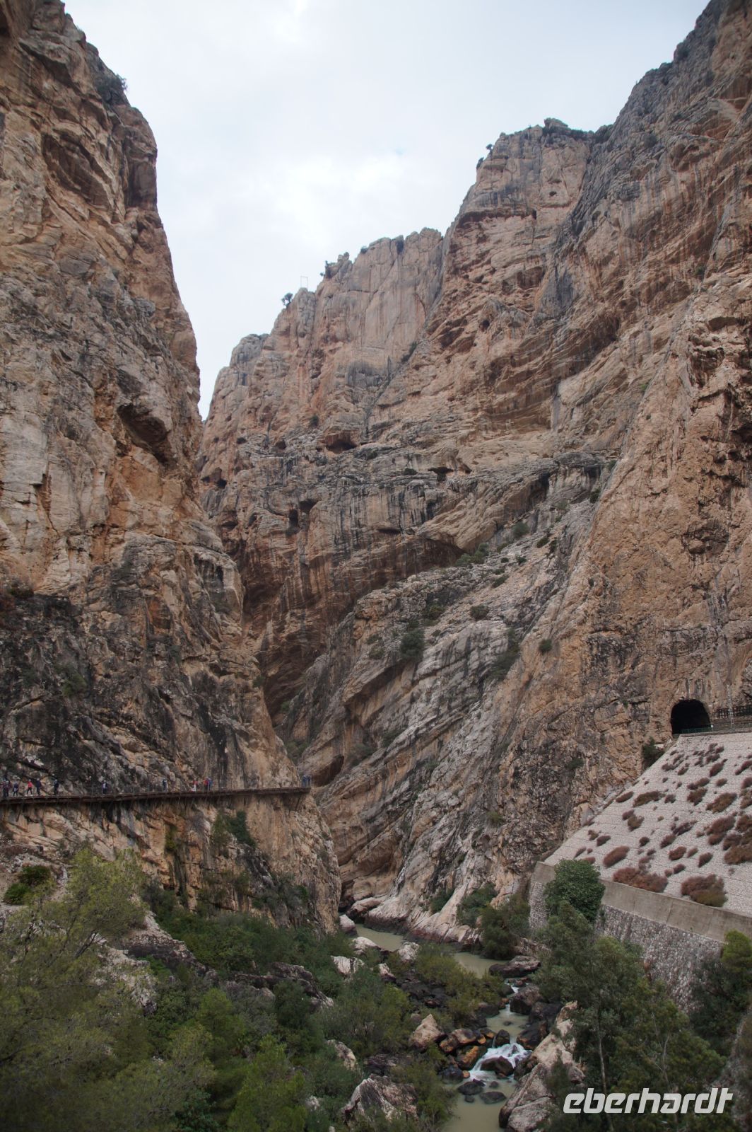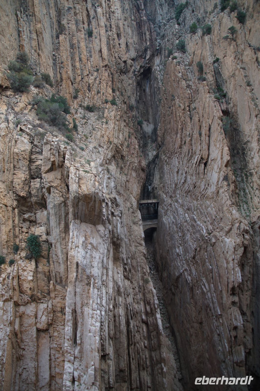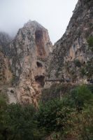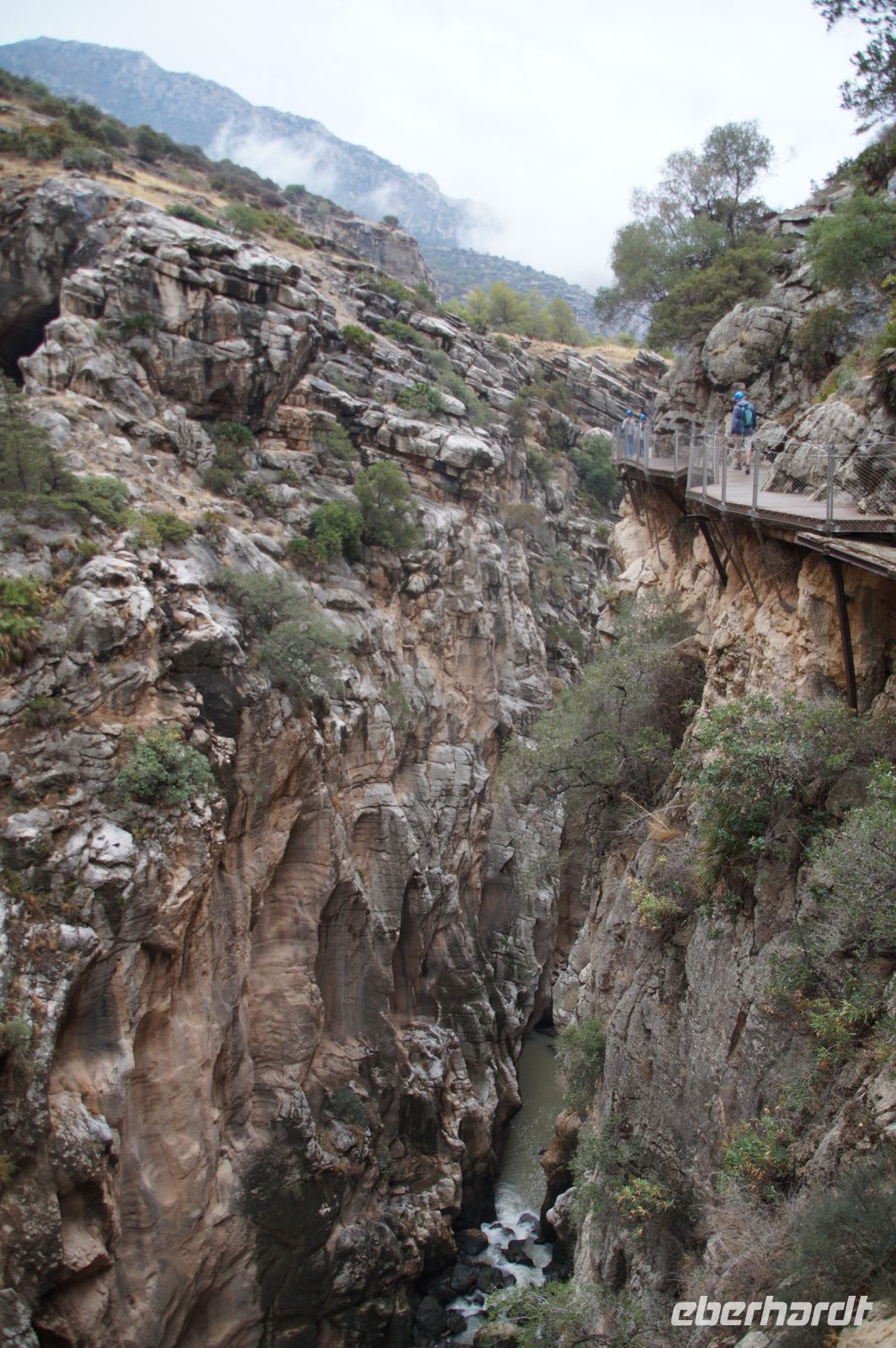 Steilwände wechselten sich mit lieblicheren und baumbewachsenen Abschnitten ab, bis wir schließlich in der letzten Schlucht über eine Hängebrücke liefen, die durchaus nichts für Leute ist, die nicht schwindelfrei sind, obwohl man hier absolut sicher ist. Danach ließ man die Schlucht hinter sich, musste nur noch treppab und - auf gehen, bis man endgültig festen Boden unter den Füßen hatte, dann ging es bergab, dem Dorf el Chorro entgegen.